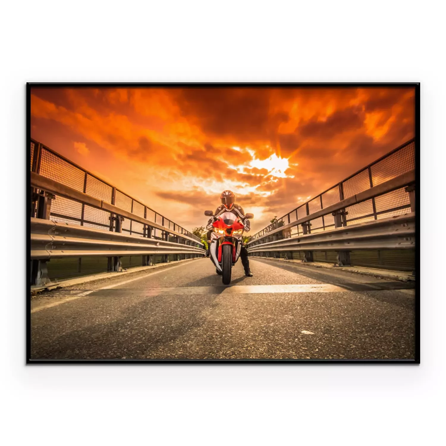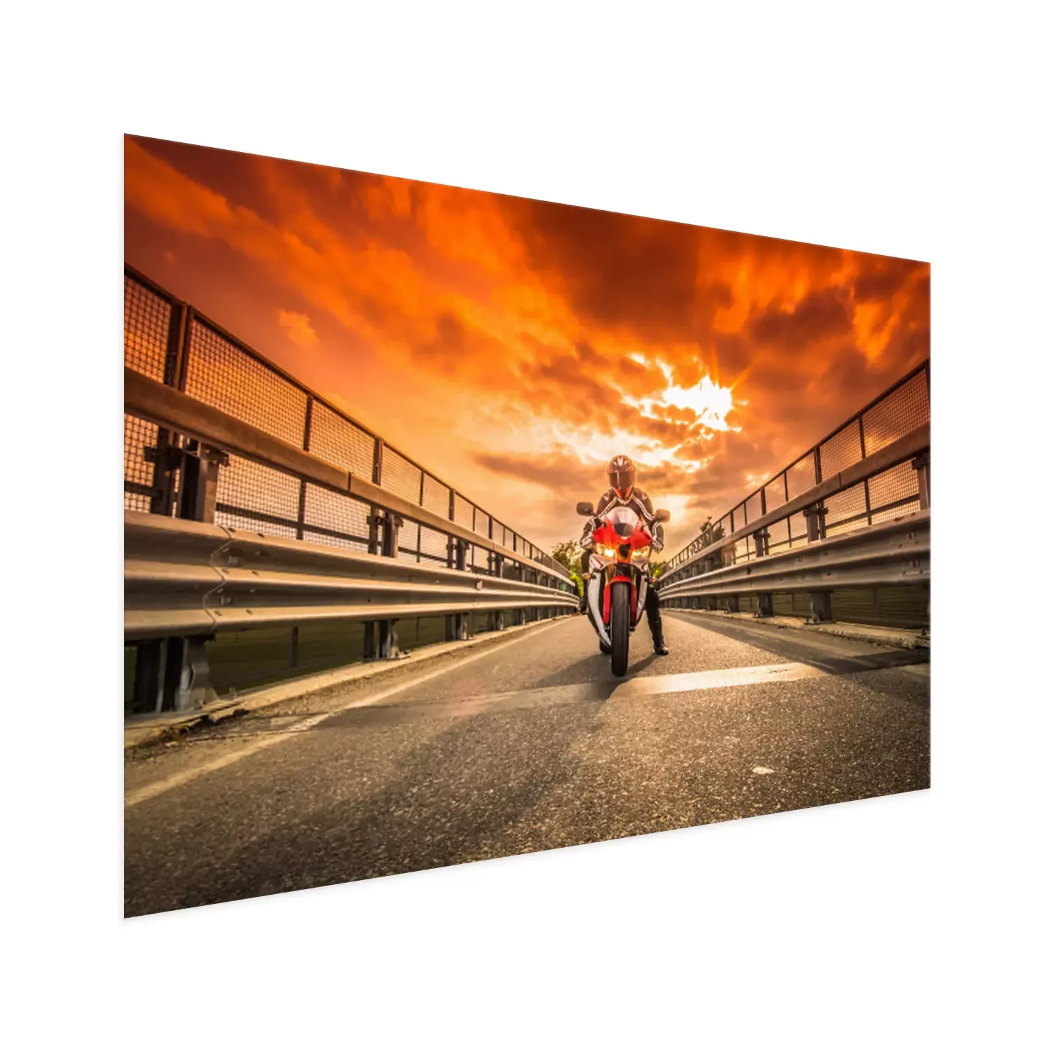 Poster Moto da strada pronta alla partenza sotto un cielo rosso al tramonto