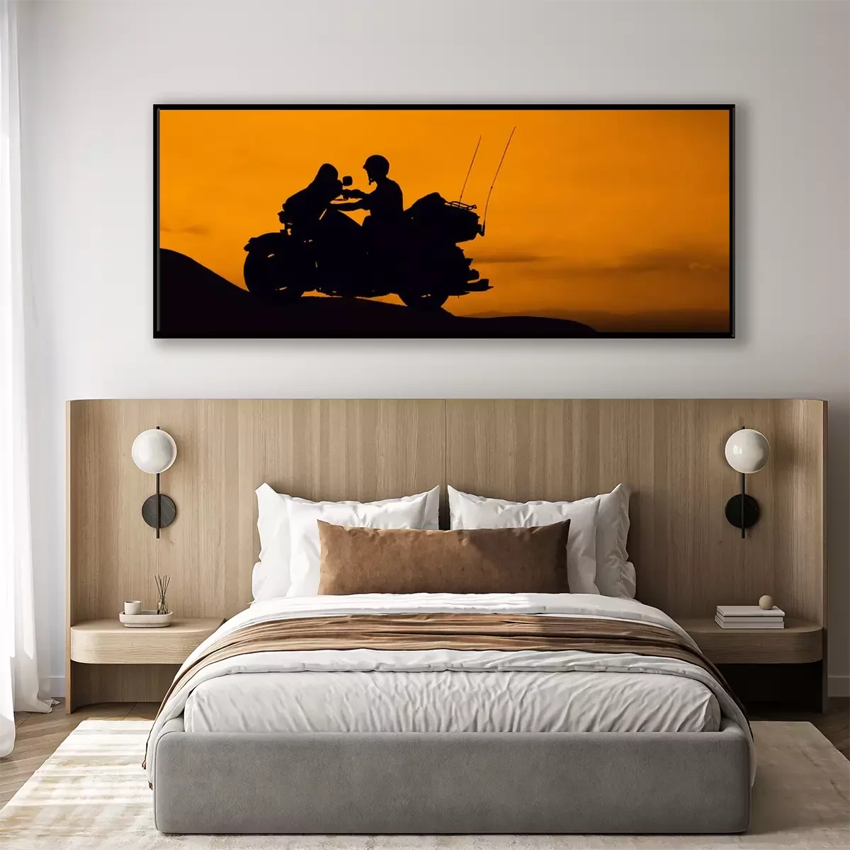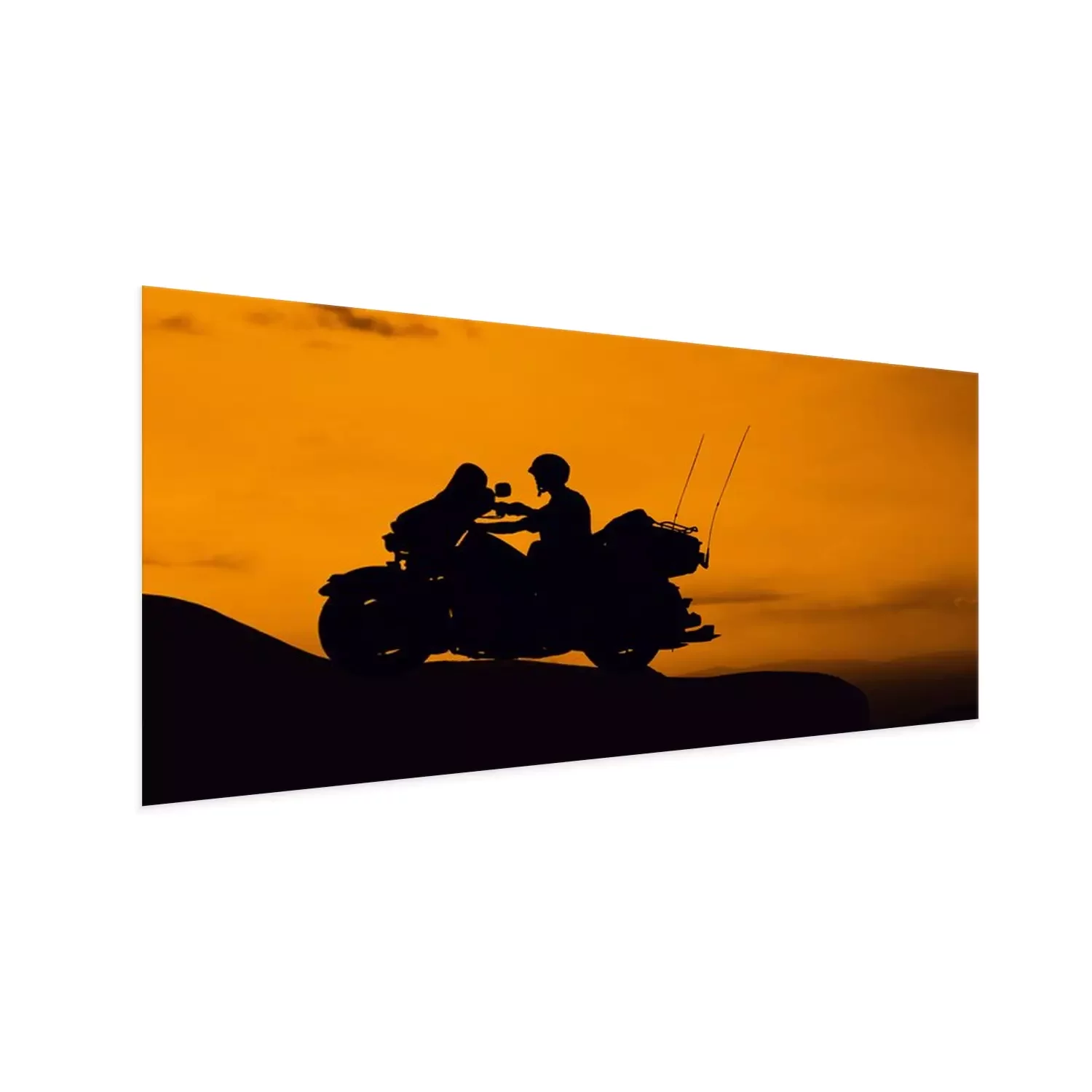 Poster: Motorradfahrer und Sonnenuntergang Hintergrund