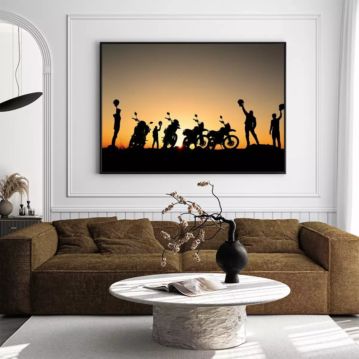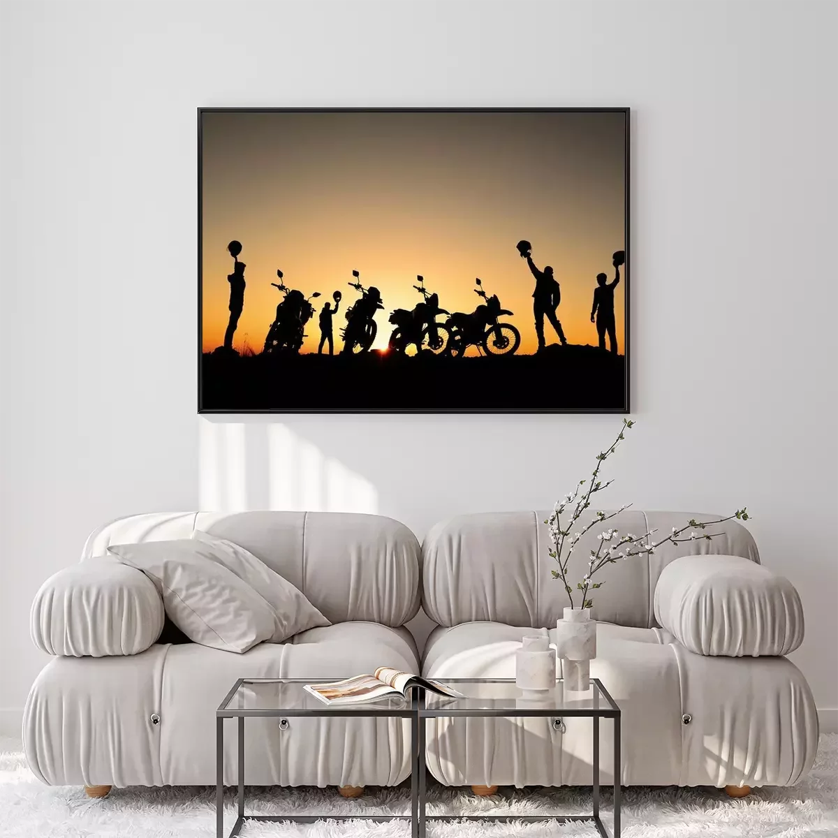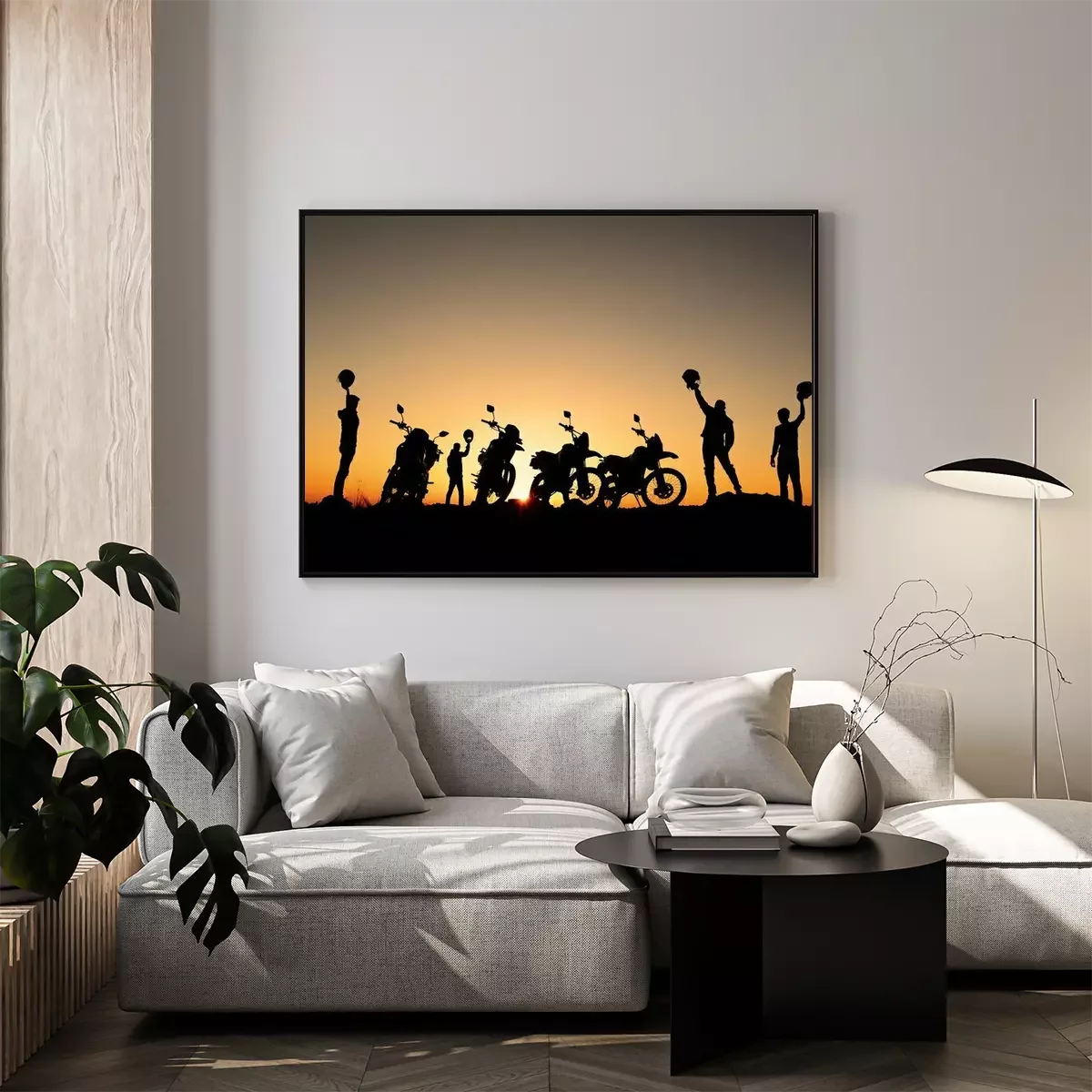 Motorradfahrer und Motorräder bei Sonnenuntergang