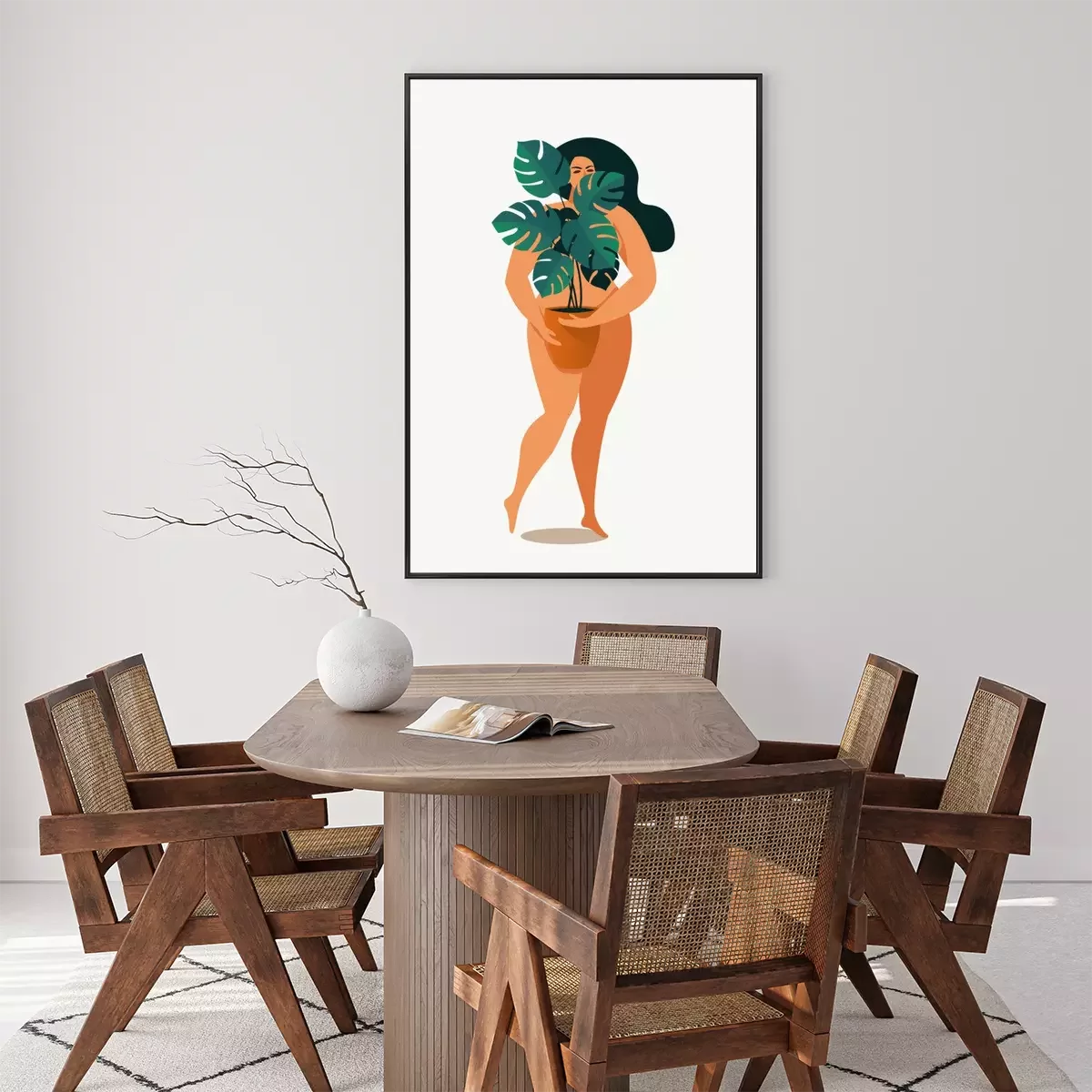Poster: Nackte Frau, die ihren Körper mit Monstera-Blättern bedeckt