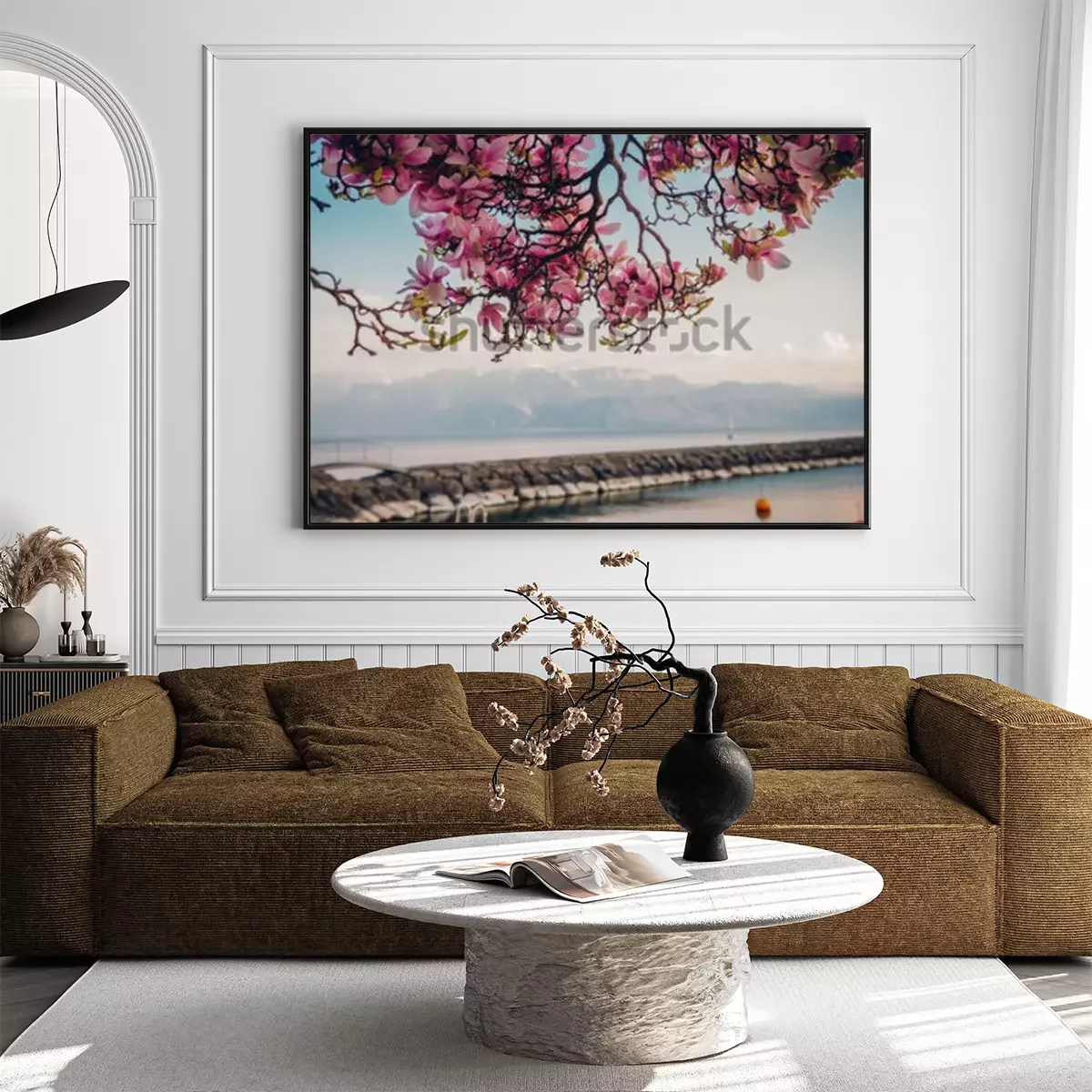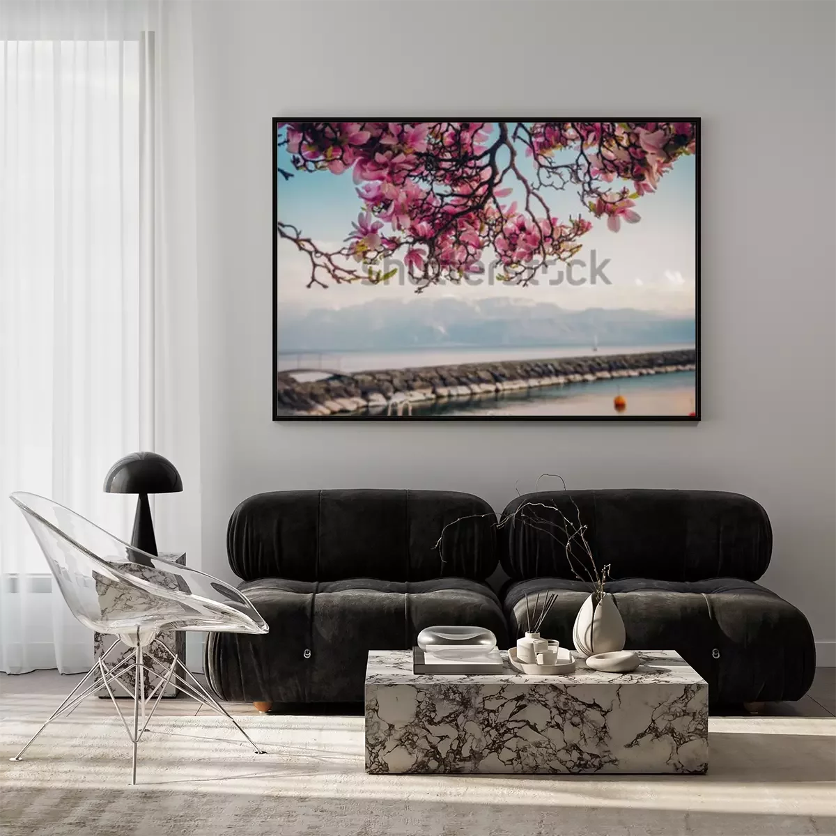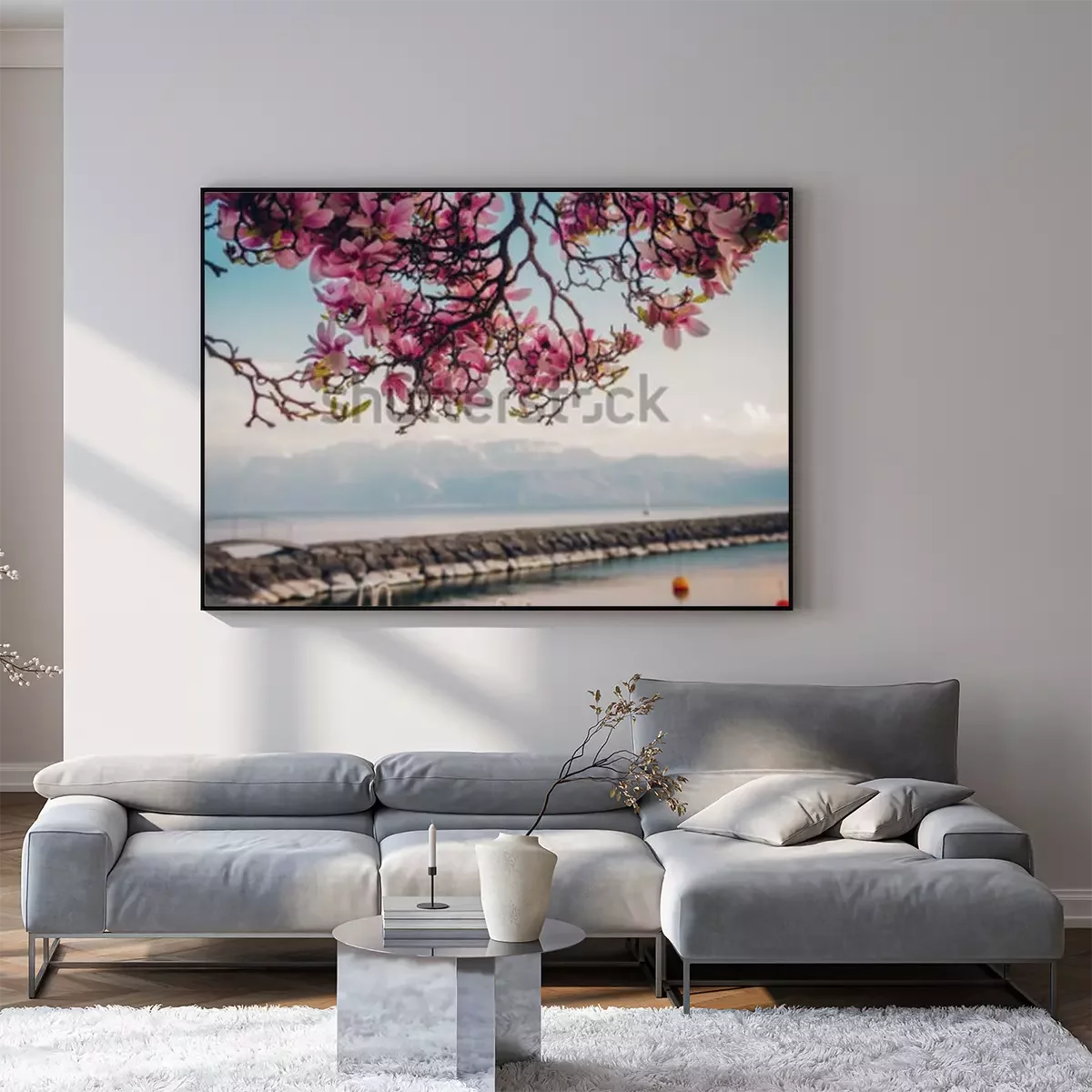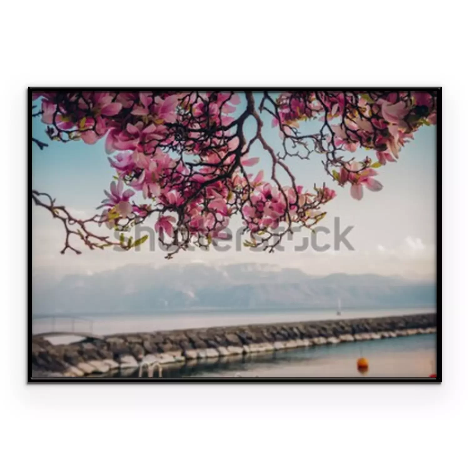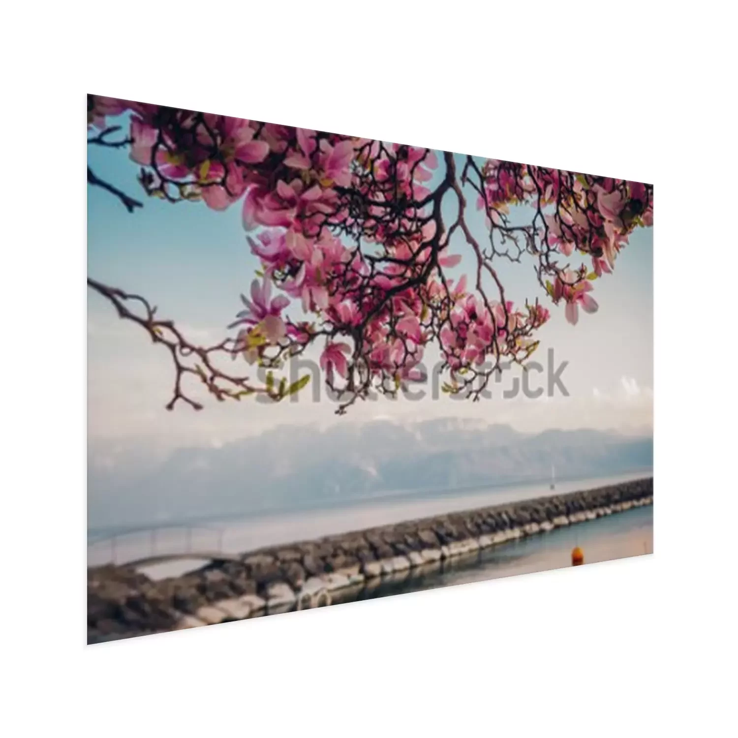 Poster Natur Berge blühend auf dem Hintergrund von Wasser