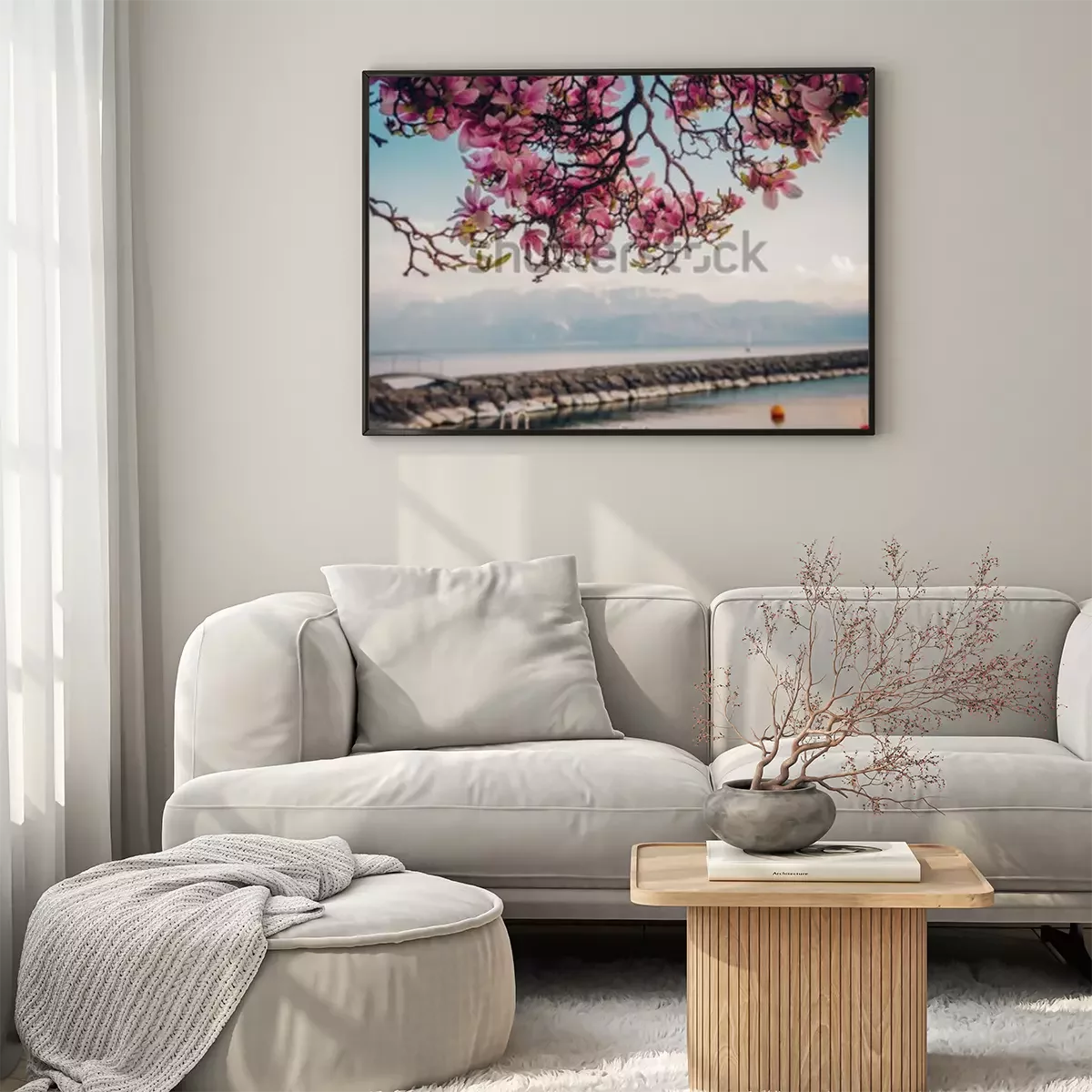 Poster: Natur Berge blühend auf dem Hintergrund von Wasser