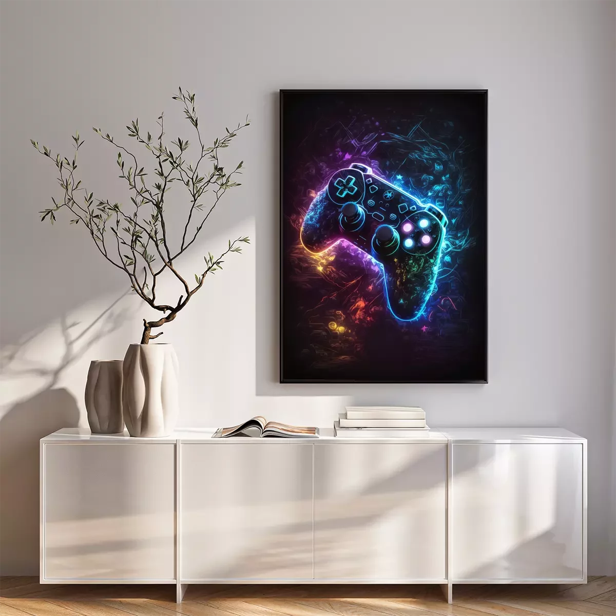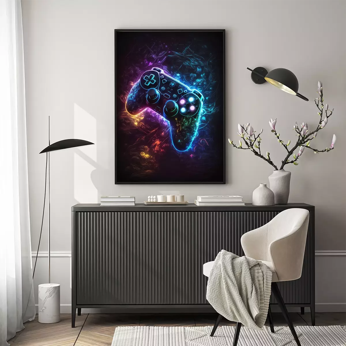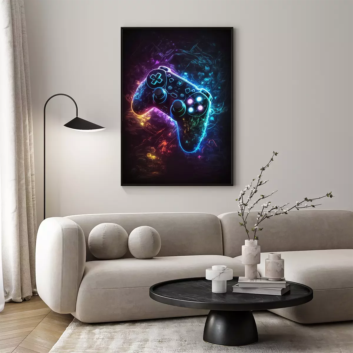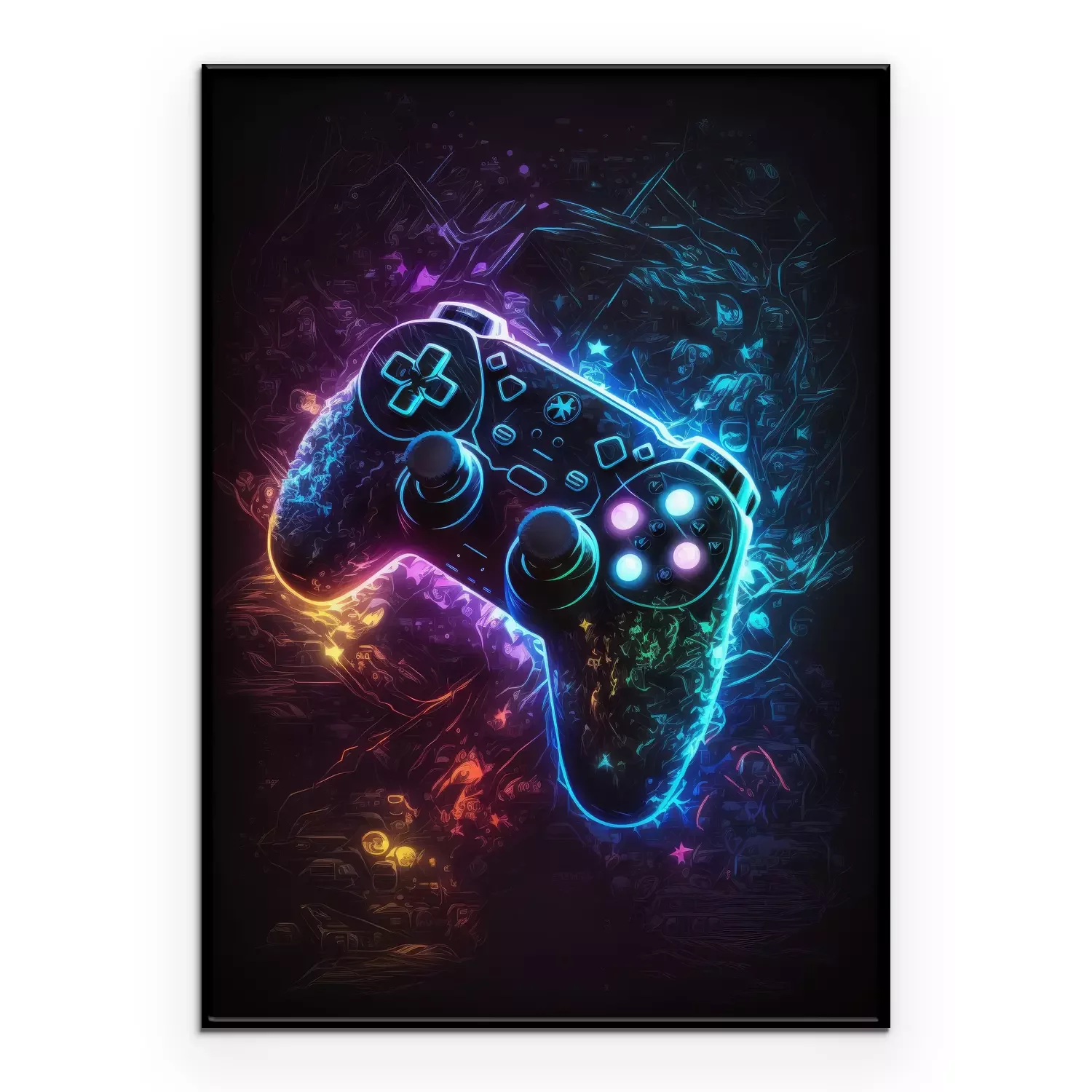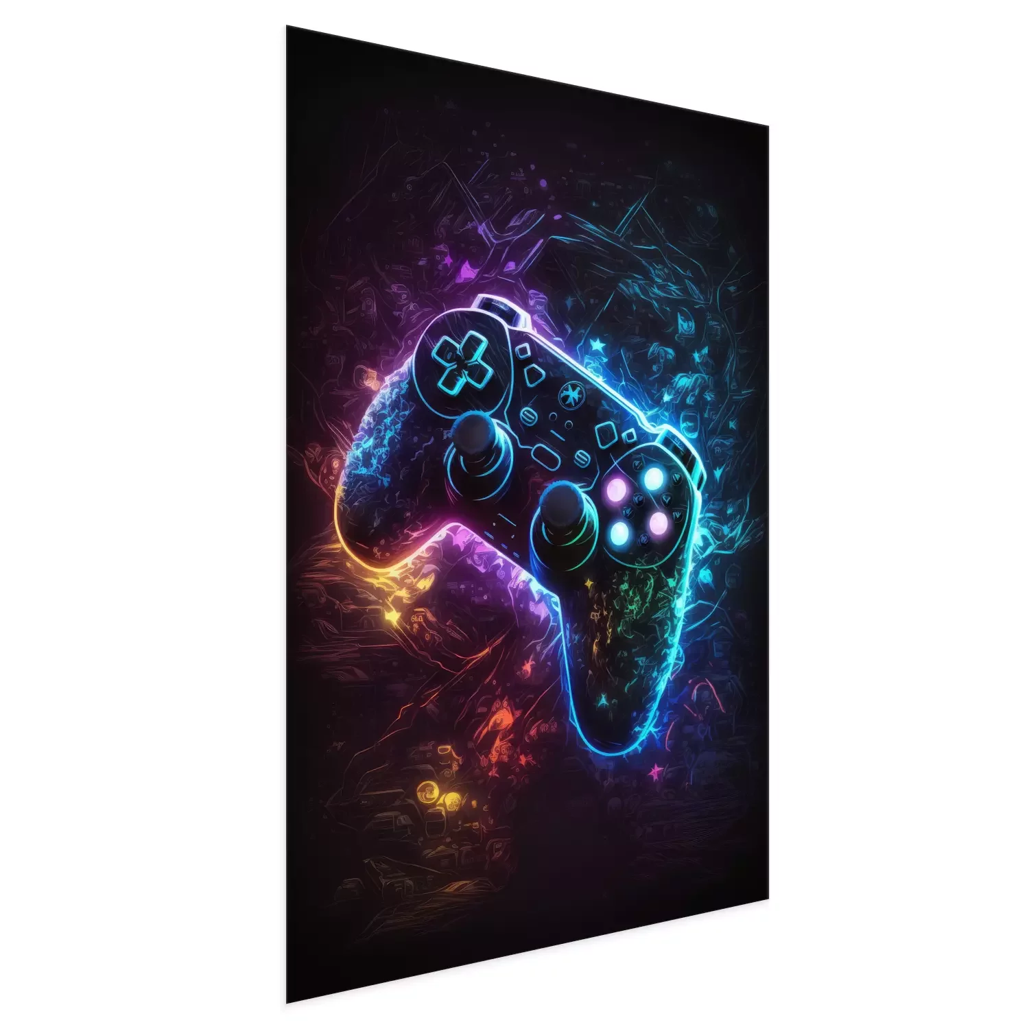 Poster: Neon-Spielecontroller auf schwarzem Hintergrund