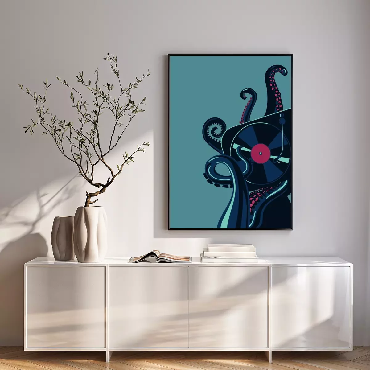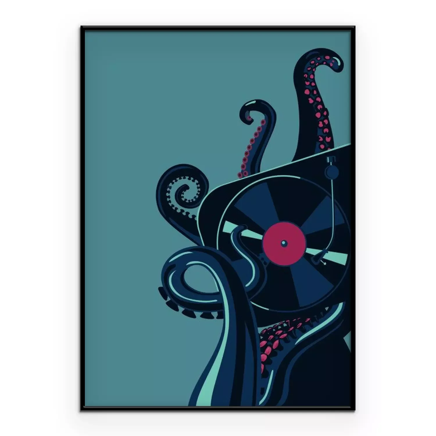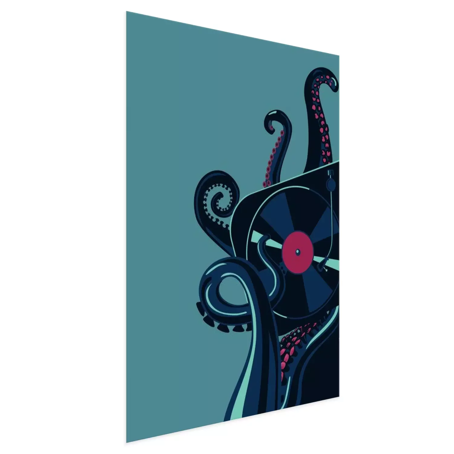 Poster: Octopus Tentakeln mit Vinyl-Plattenspieler. Partyplakatvorlage.