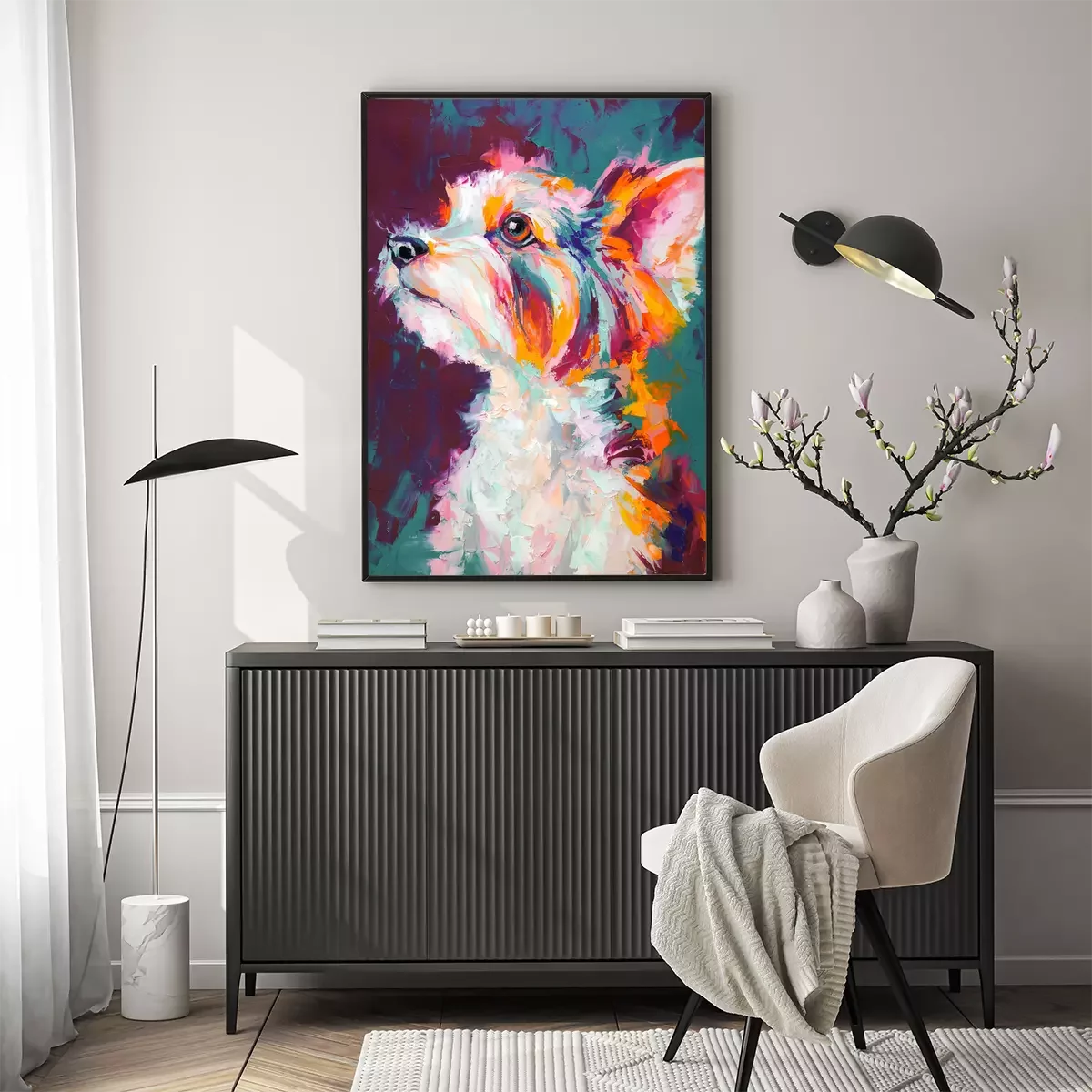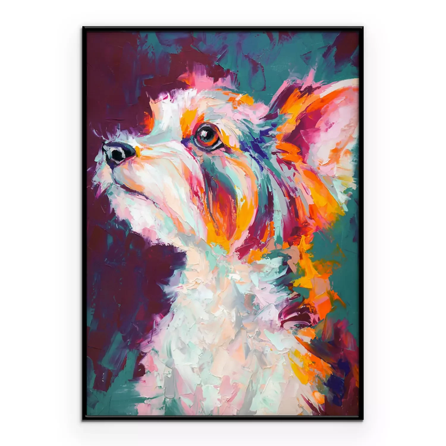 Poster: Oil dog portrait painting in multicolored tones. Conceptual abstract painting of a biewer terrier muzzle. Closeup of a painting by oil and palette knife on canvas.