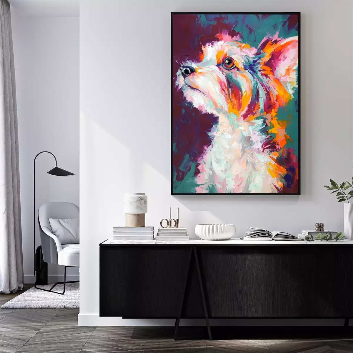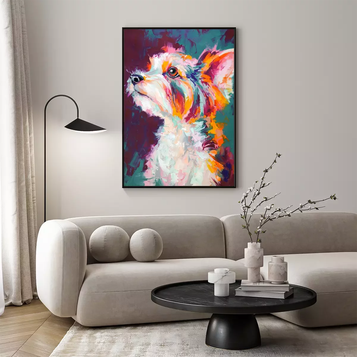 Poster Oil dog portrait painting in multicolored tones. Conceptual abstract painting of a biewer terrier muzzle. Closeup of a painting by oil and palette knife on canvas.