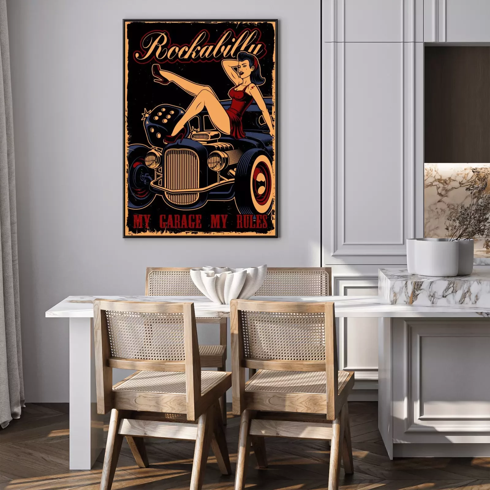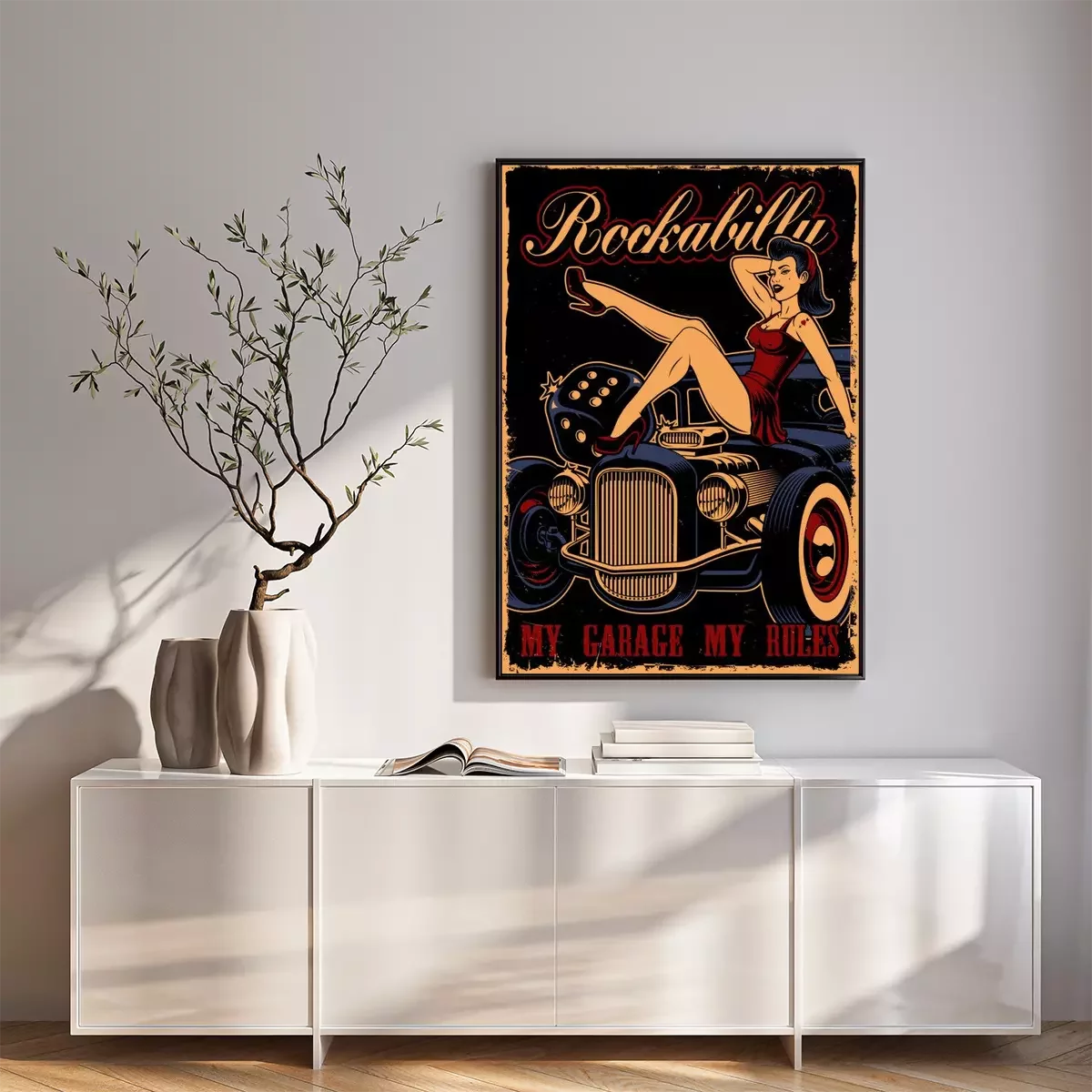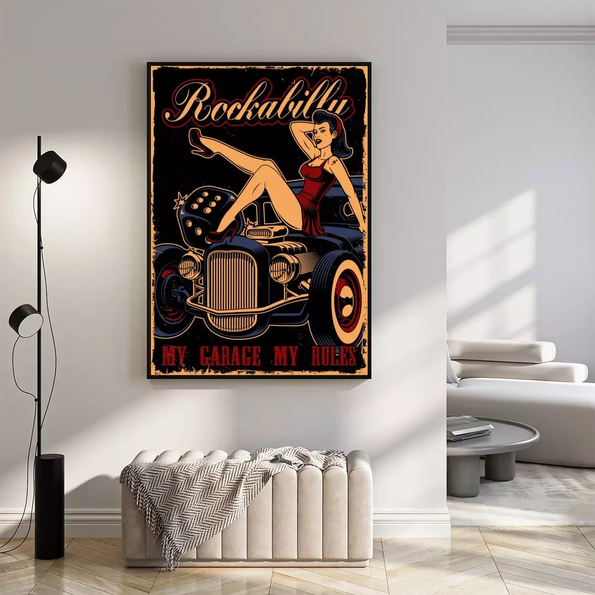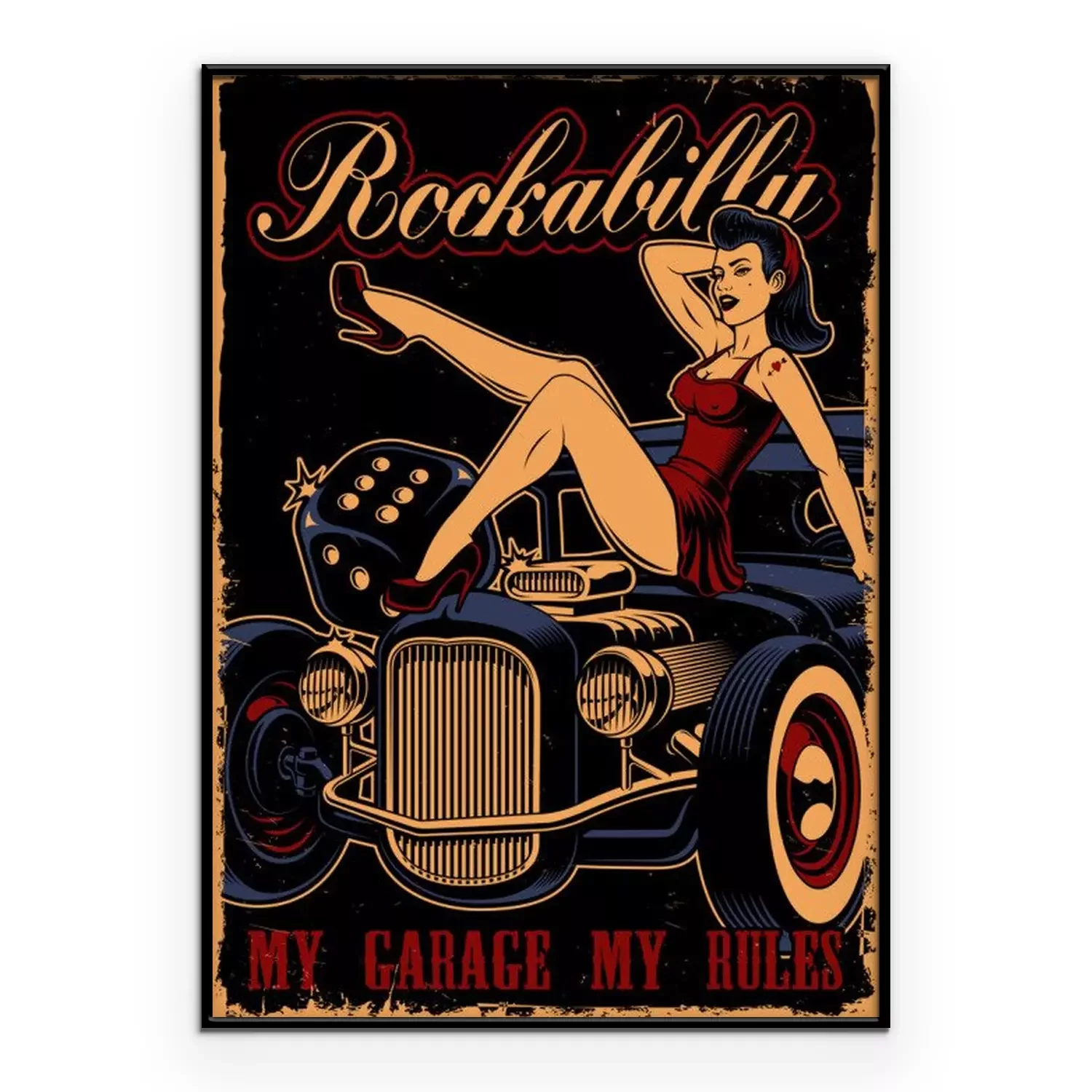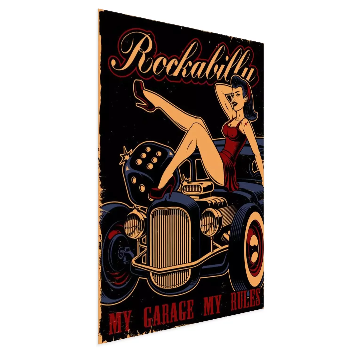 Poster: Oldtimer und Mädchen im Pin-Up-Stil