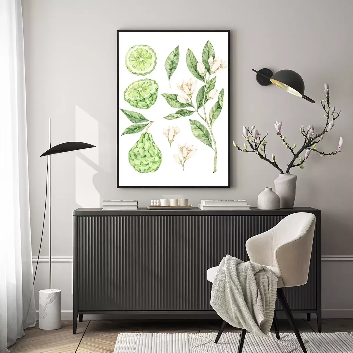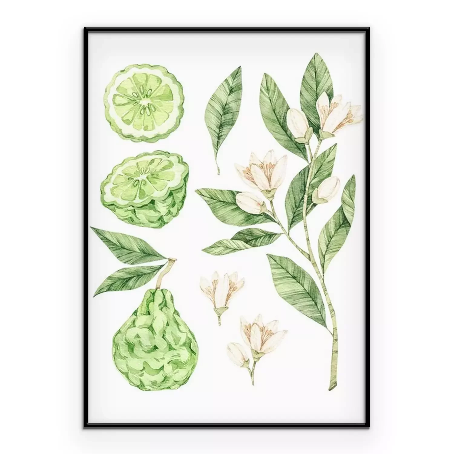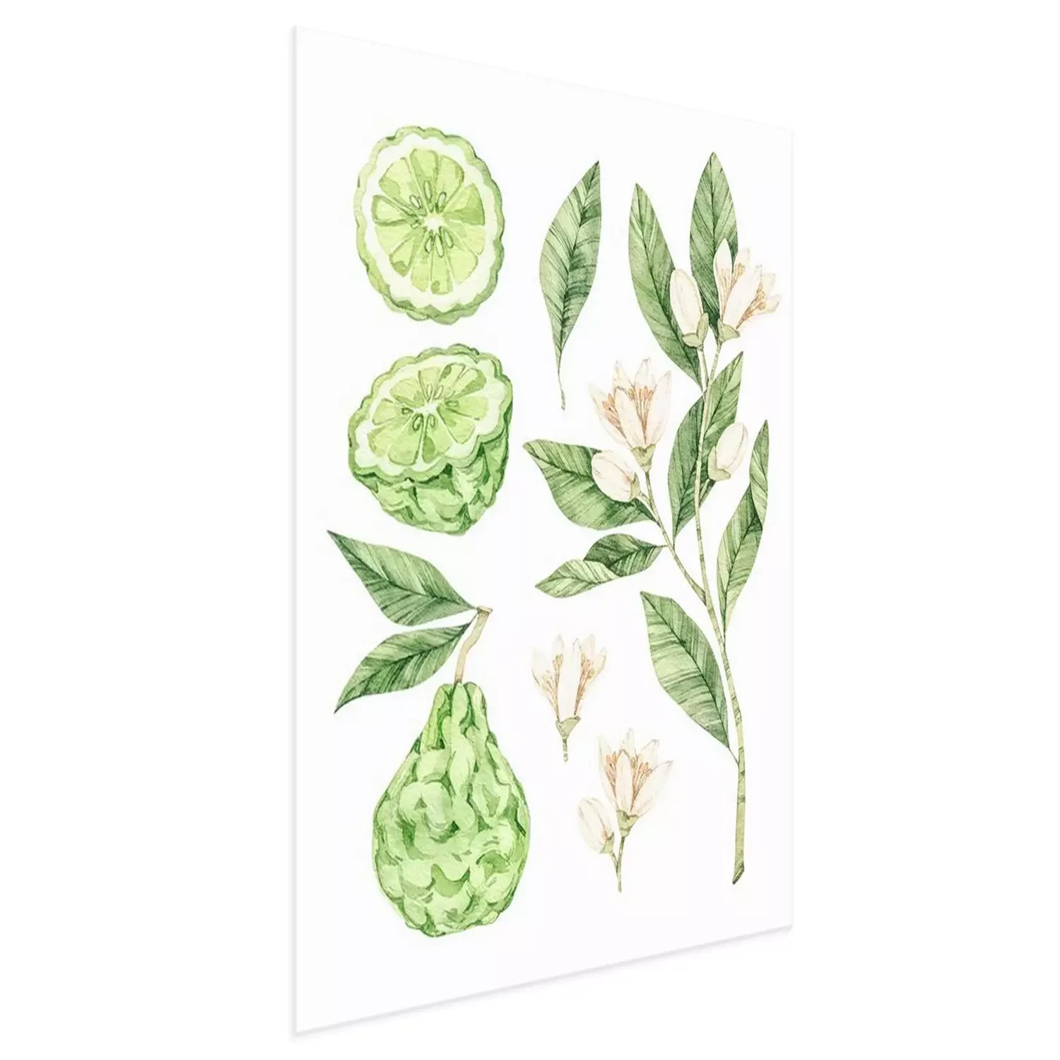 Poster Orangefarbene Bergamotte Früchte Blüten und Blätter