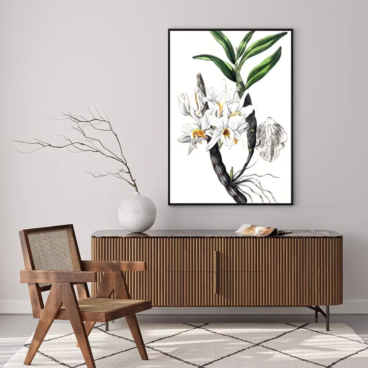 Poster Orchidee mit gelber Mitte auf grünem Stiel