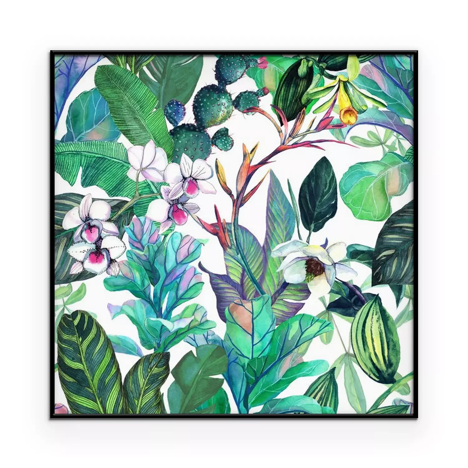 Seamless pattern with tropical leaves and flowers. watercolor pattern with a magnolia flower, orchids, cactus, white orchid phalinopsis. Botanical background