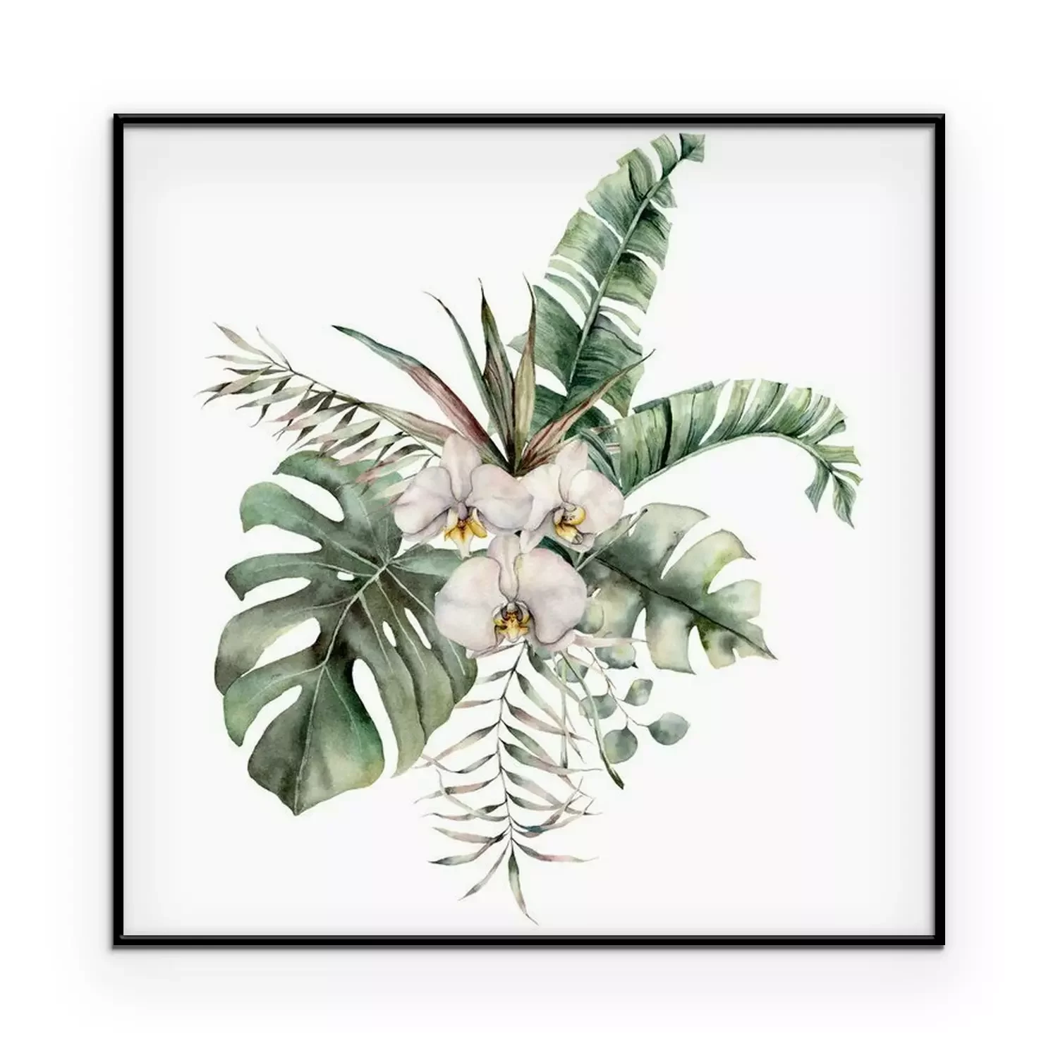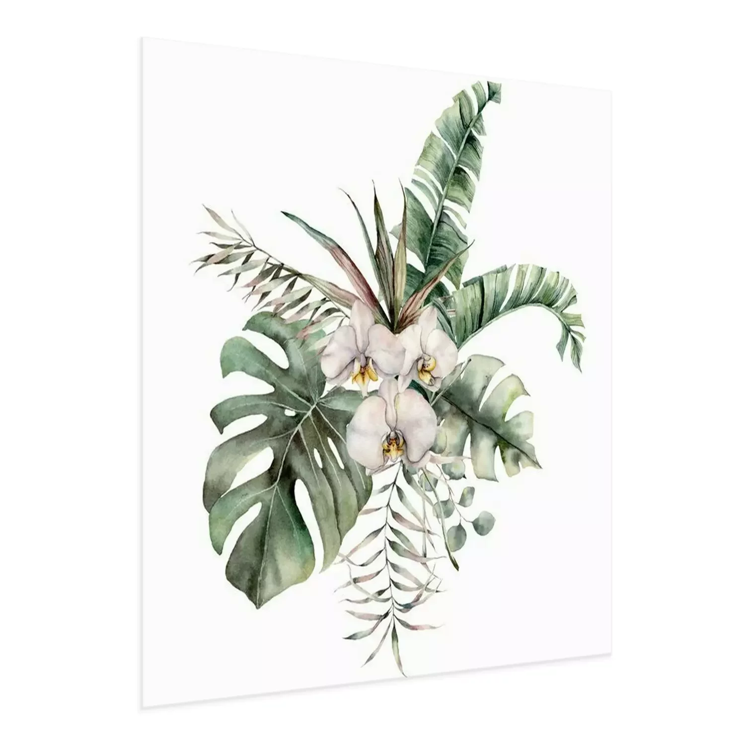 Poster: Orchidee weiß vor dem Hintergrund exotischer Blätter