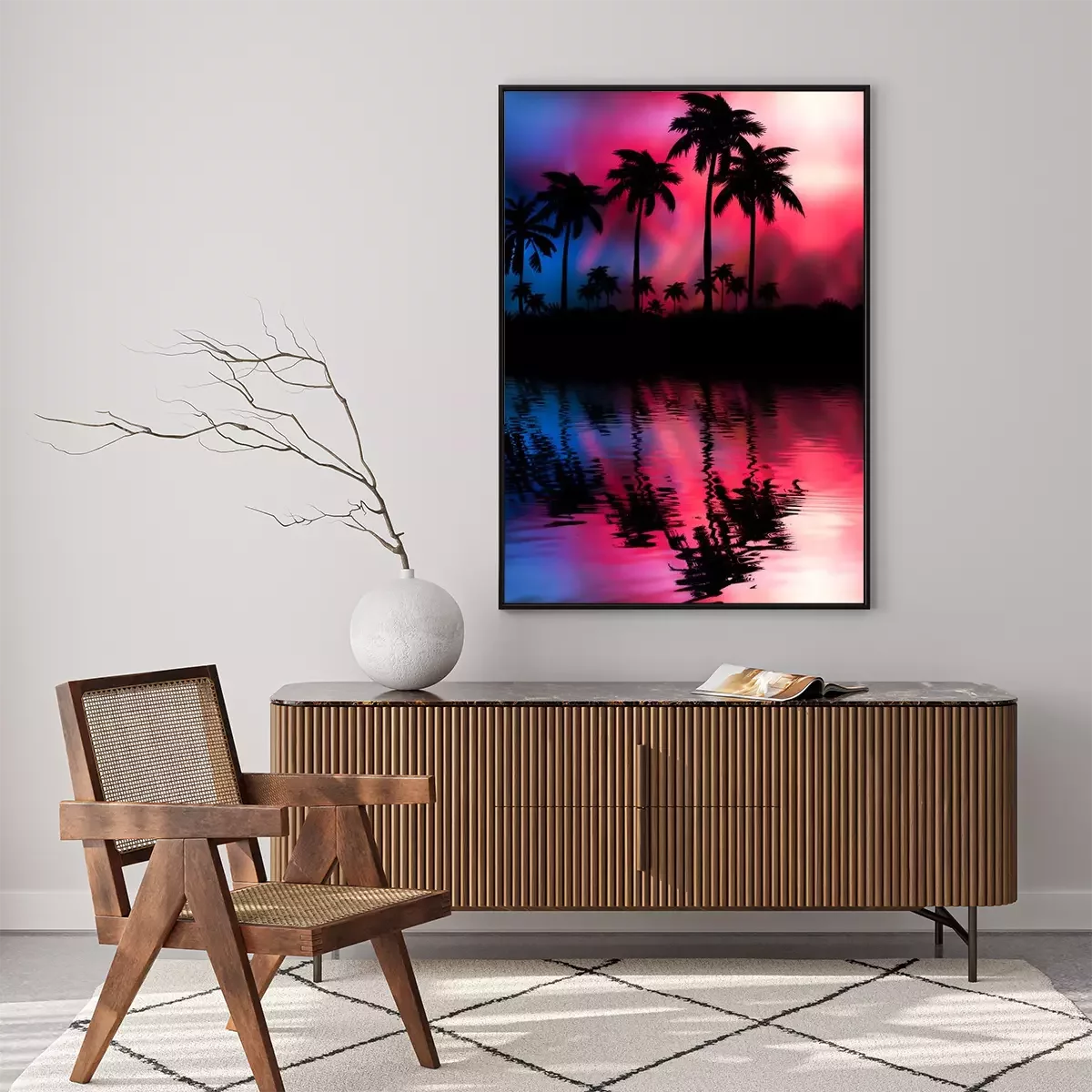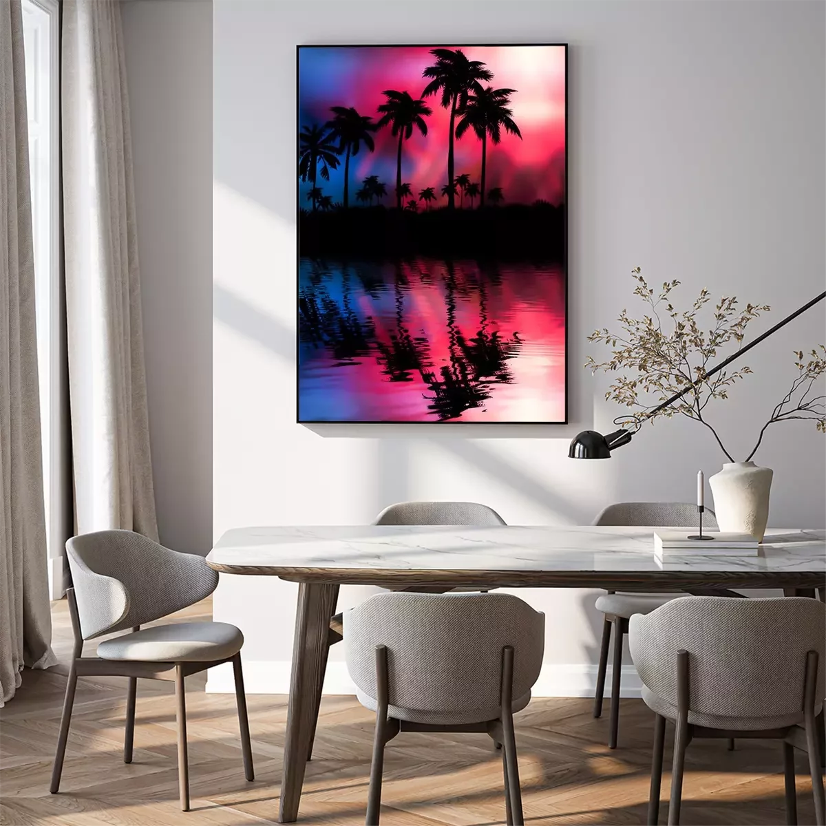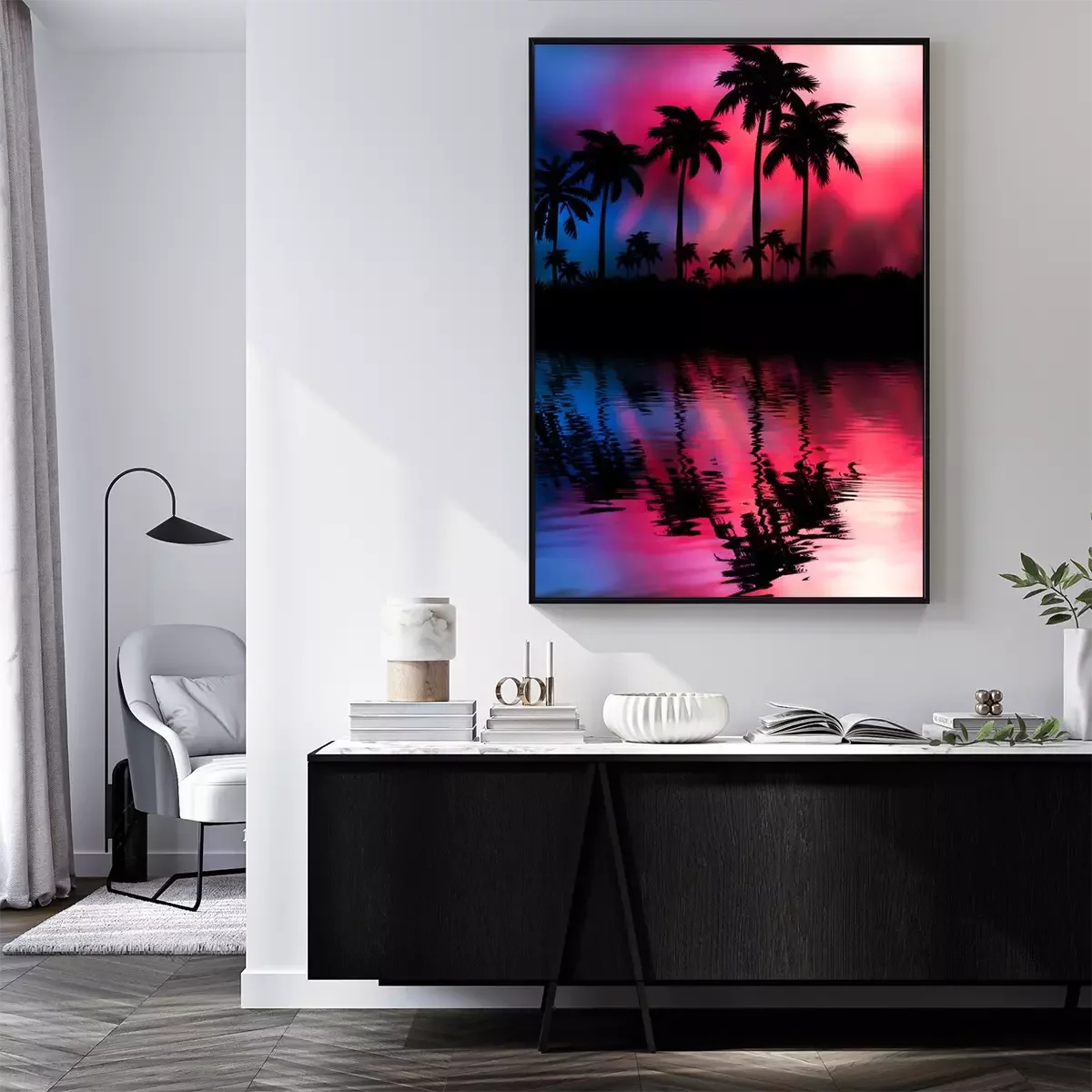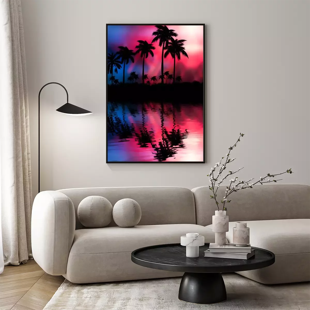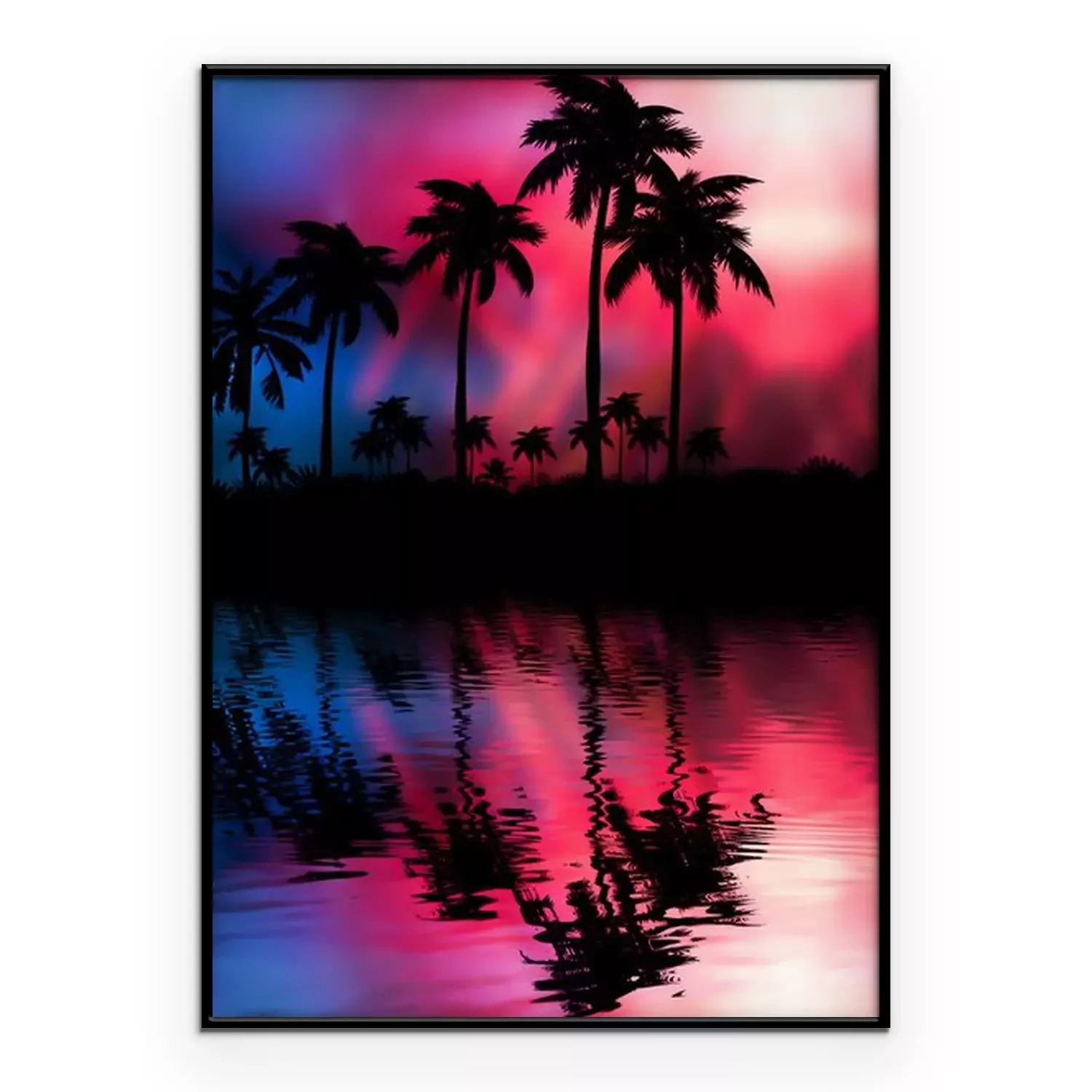 Poster: Palmen auf rosa Hintergrund am Wasser