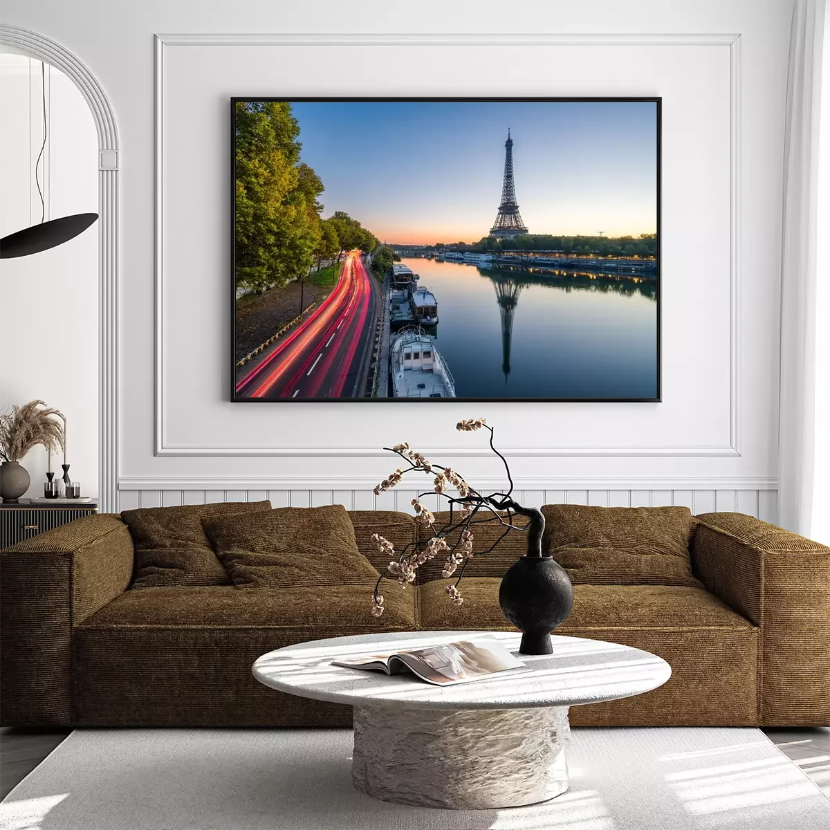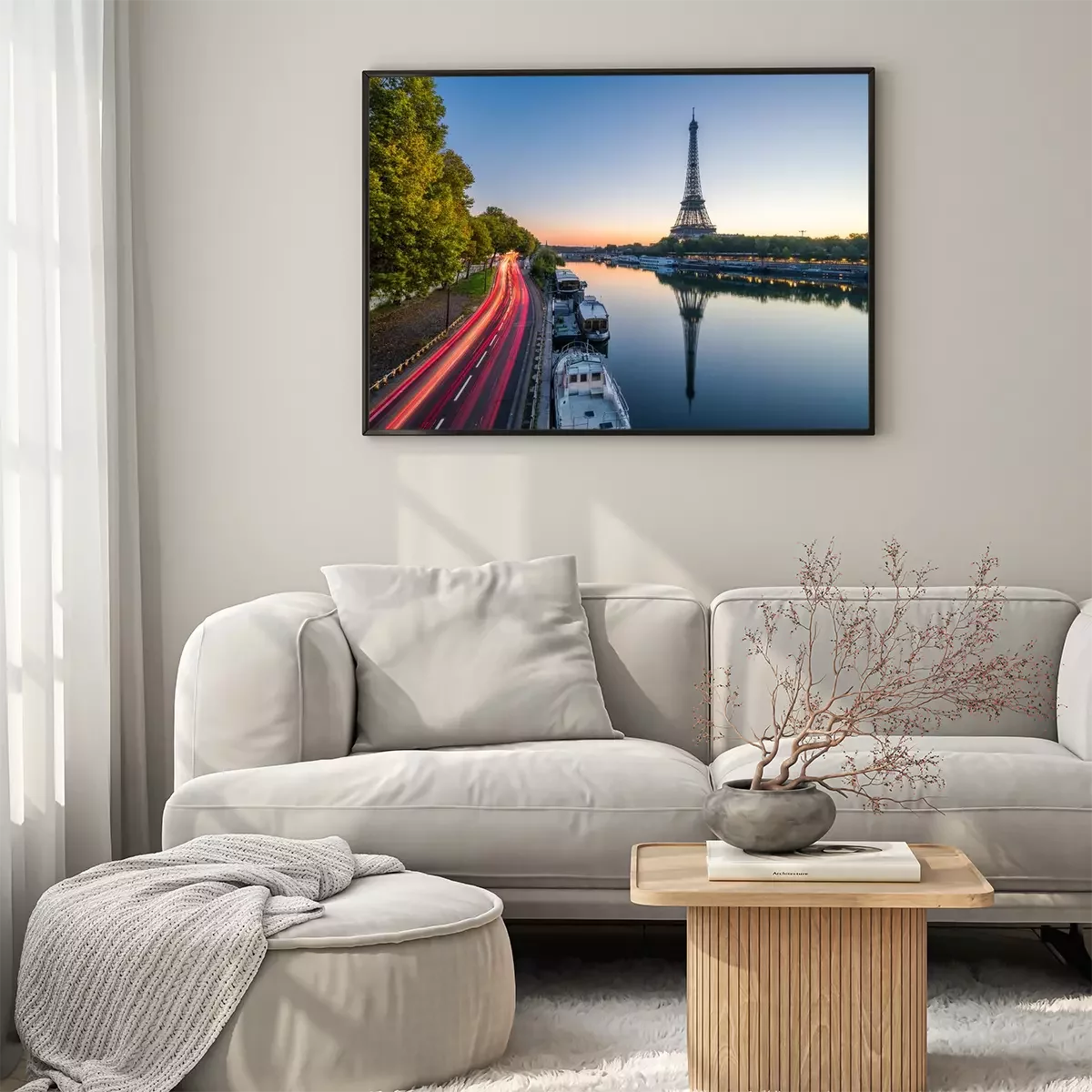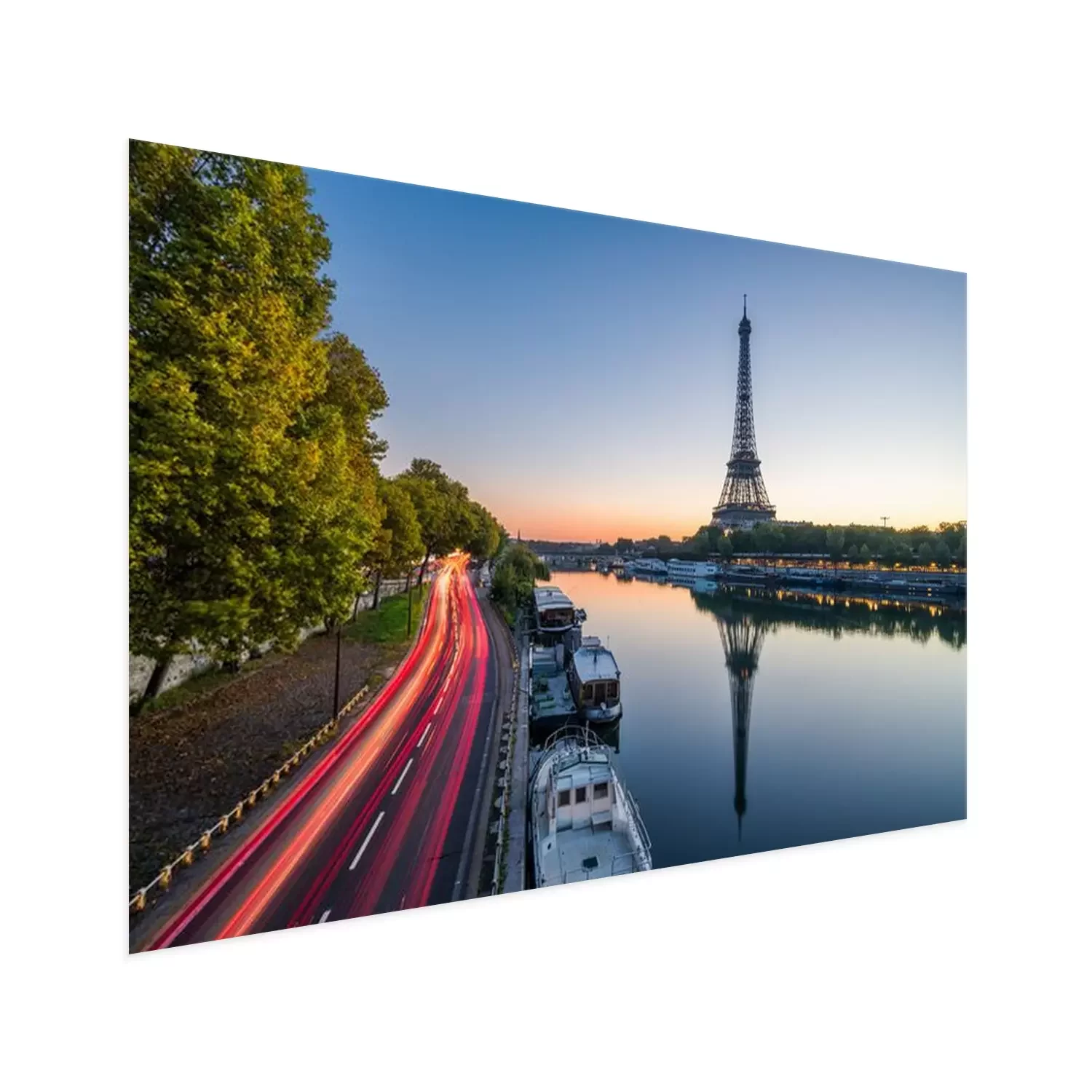 Der Eiffelturm vor klarem Himmel bei Sonnenaufgang