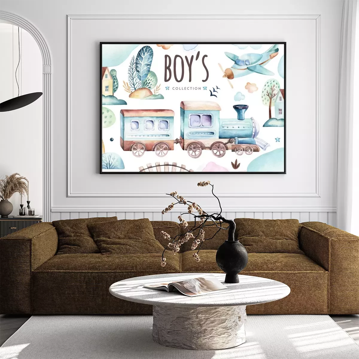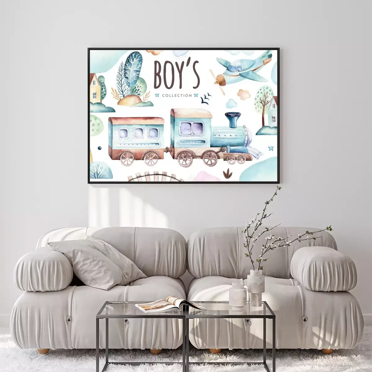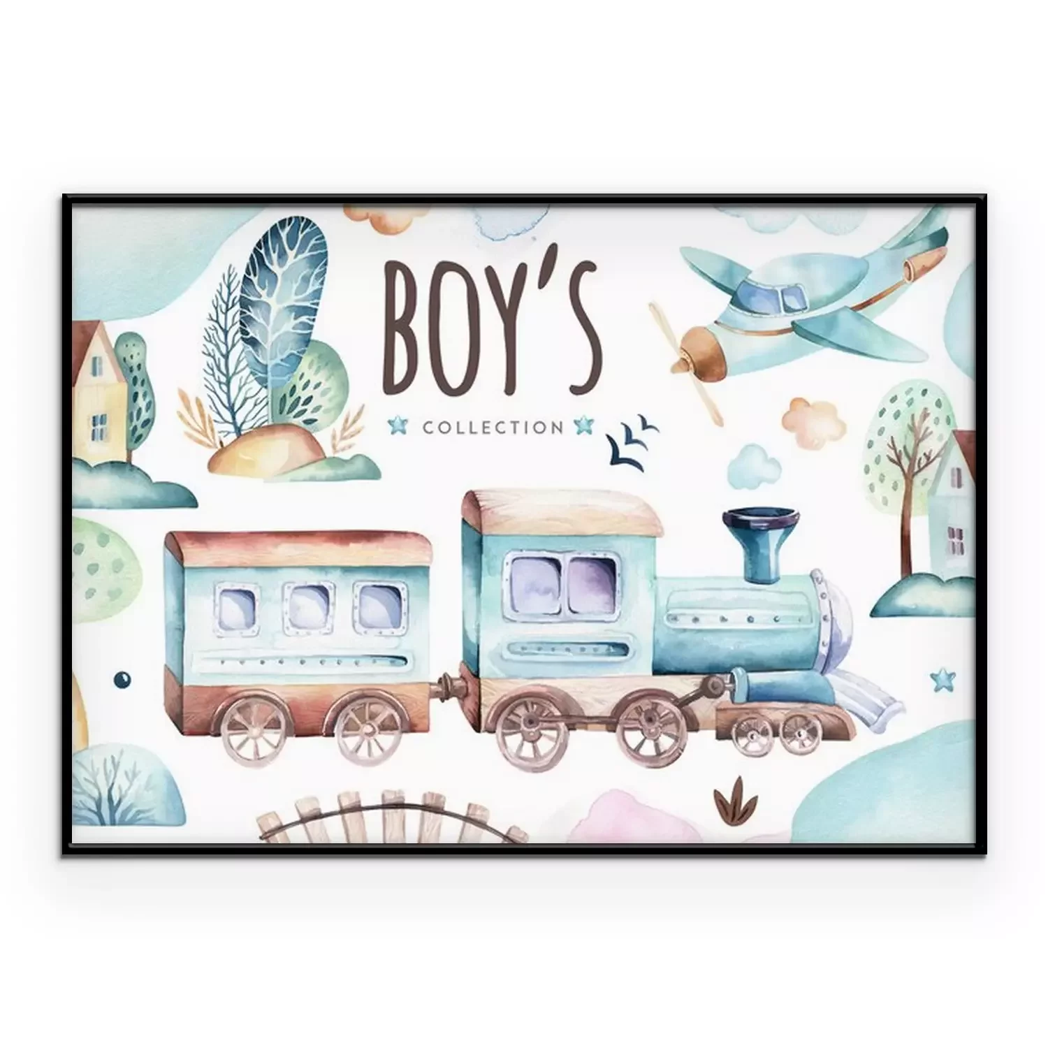 Poster: Pastellfarbener Zug und Flugzeug vor dem Hintergrund von Häusern
