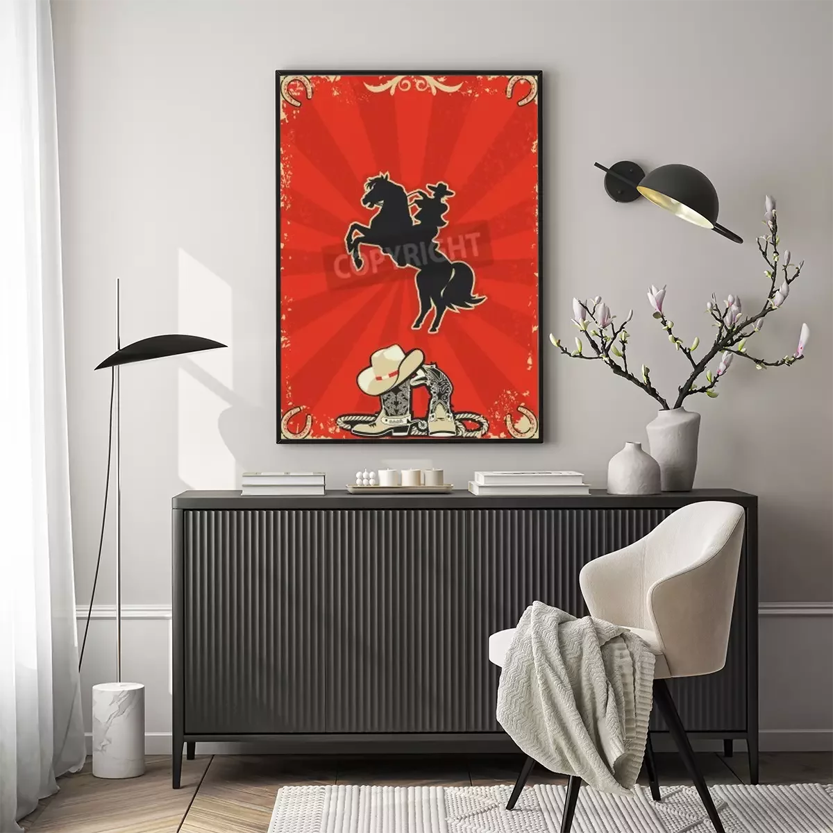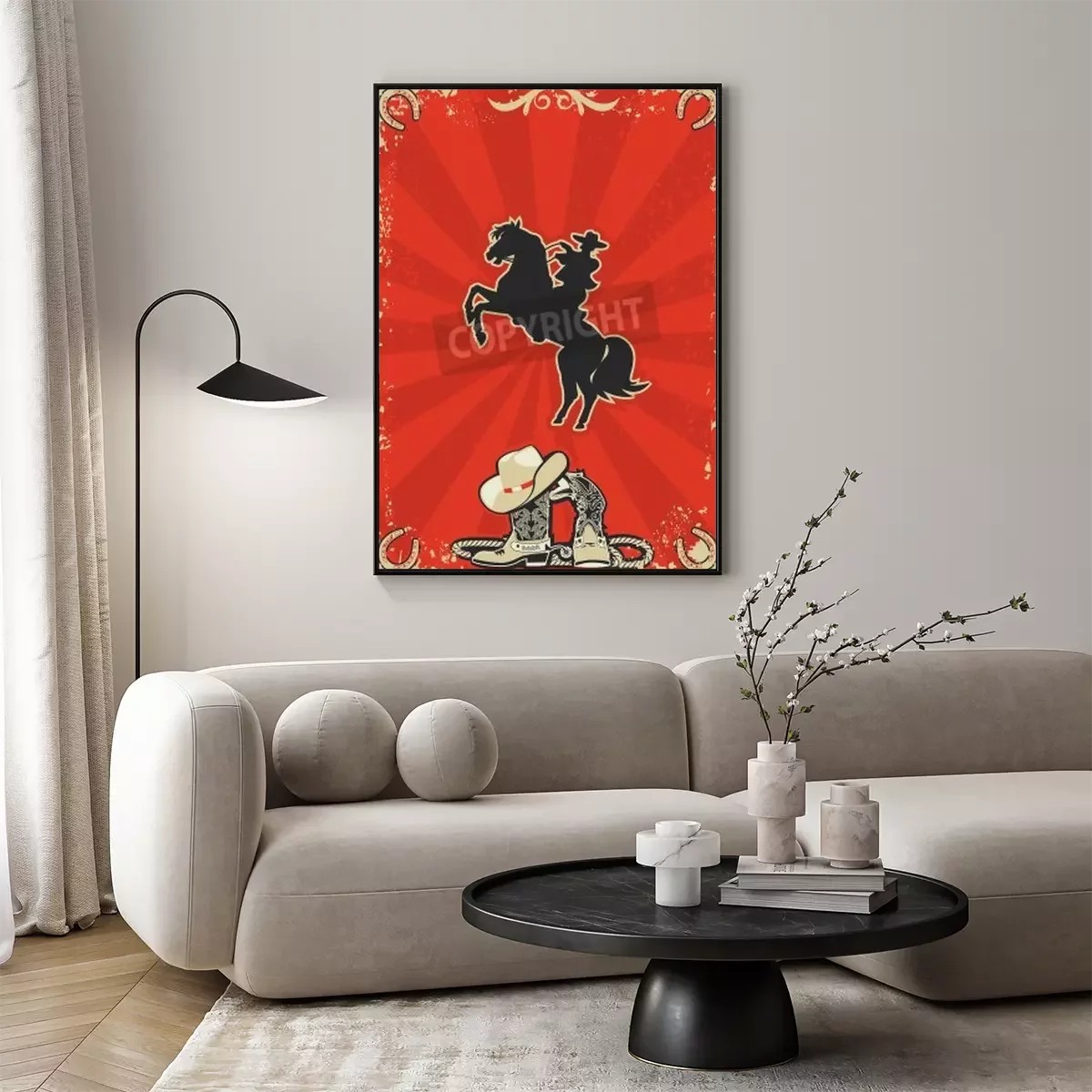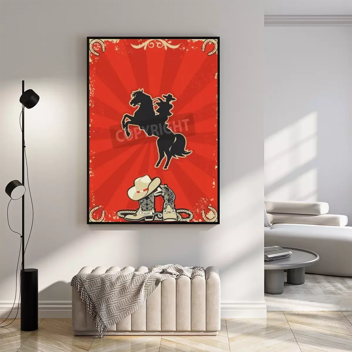 Poster: Pferd und Cowboy auf rotem Hintergrund