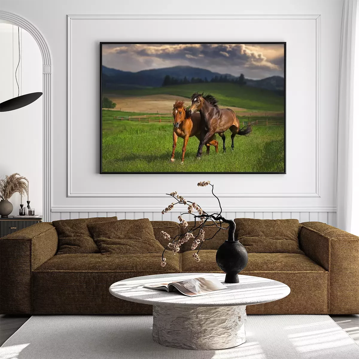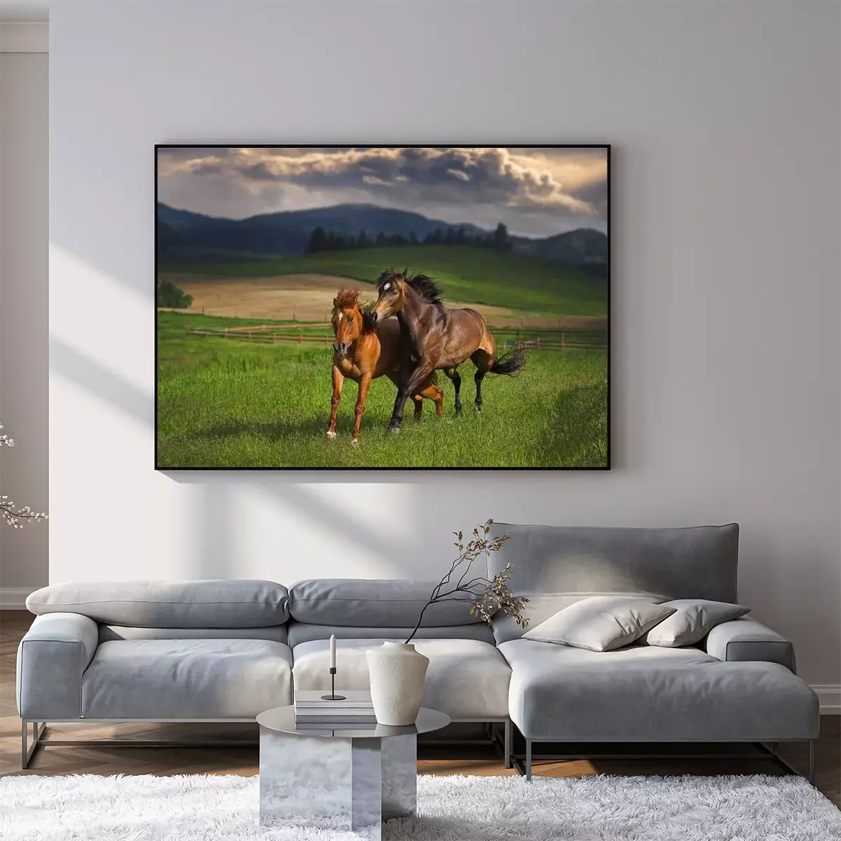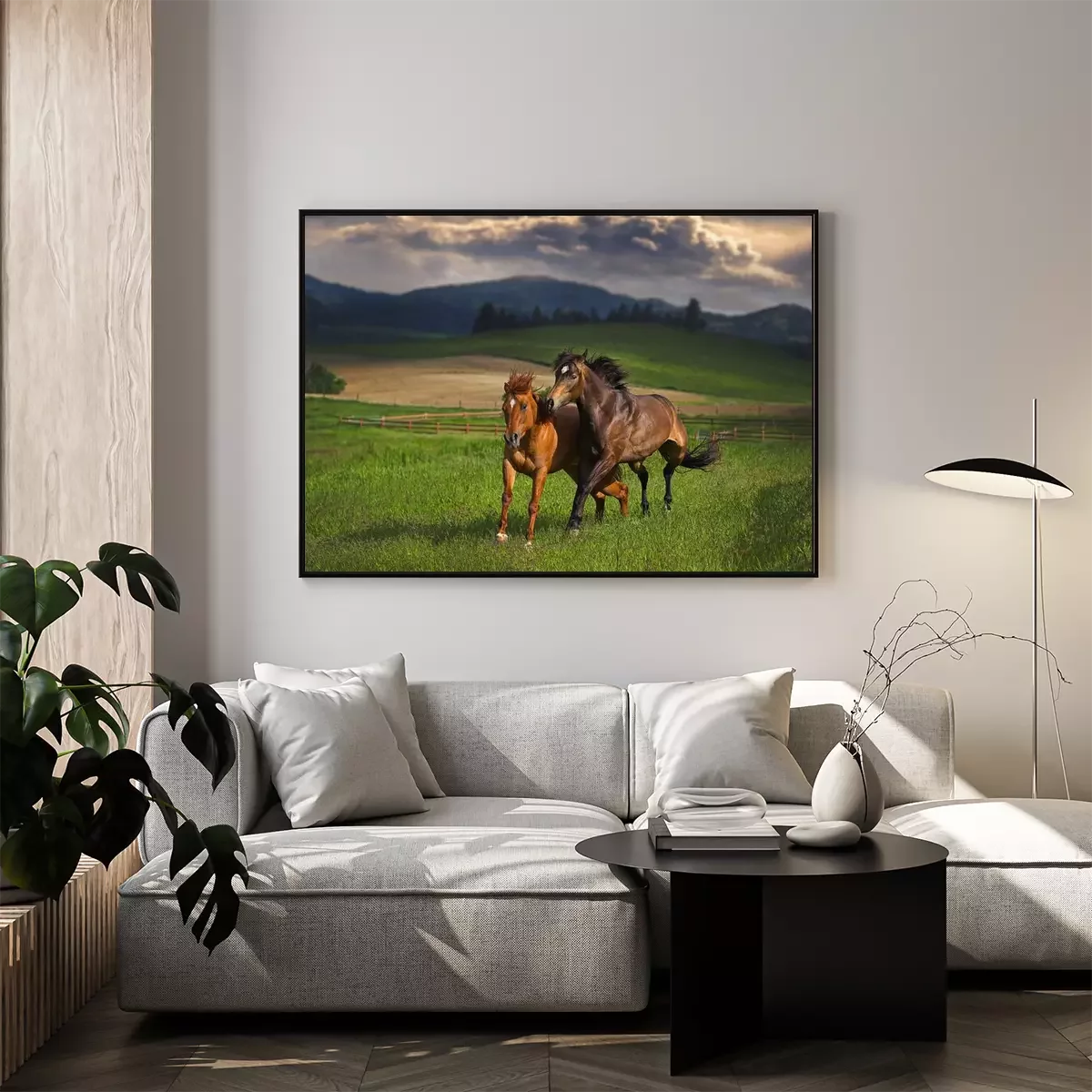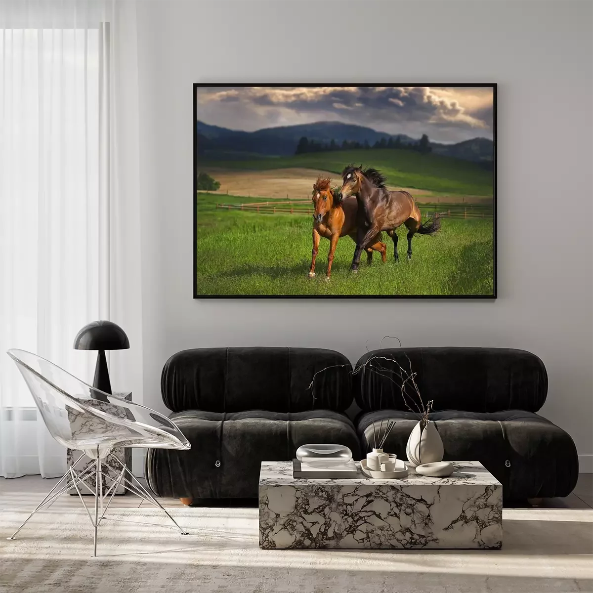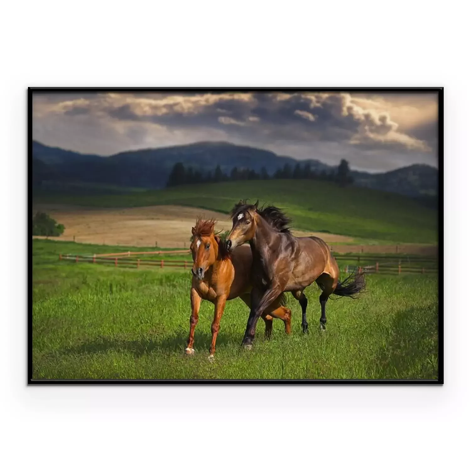 Poster Pferde im Galopp vor dem Hintergrund der Berge