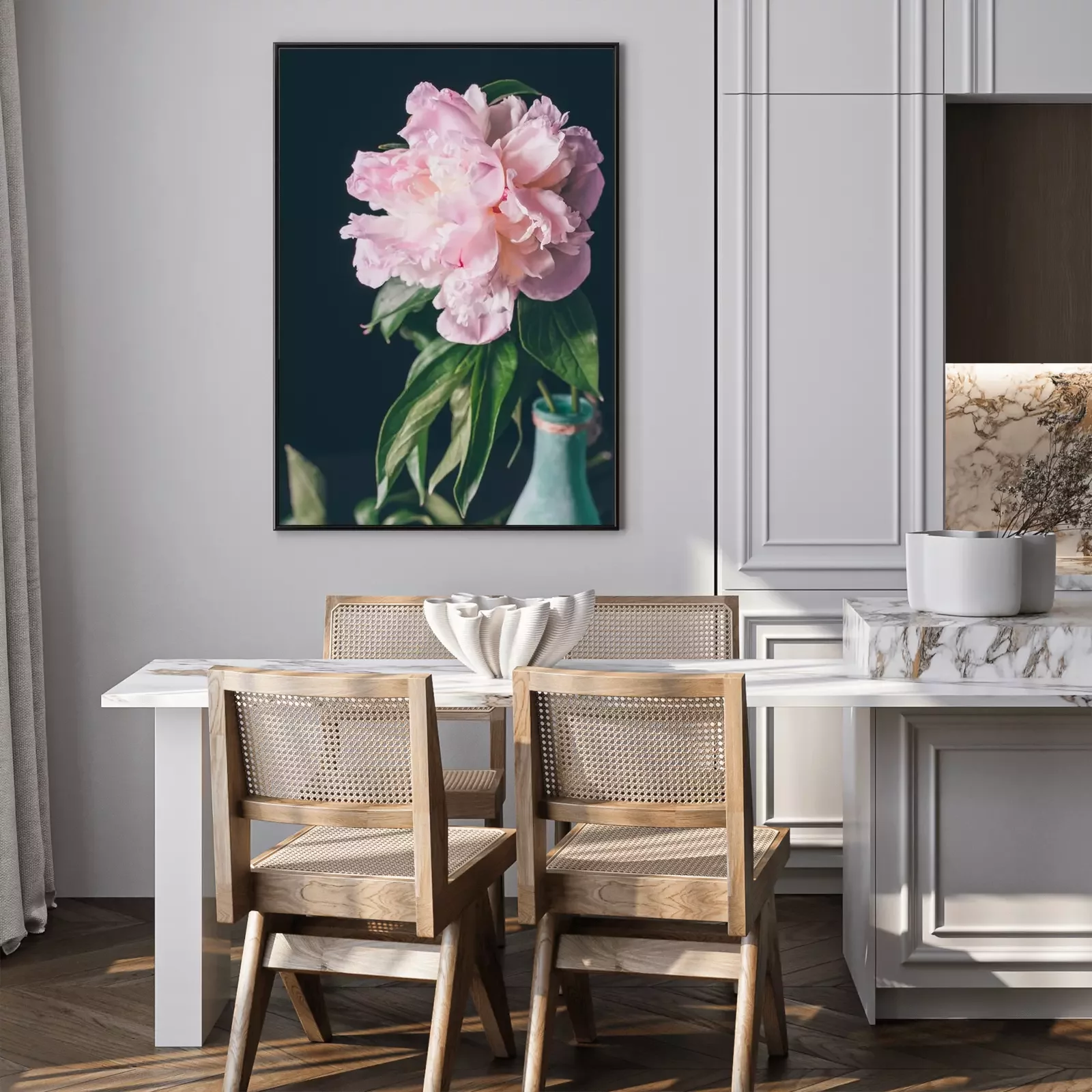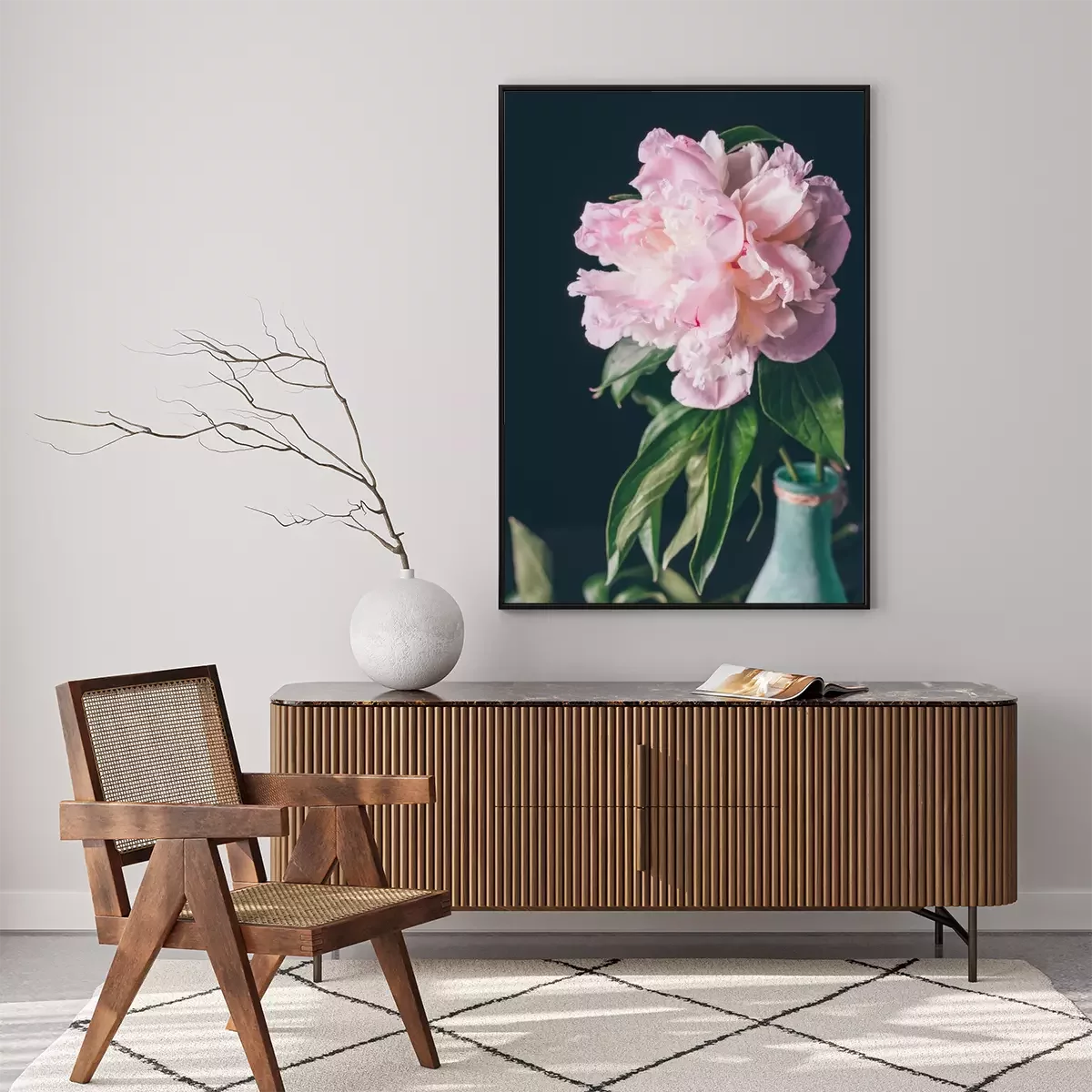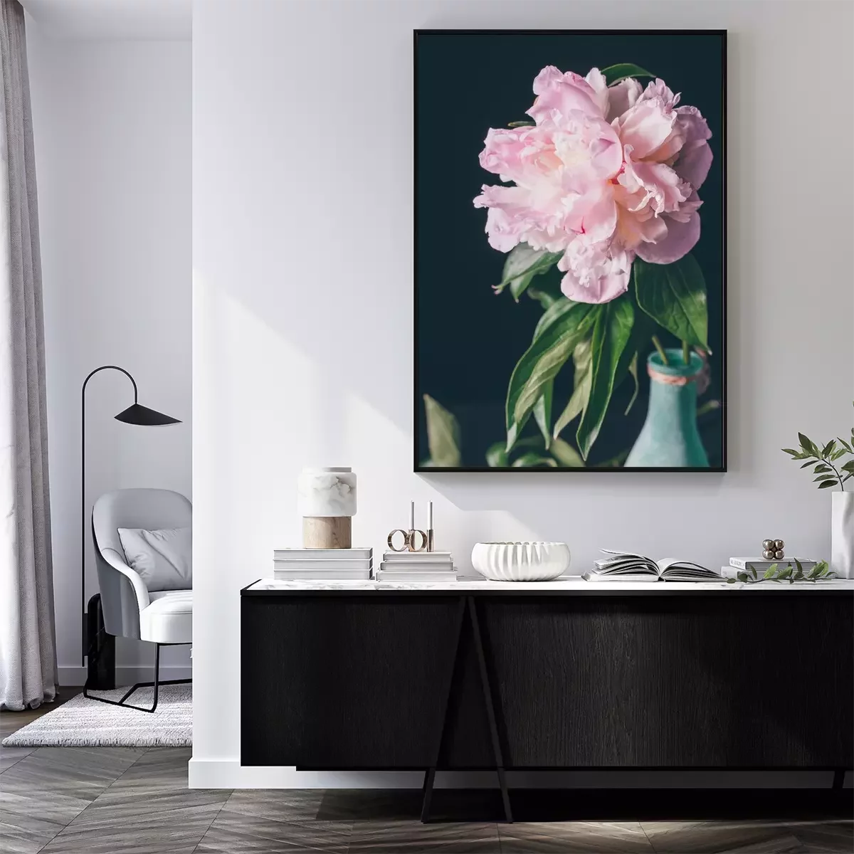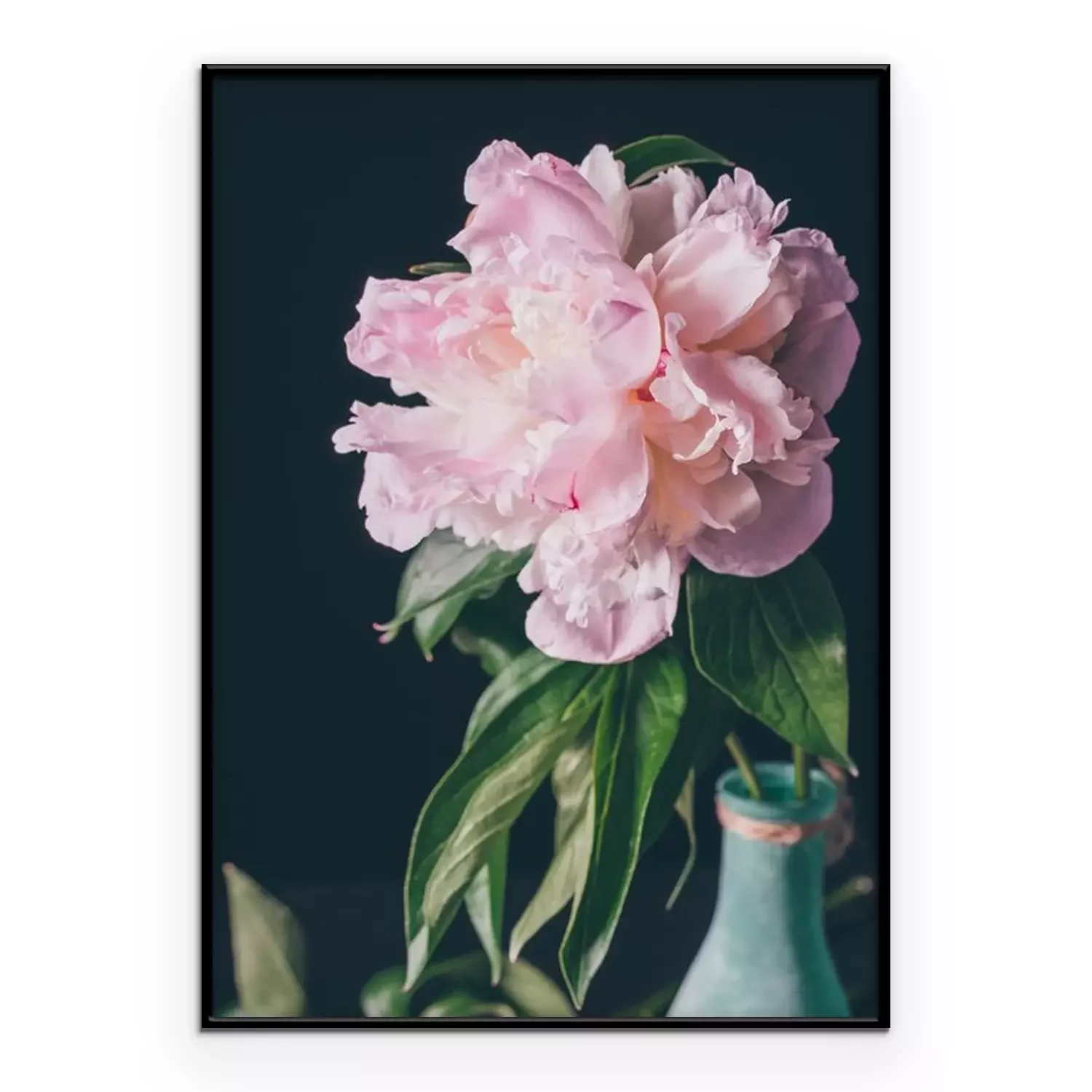 Poster Pfingstrose in einer blau lackierten Flasche