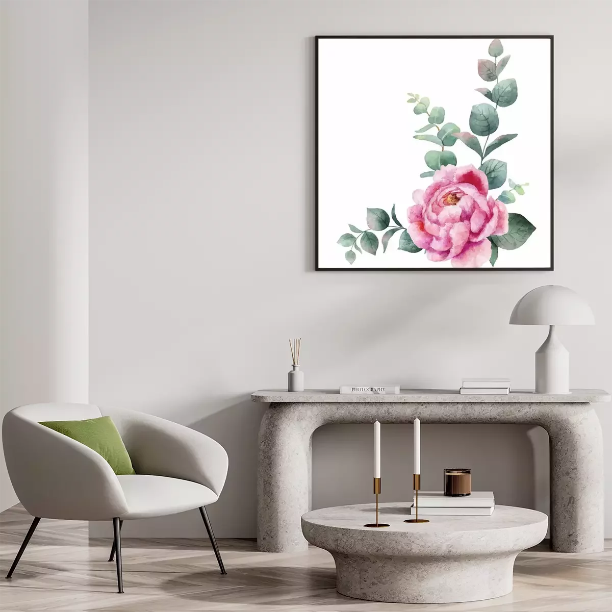 Poster: Pfingstrose mit Eukalyptusblättern verziert