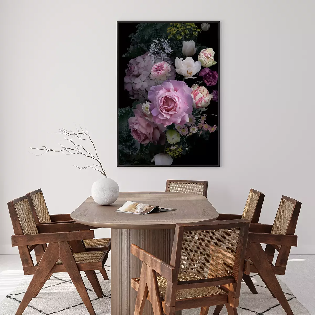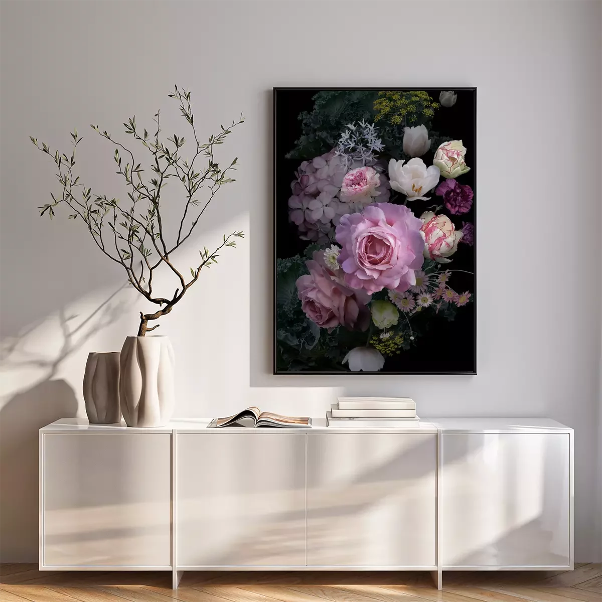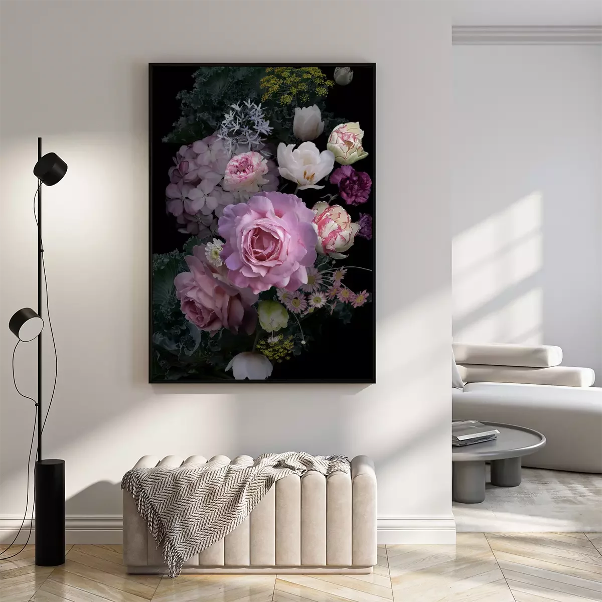 Poster: Pfingstrosen im Dunkeln inmitten anderer Blumen