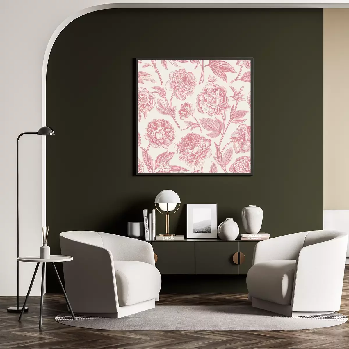Poster: Pfingstrosen mit rosa Blättern und Stielen