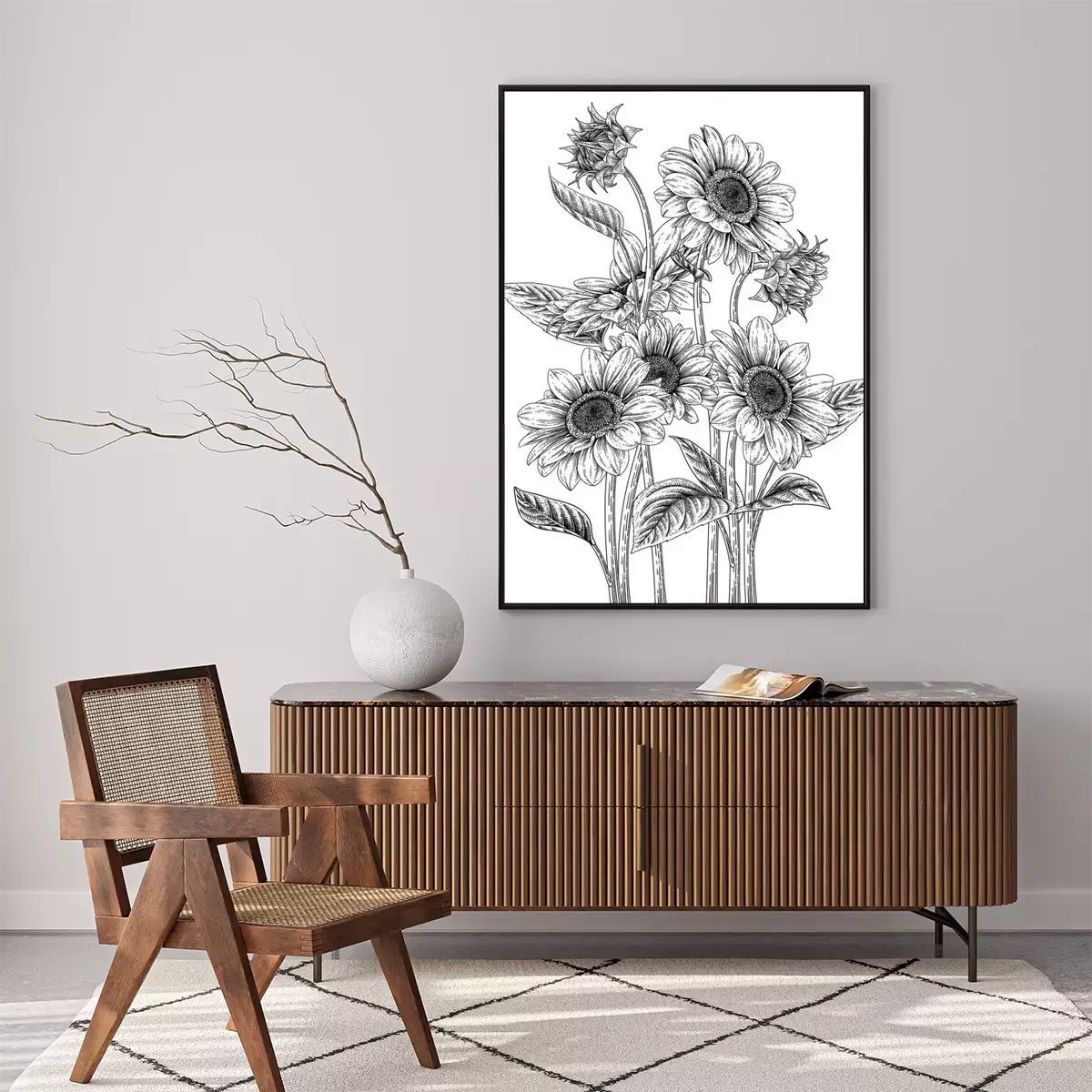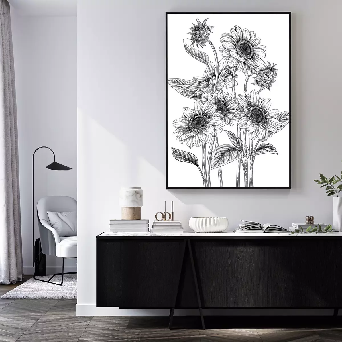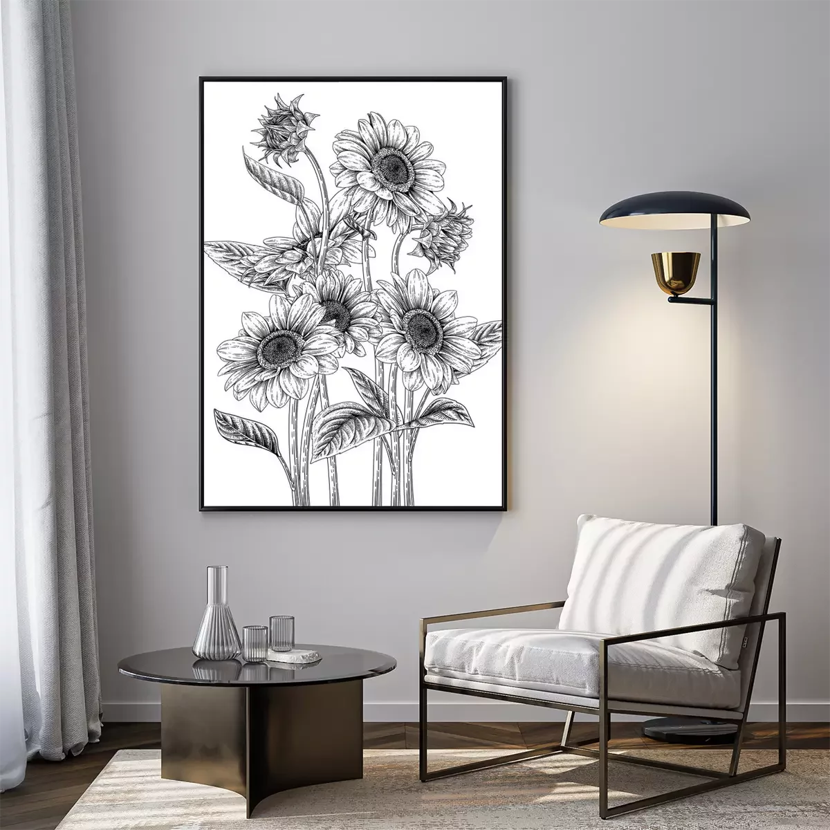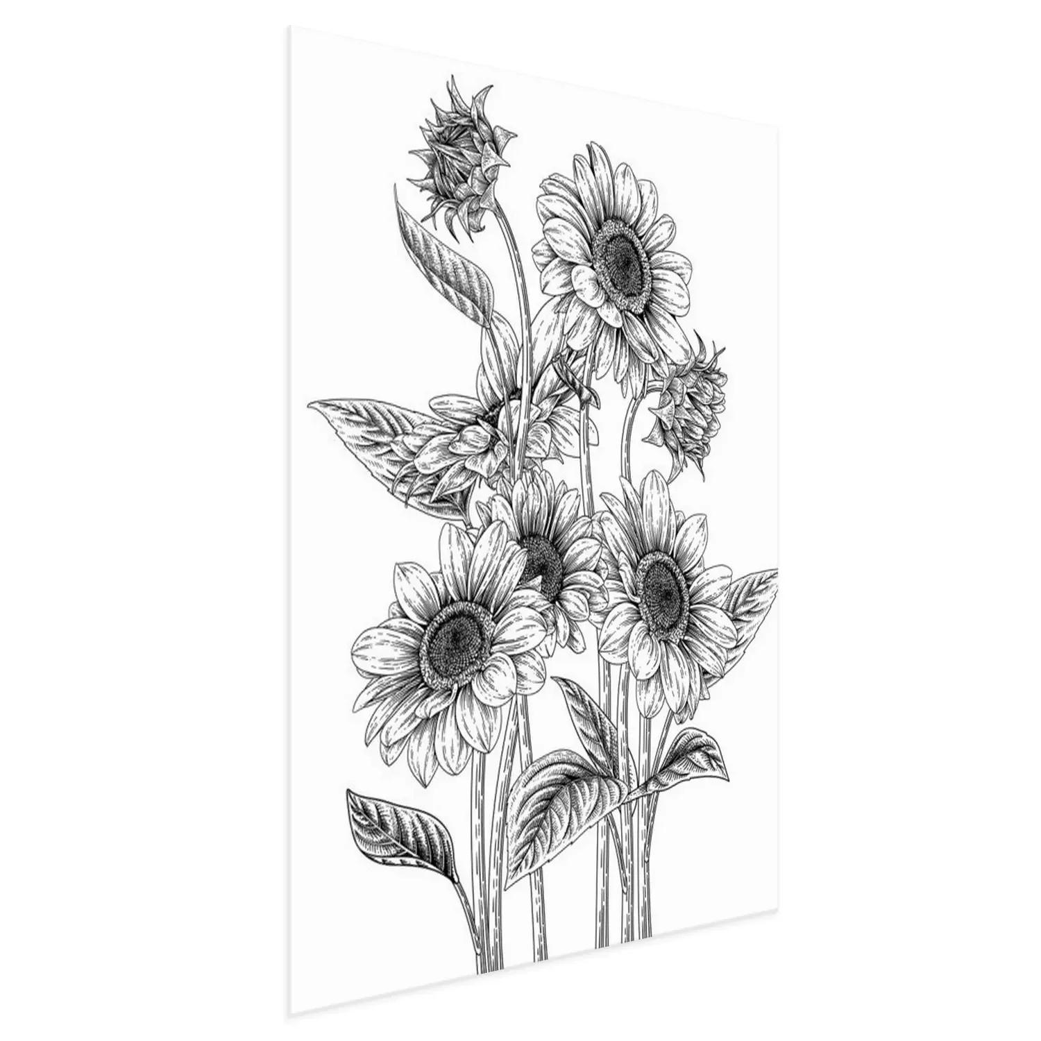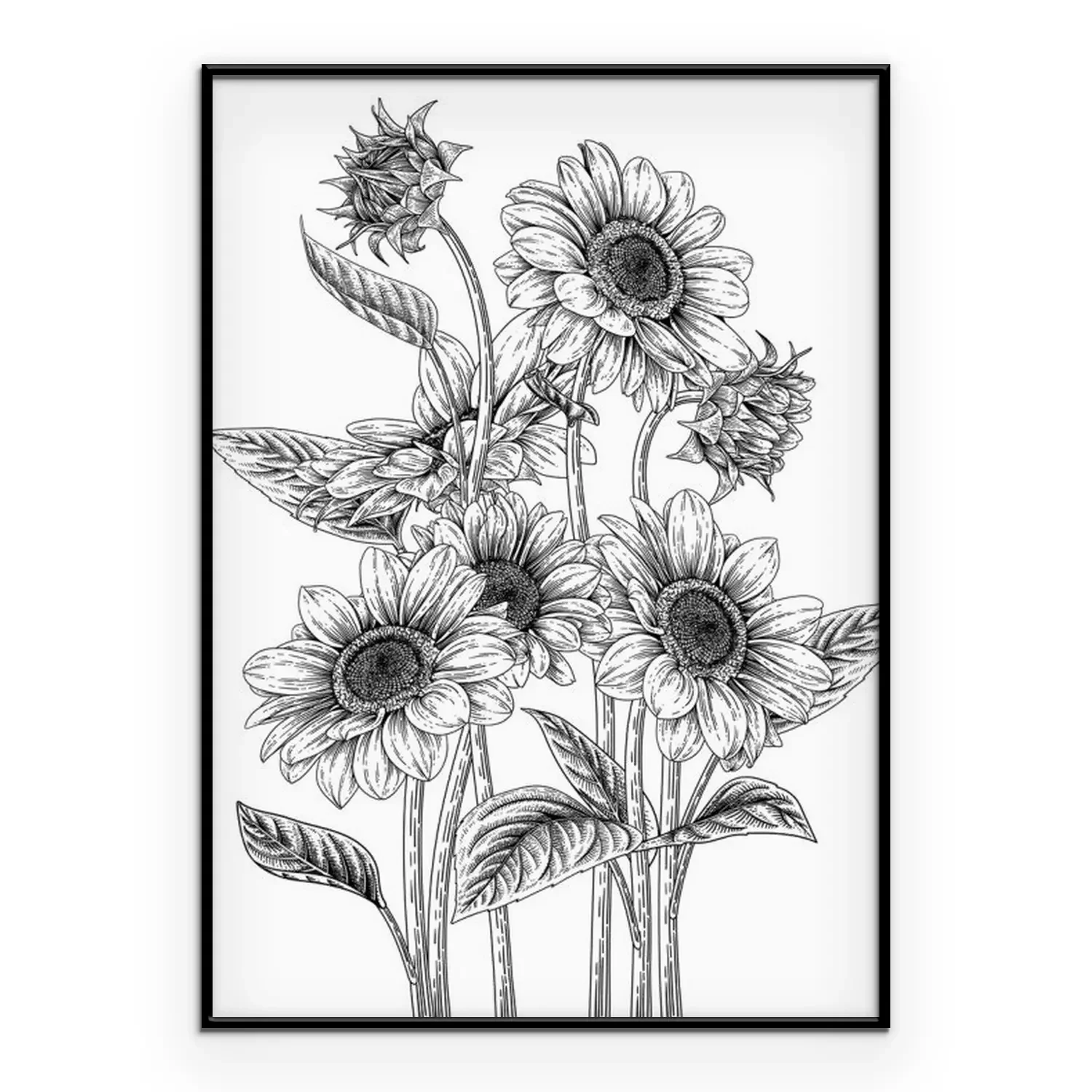Poster: Pflanzen schwarz-weiß Sonnenblumen in Skizze-Ästhetik