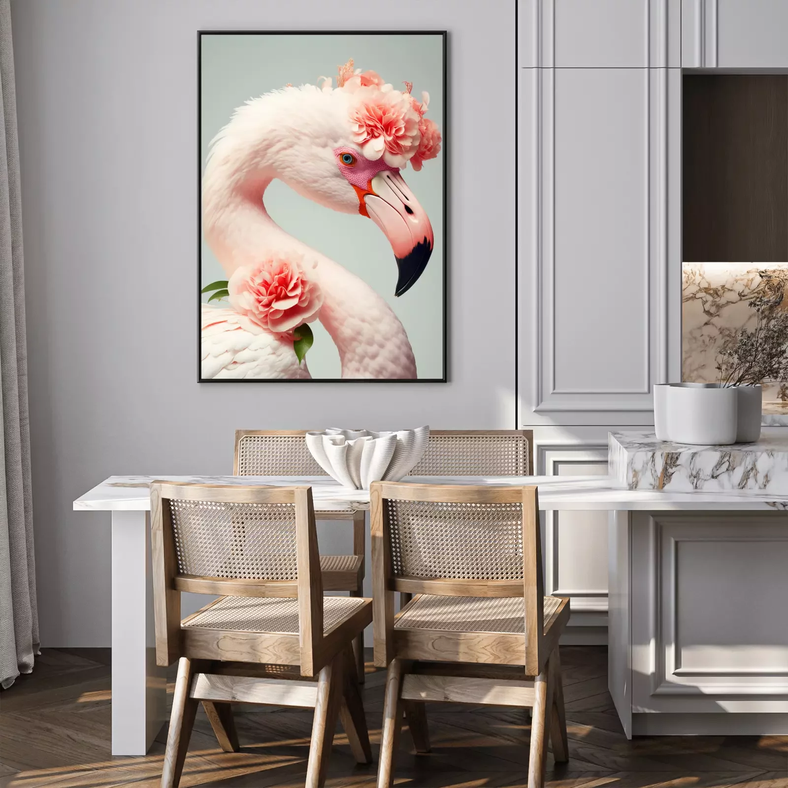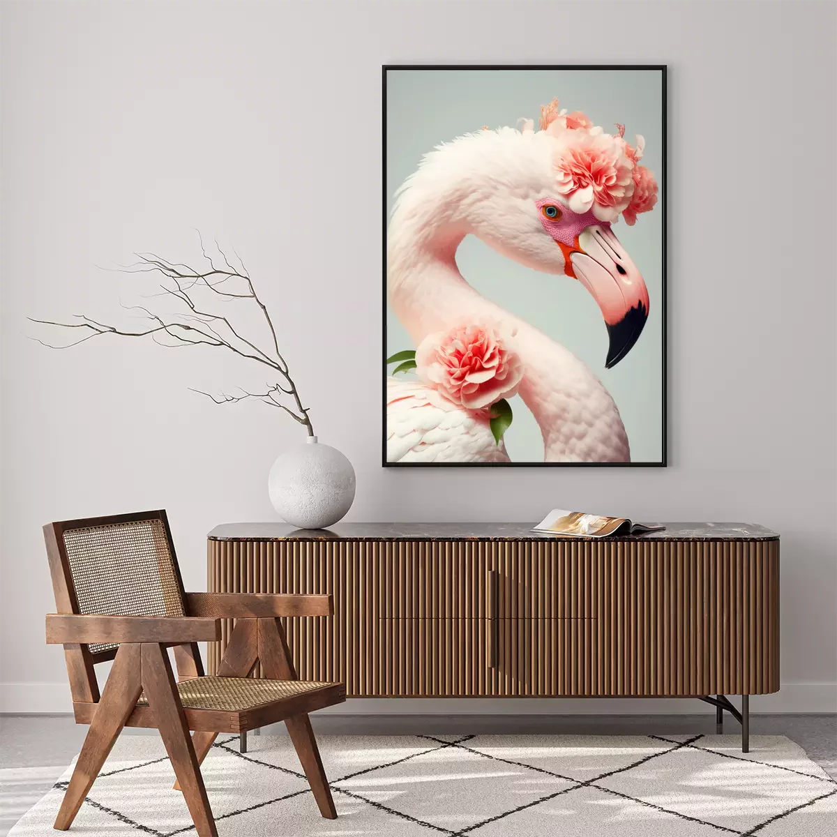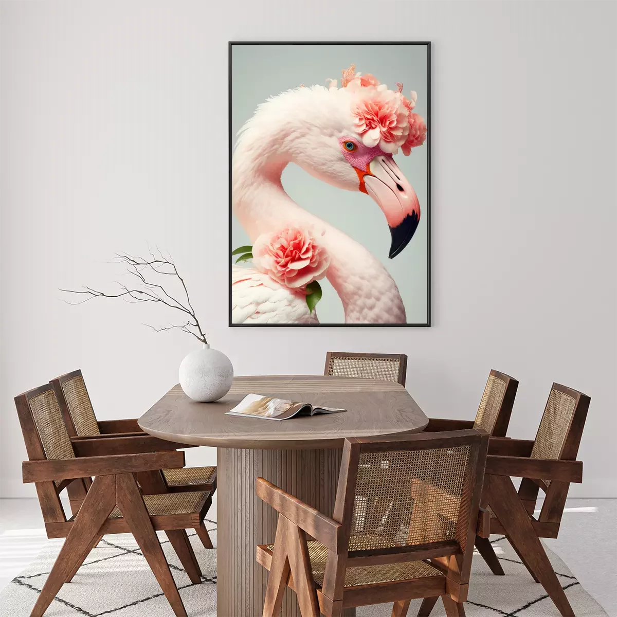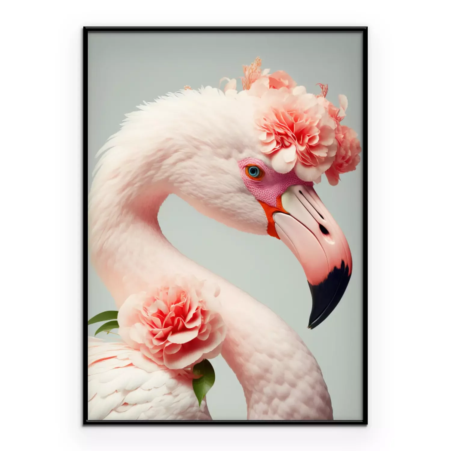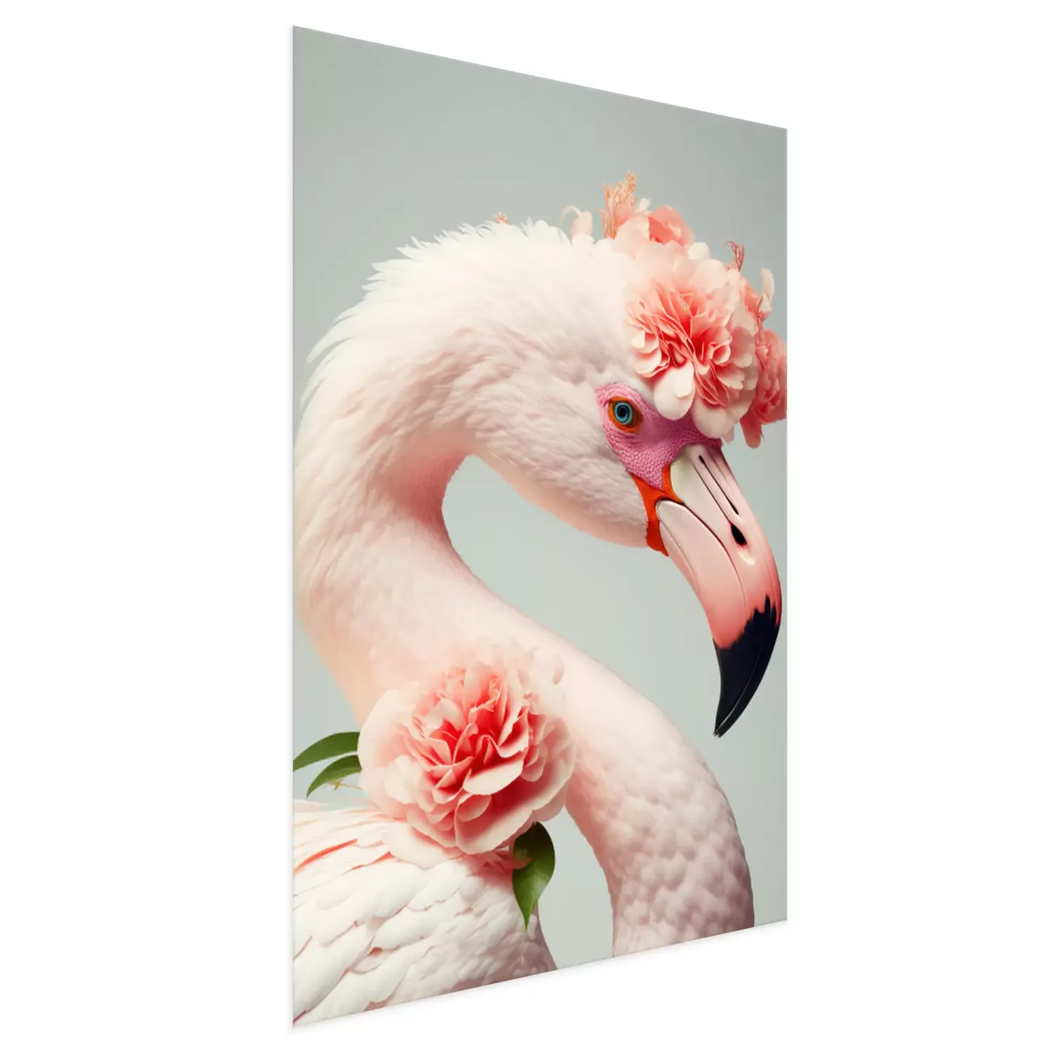 Poster: Porträt eines Flamingos mit Blumen