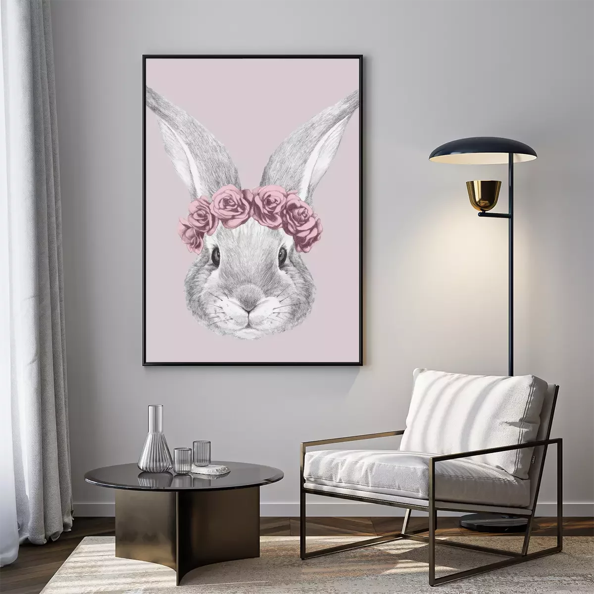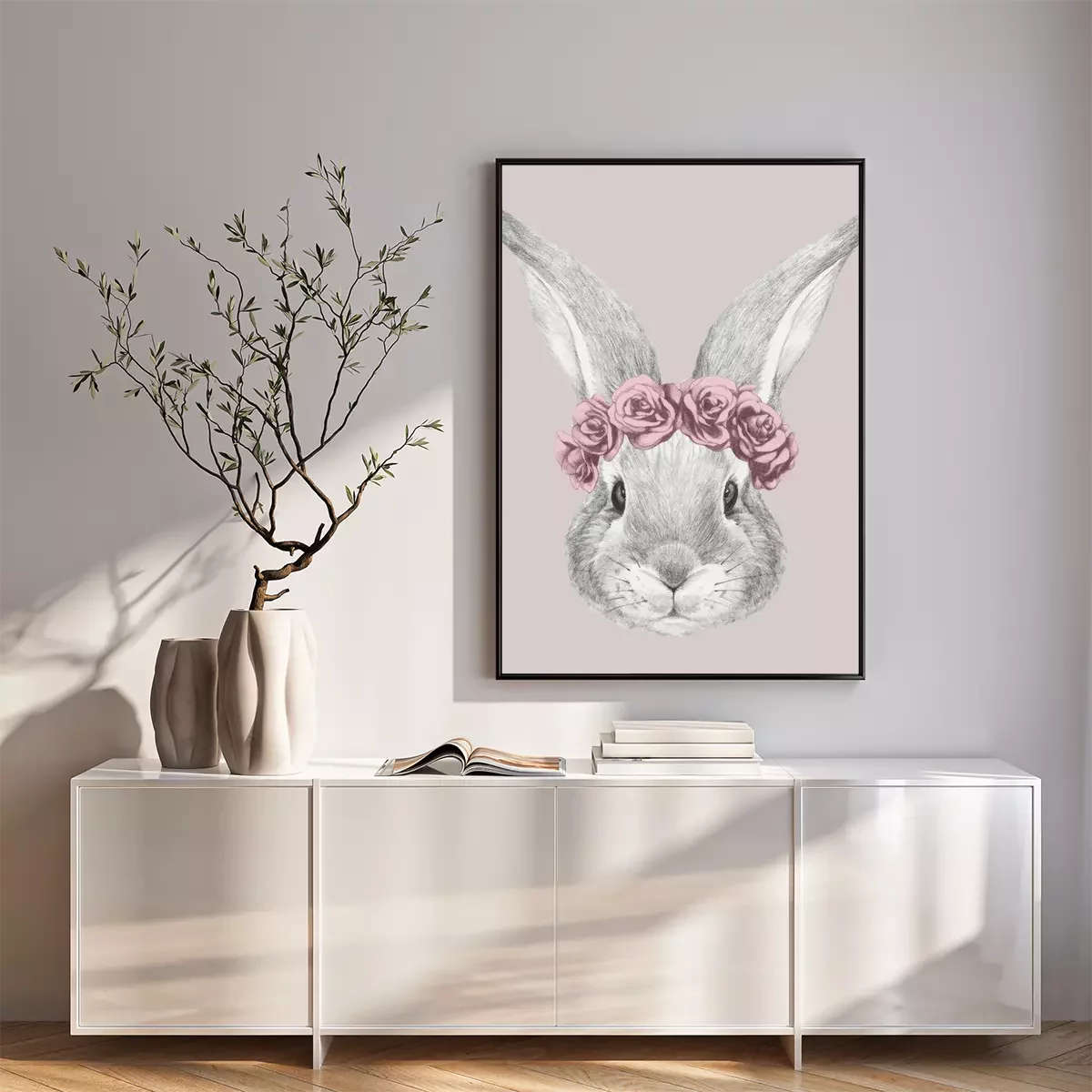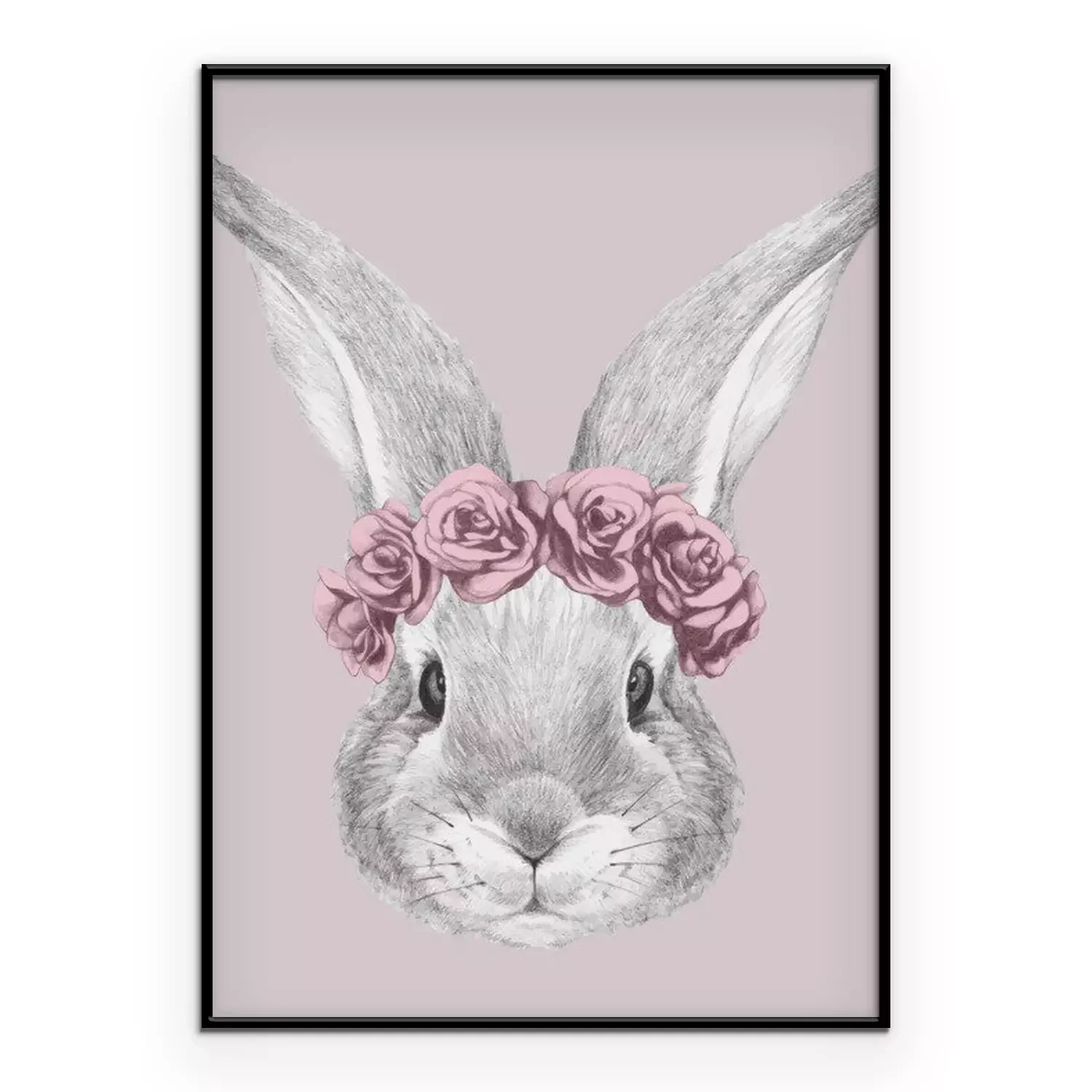 Poster: Porträt eines Kaninchens mit Blumenkranz auf rosa Hintergrund