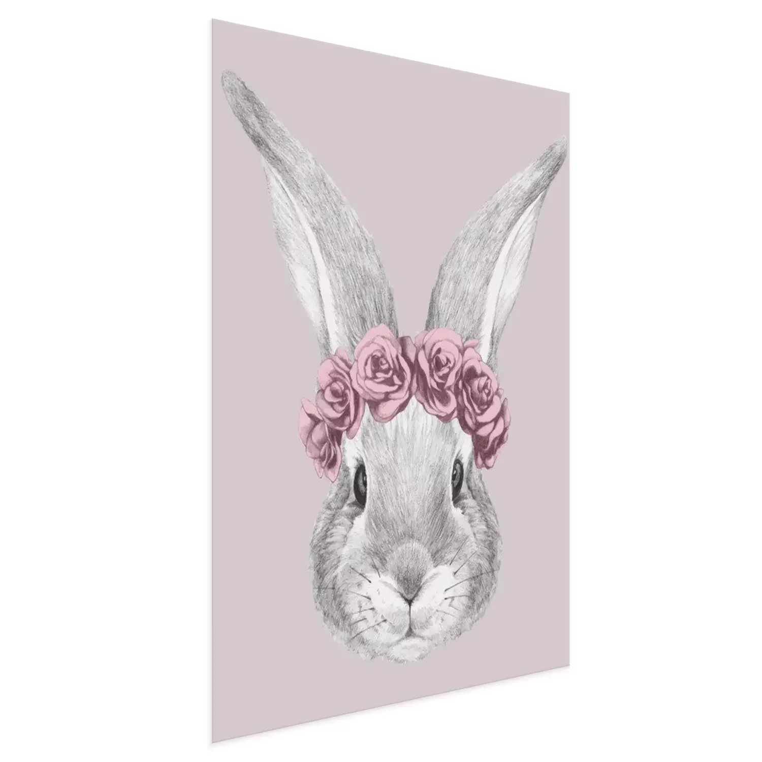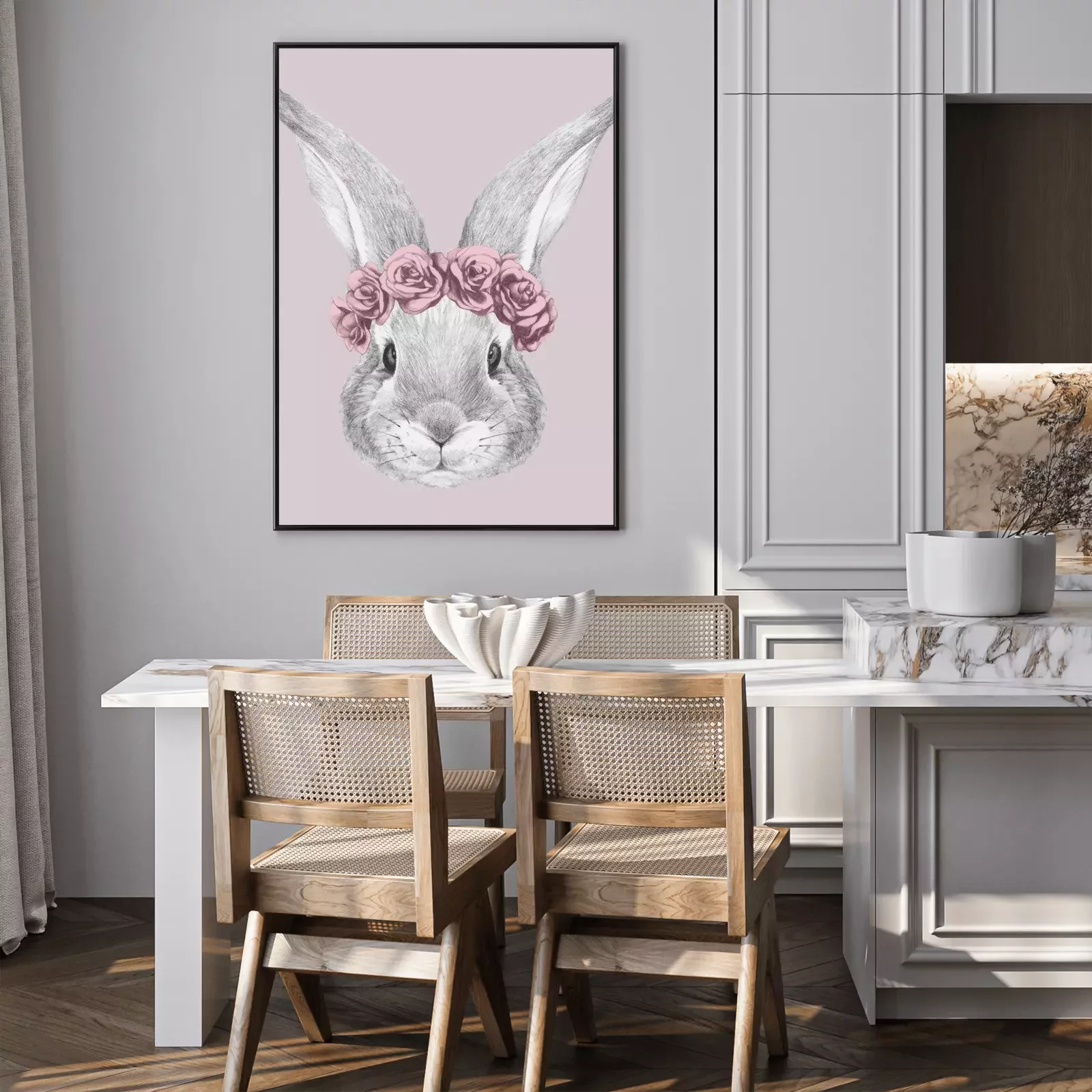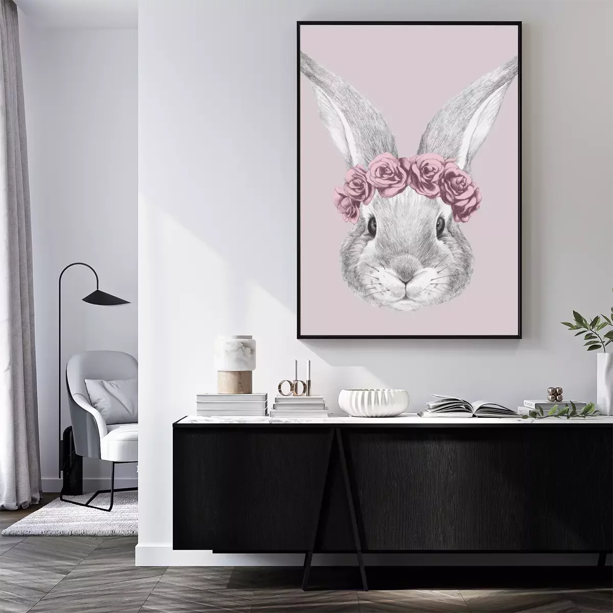 Poster: Porträt eines Kaninchens mit Blumenkranz auf rosa Hintergrund