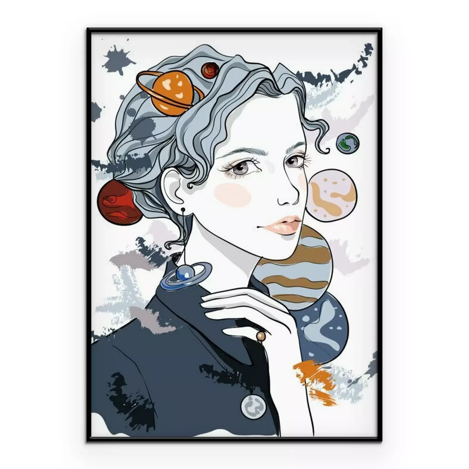 Poster: Porträt eines schönen Mädchens mit Planeten um ihr Gesicht. Modevektorillustration auf abstraktem Hintergrund