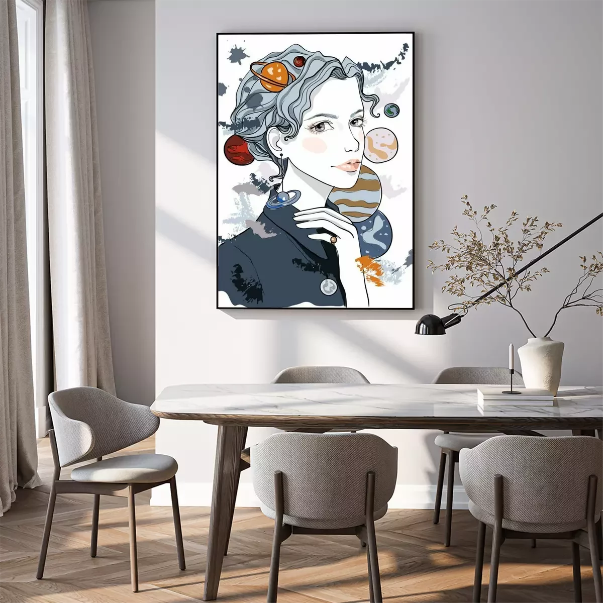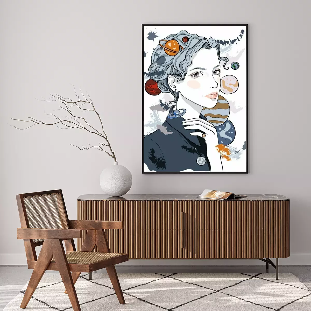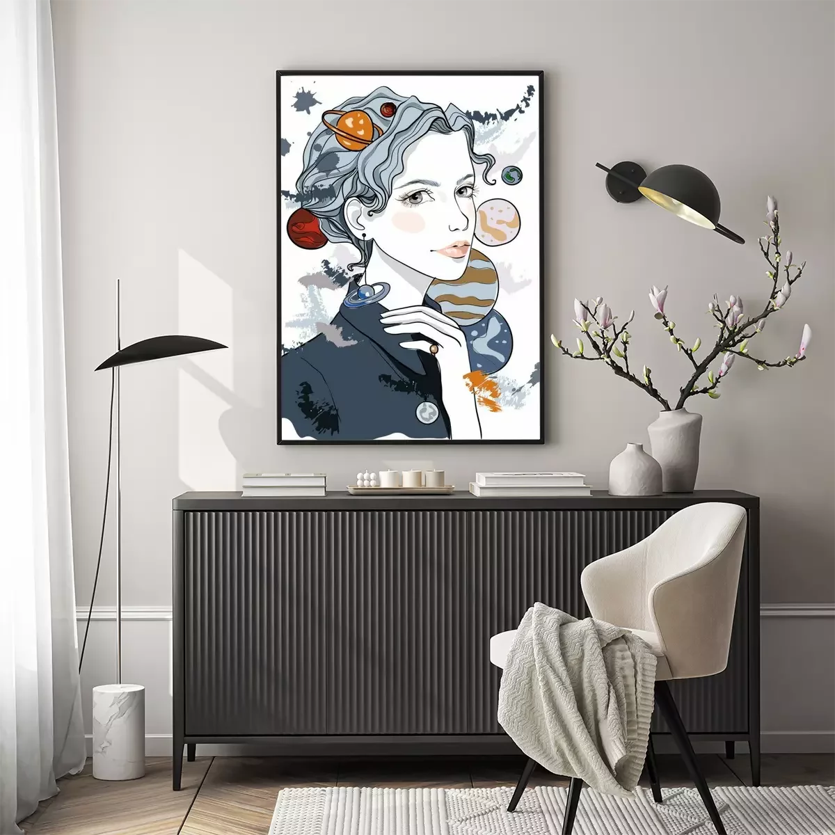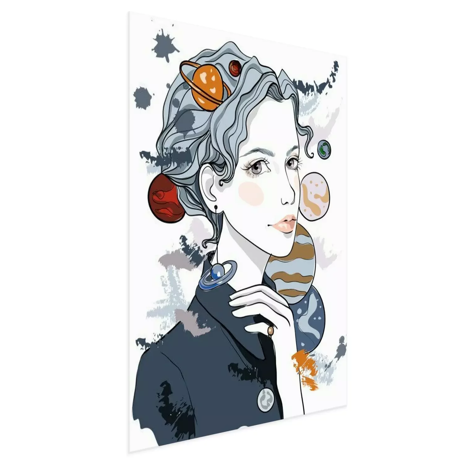 Poster Porträt eines schönen Mädchens mit Planeten um ihr Gesicht.  Modevektorillustration auf abstraktem Hintergrund