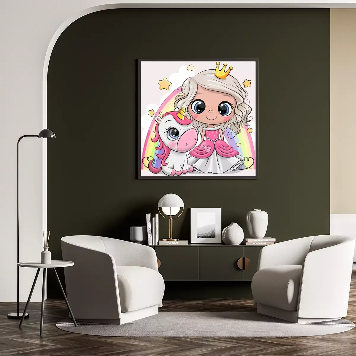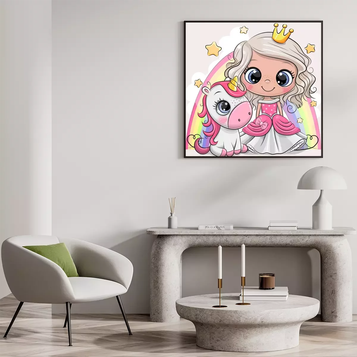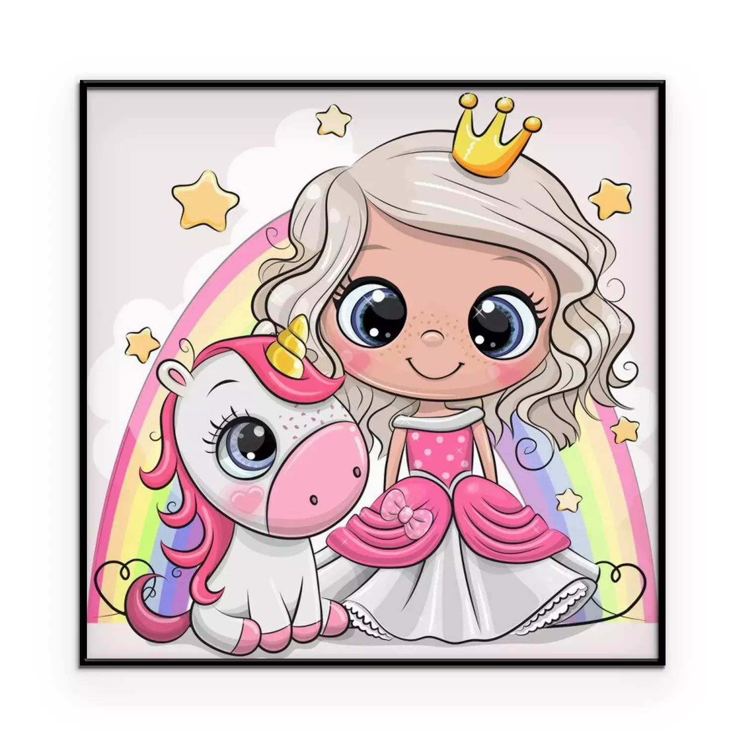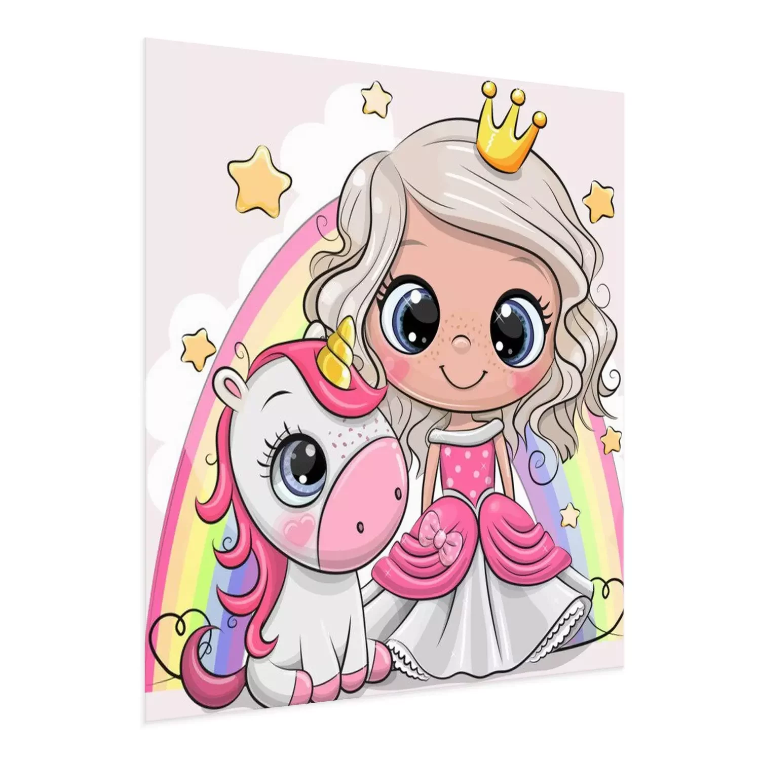 Poster: Prinzessin und Einhorn auf einem Hintergrund aus einem bunten Regenbogen
