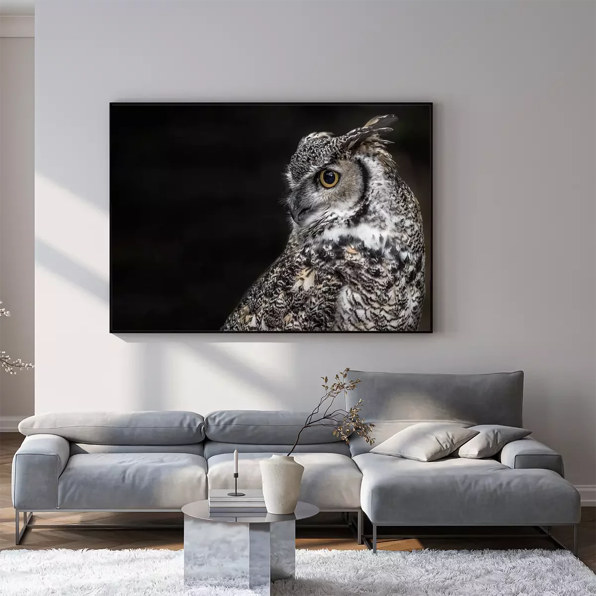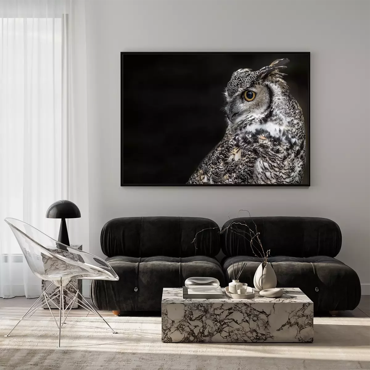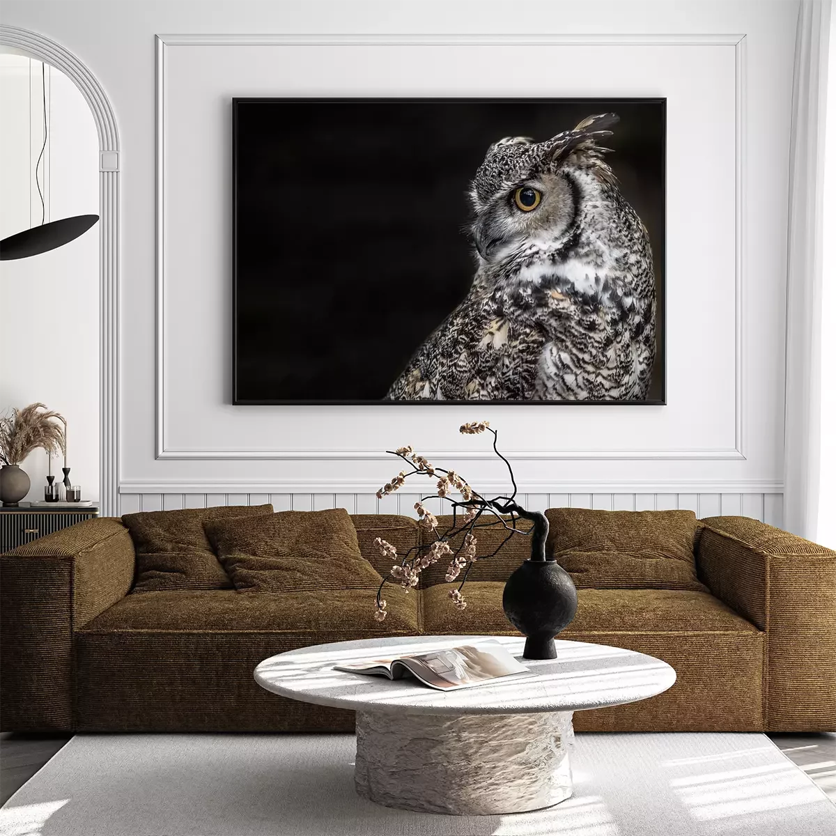 Poster: Profil eines Waldkauzes auf schwarzem Hintergrund