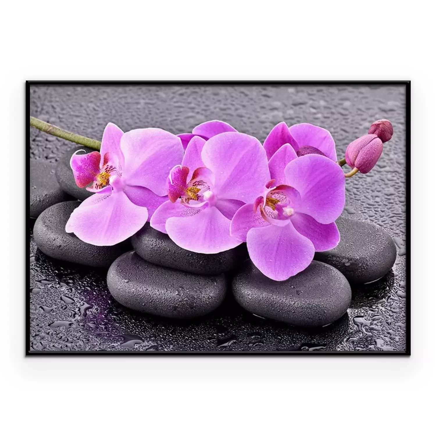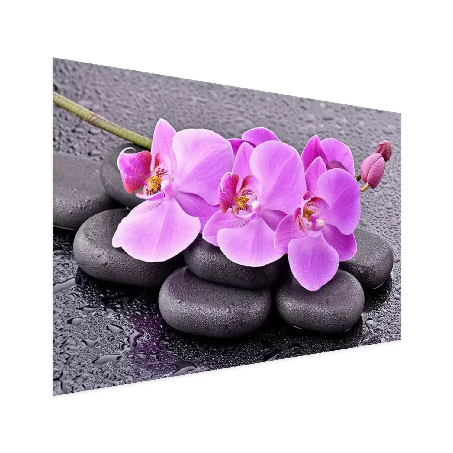 Poster: Rosa Blumen auf schwarzen Steinen angeordnet