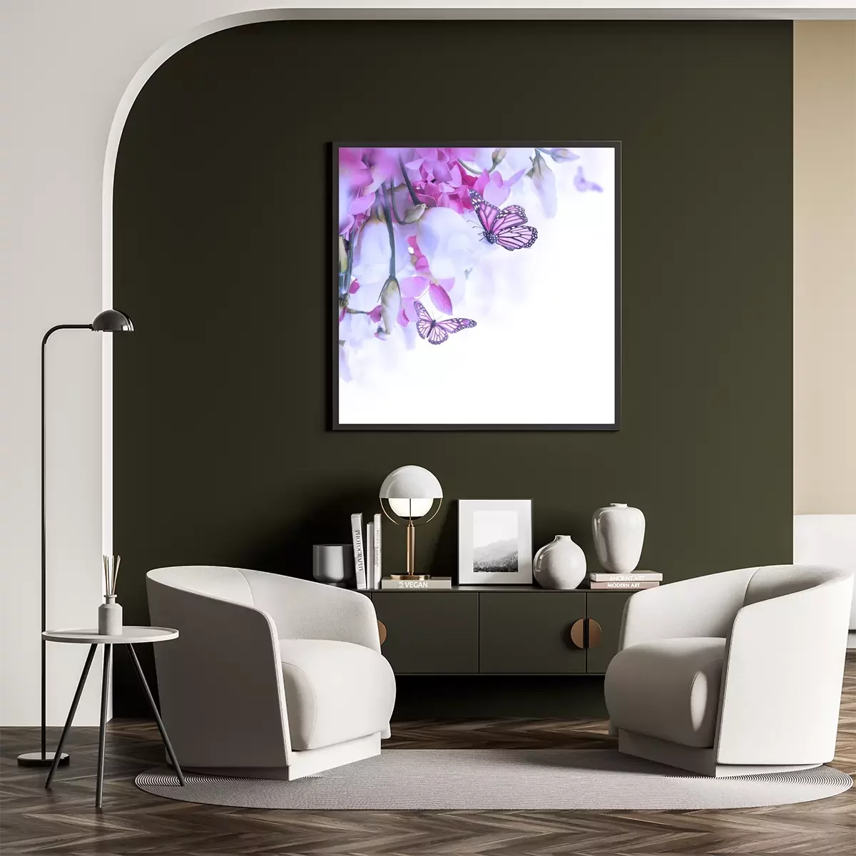 Komposition mit Orchideen und Schmetterlingen
