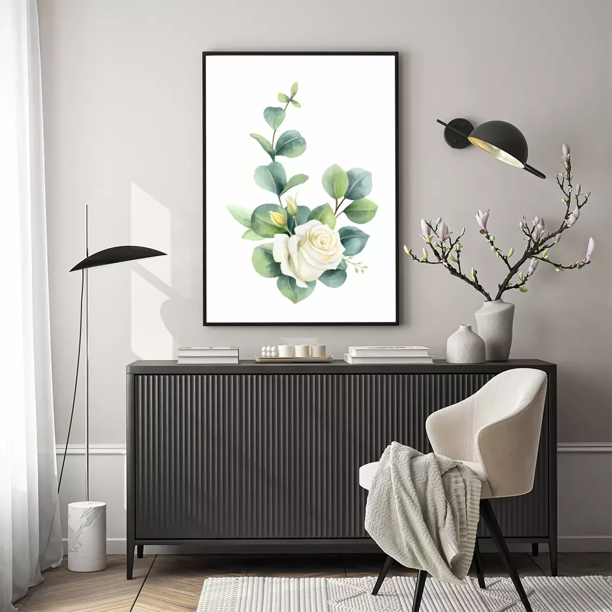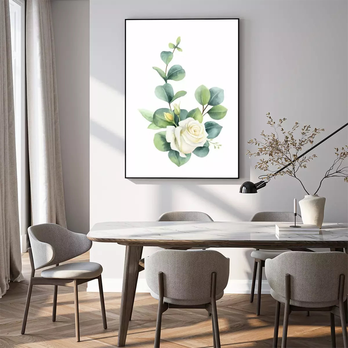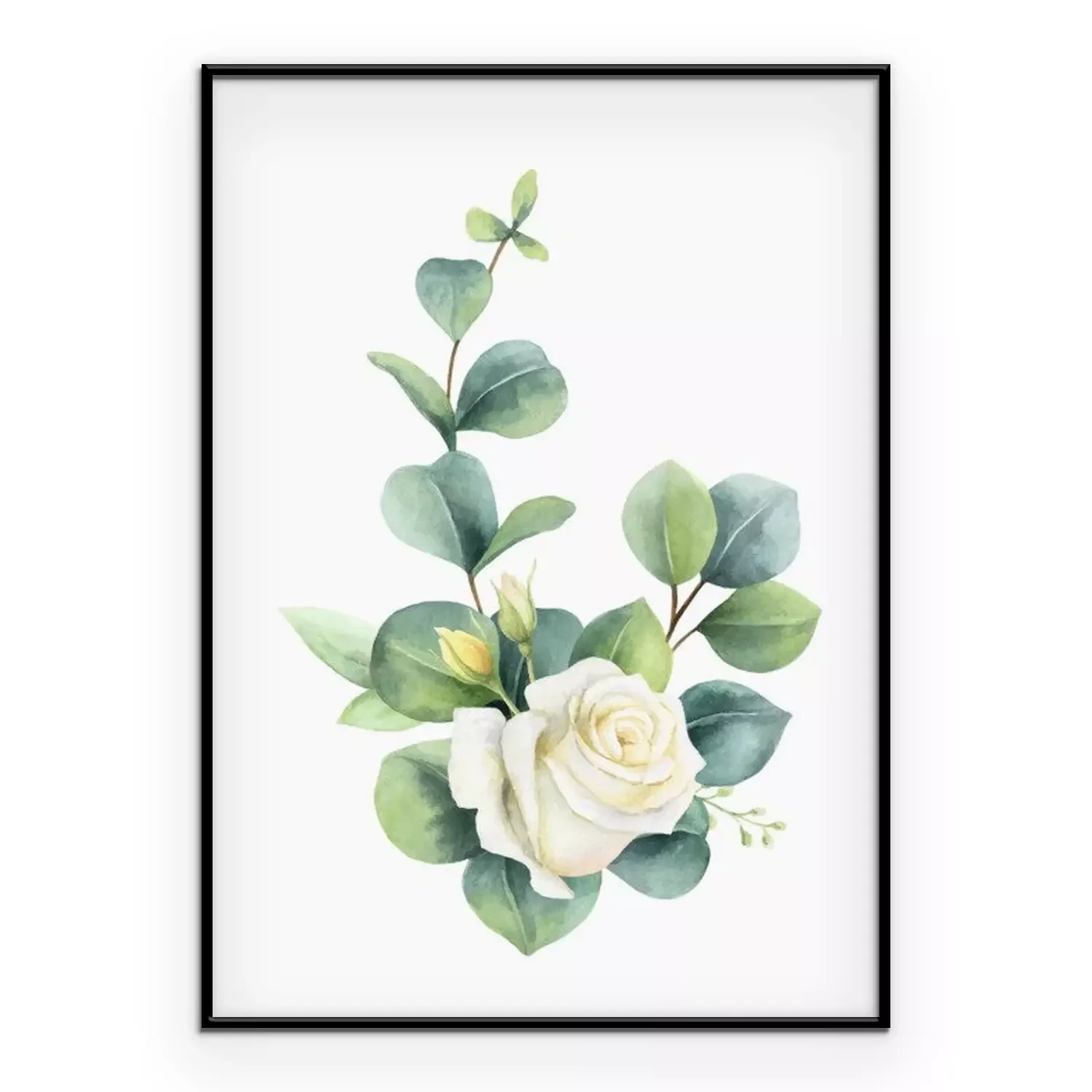 Poster: Rosen weiss mit schattierten Eukalyptusblättern