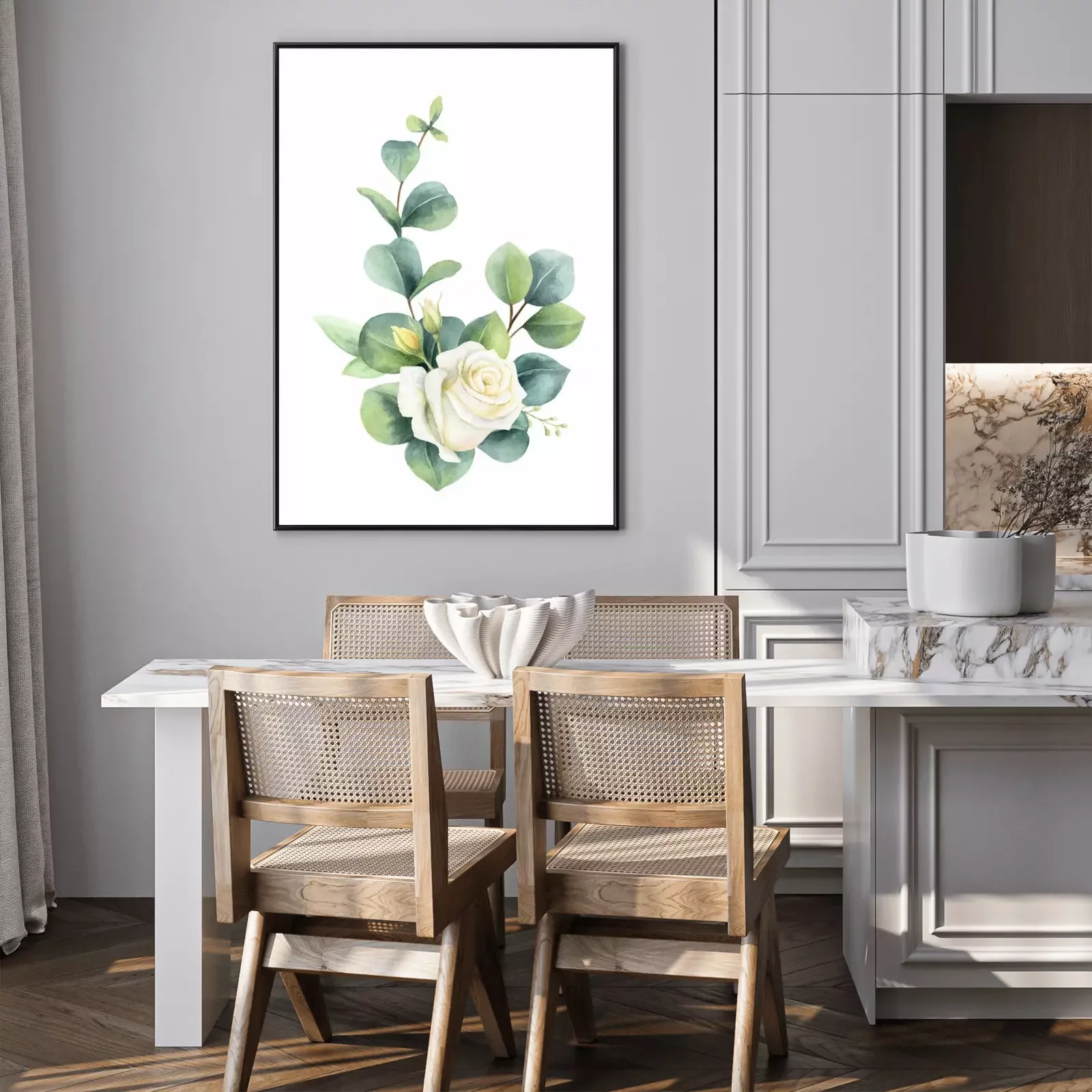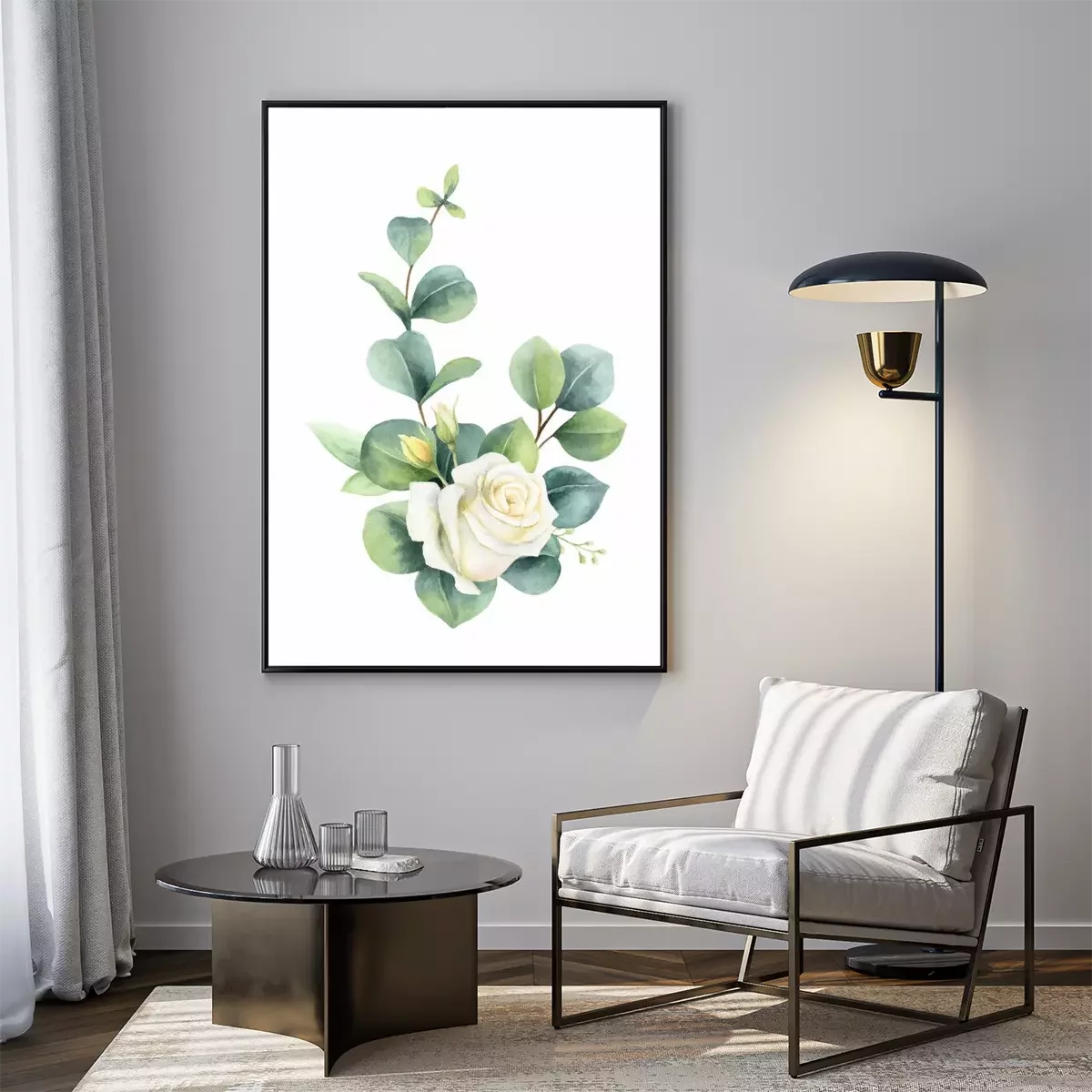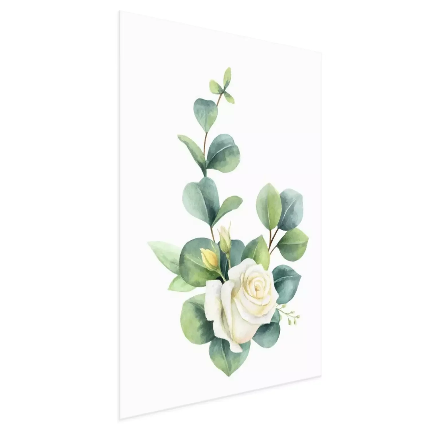 Poster Rosen weiss mit schattierten Eukalyptusblättern