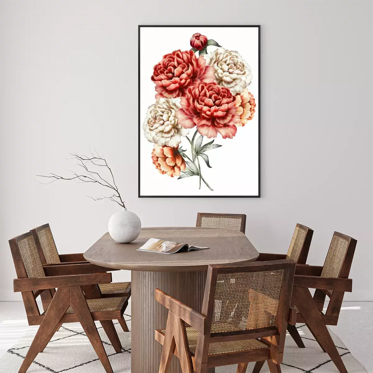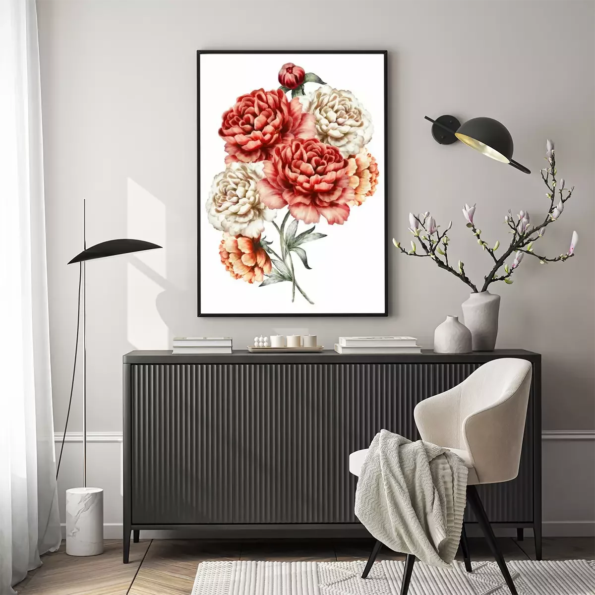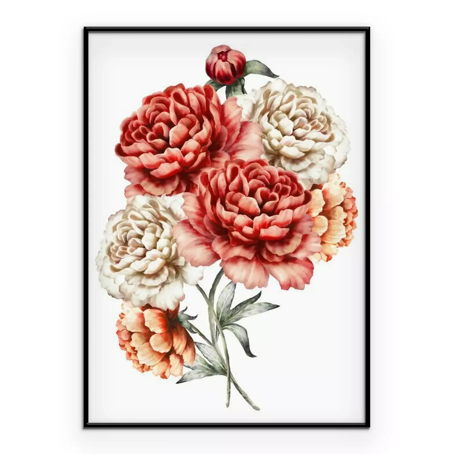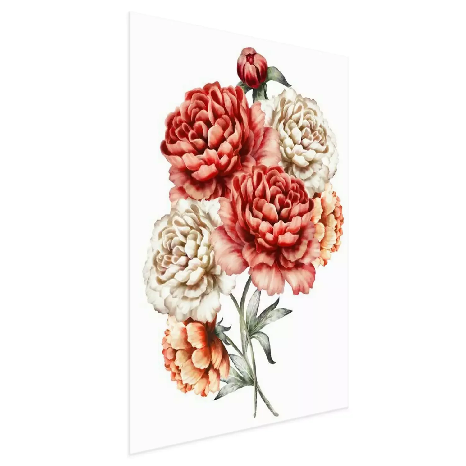 Poster Roten Pfingstrosen. Aquarellblumen. Blumenabbildung in den Pastellfarben. Bouquet von Blumen isoliert auf weißem Hintergrund. Blatt und Knospen. Romantische Zusammensetzung für Hochzeit oder Grußkarte
