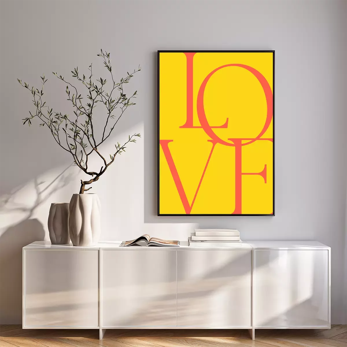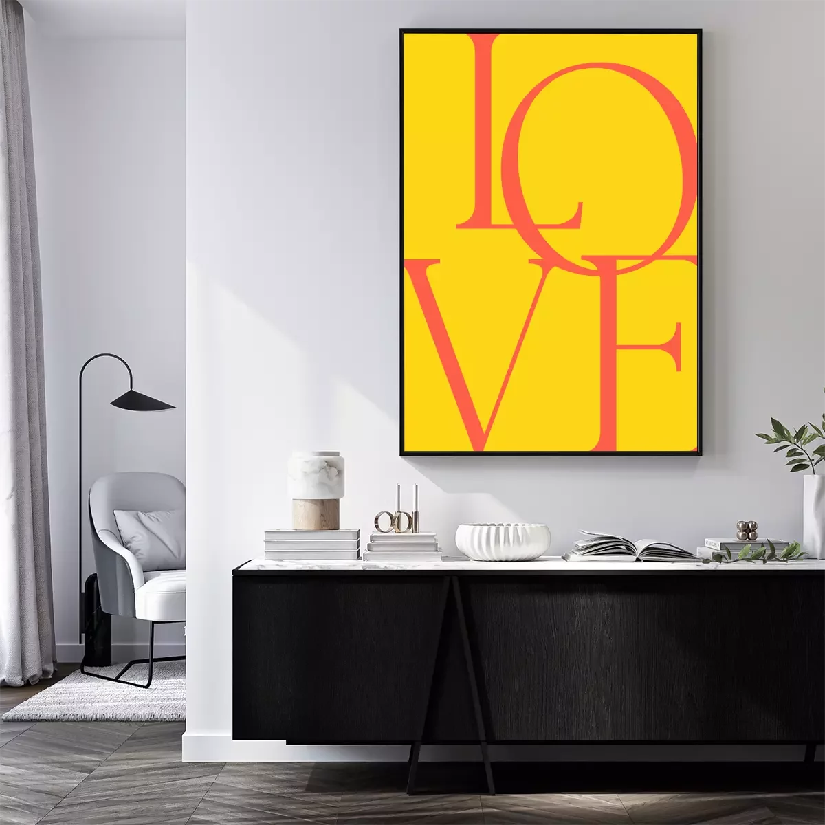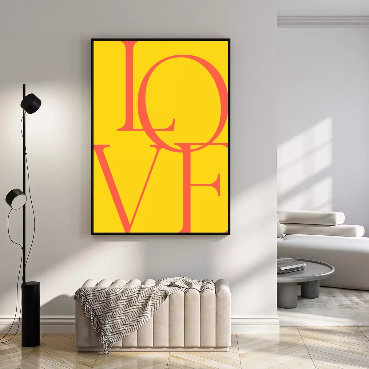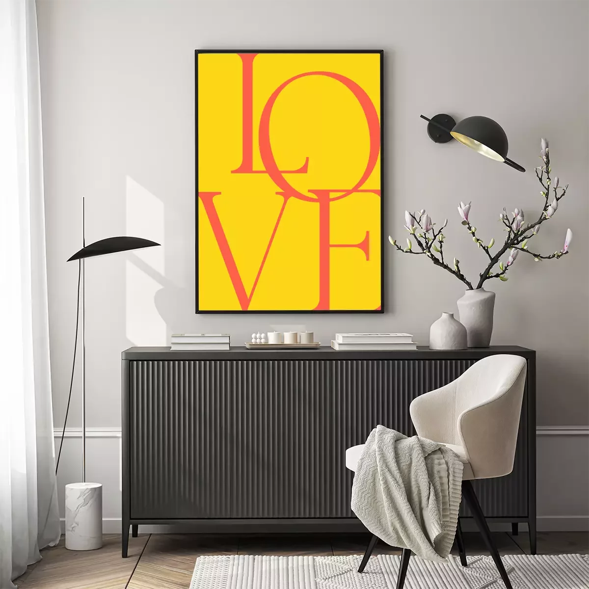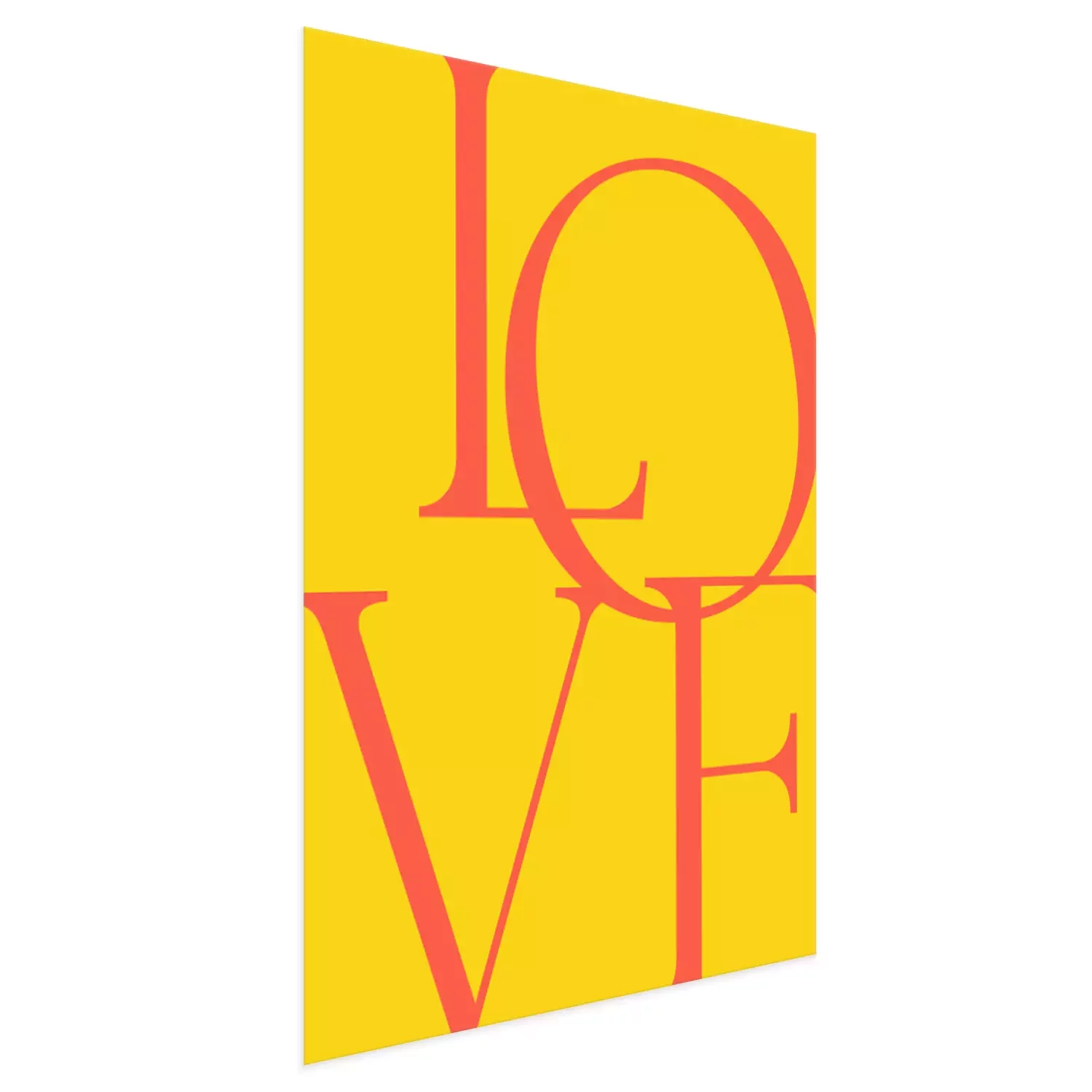 Rotes love-schriftzeichen auf gelbem hintergrund