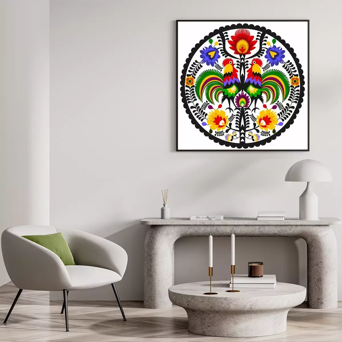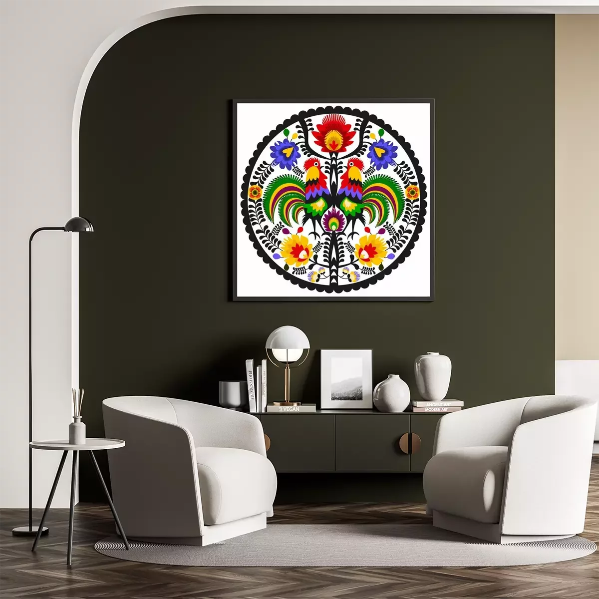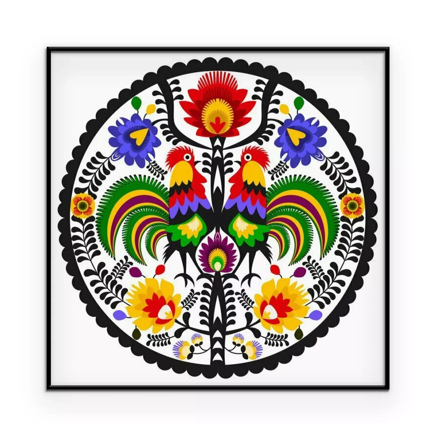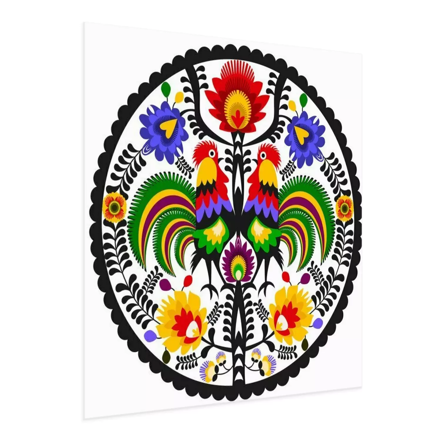 Poster Rundes Muster mit volkstümlichem Ornament mit Hähnen