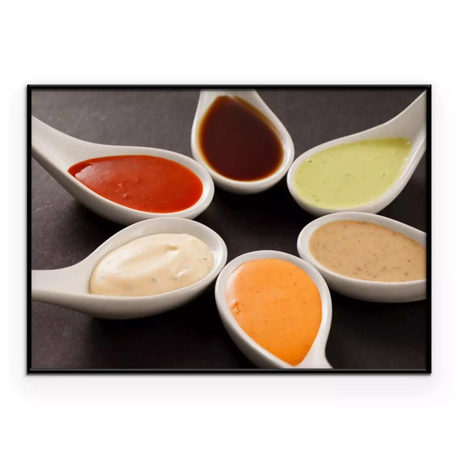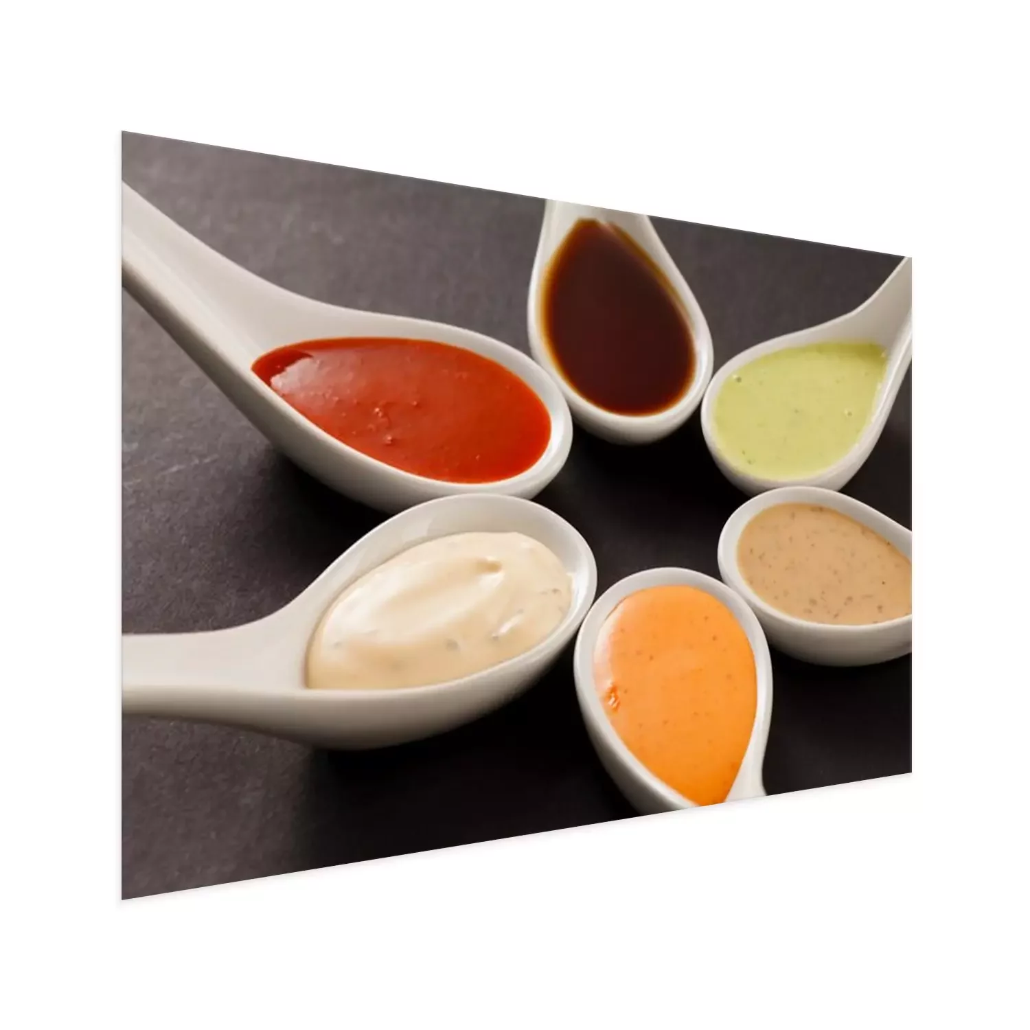Poster: Saucen auf weißen Keramiklöffeln