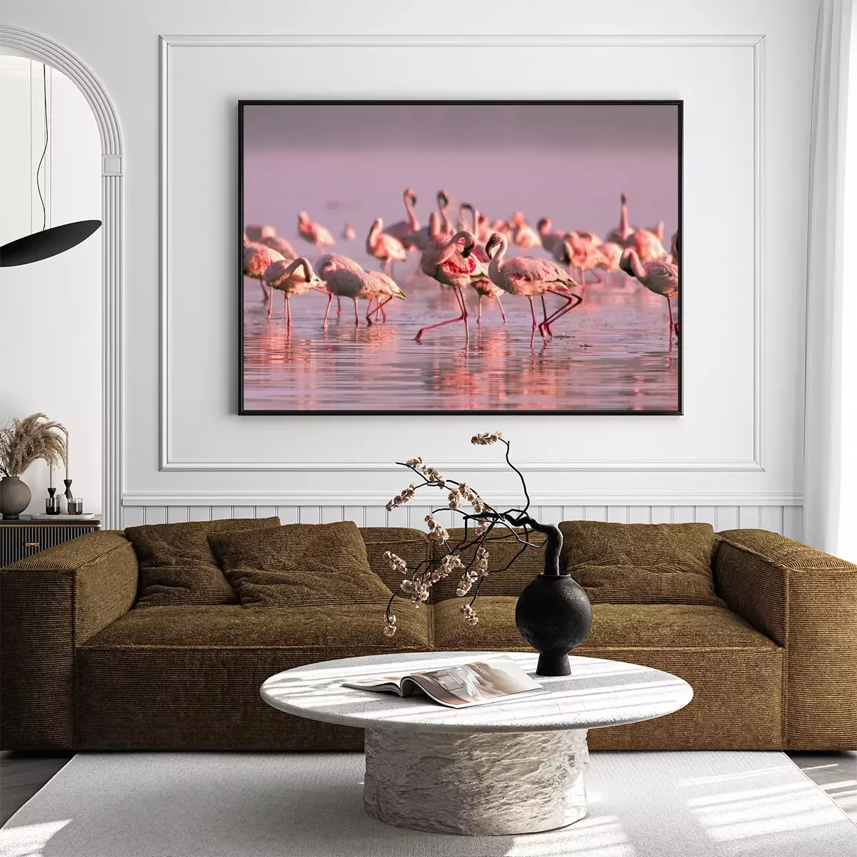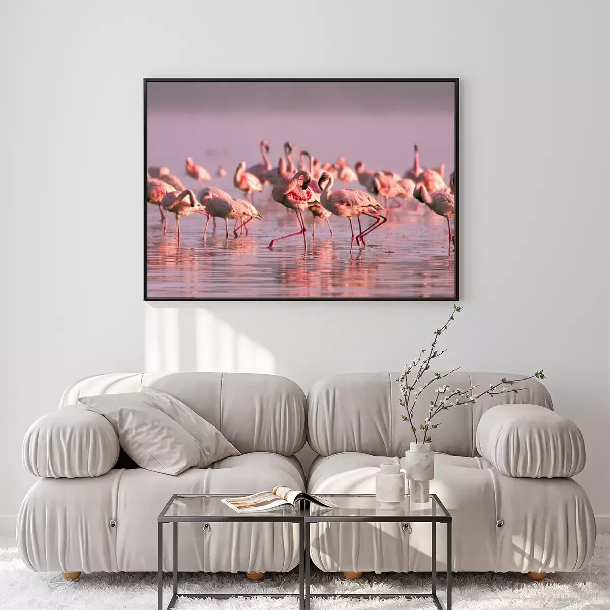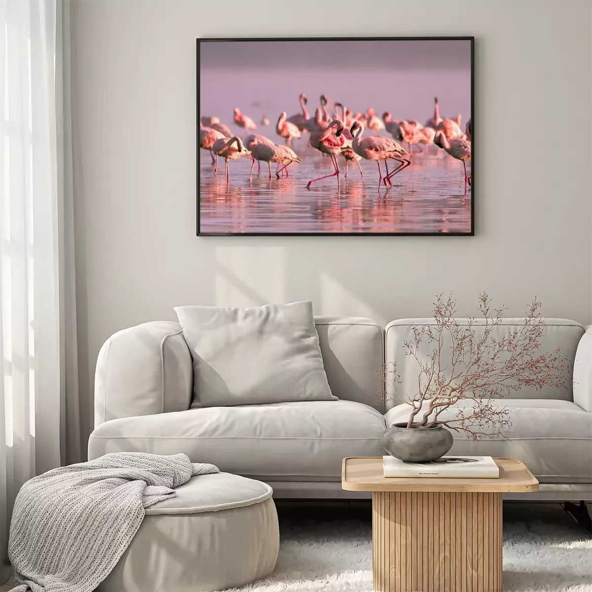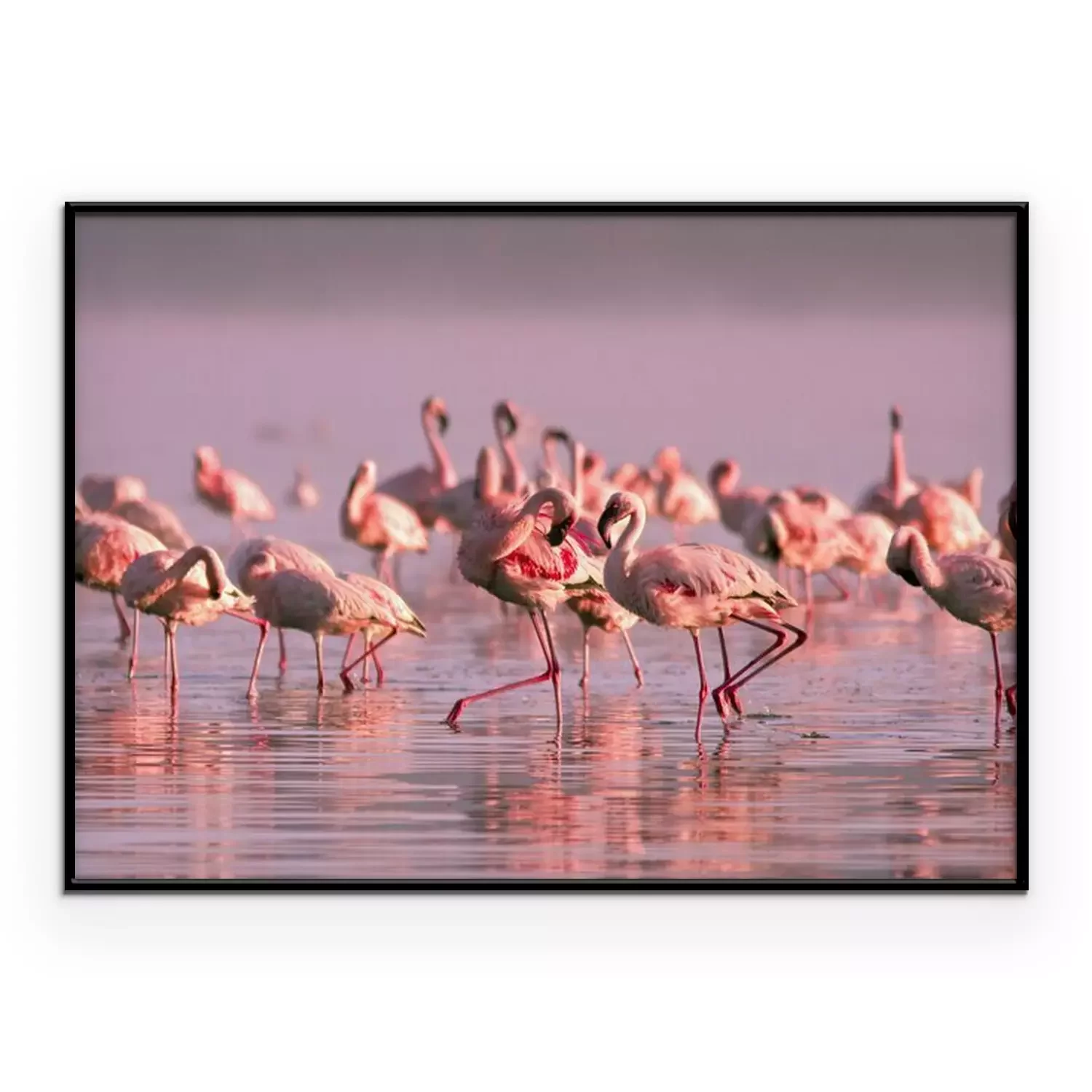 Poster: Schar von Flamingos bei Sonnenuntergang