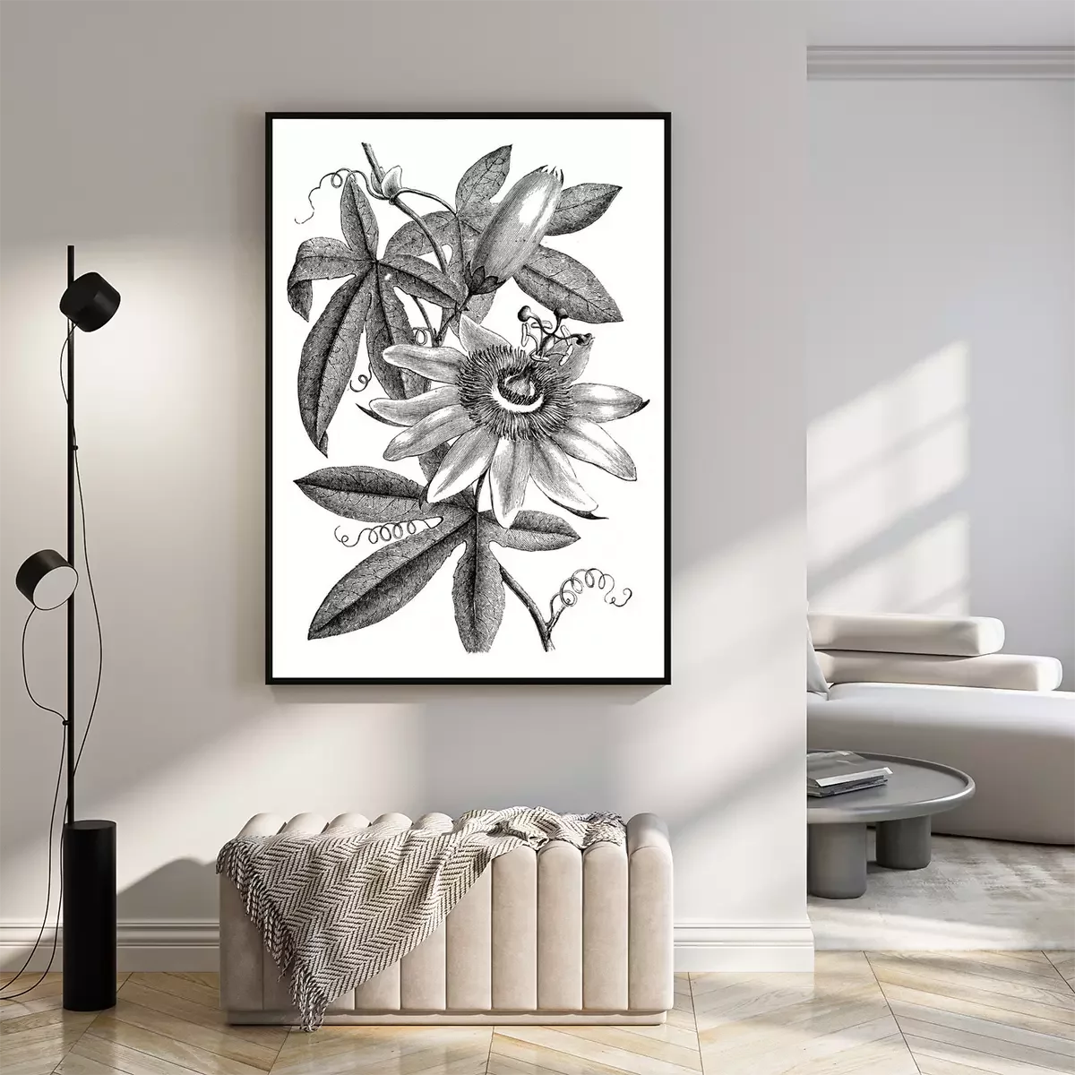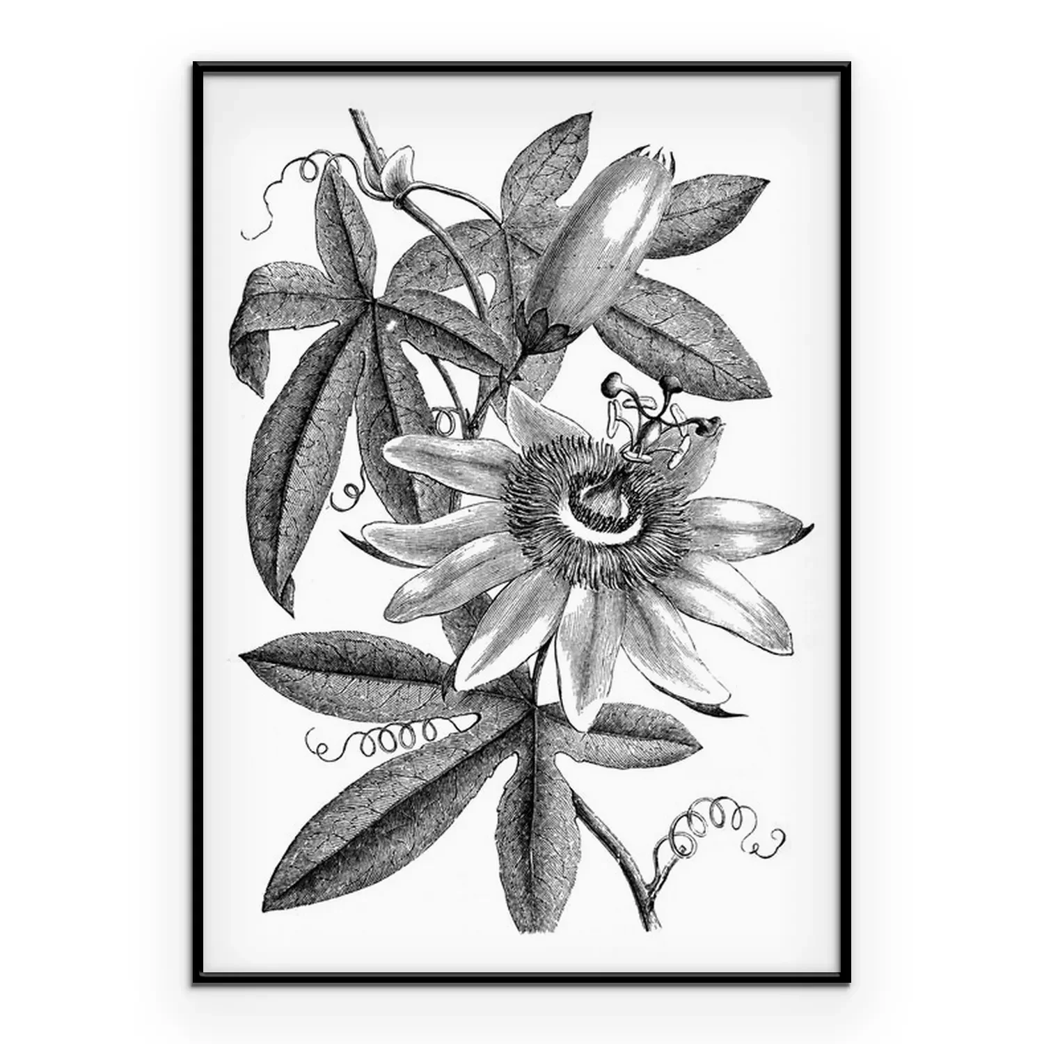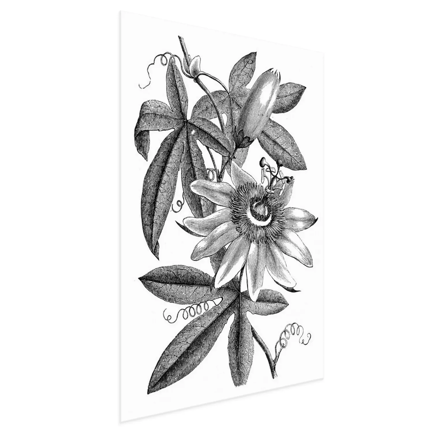 Poster: Schattierte Abbildung einer Passionsblume und Blätter