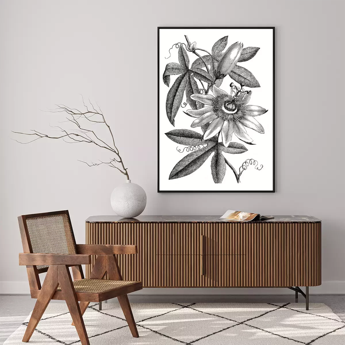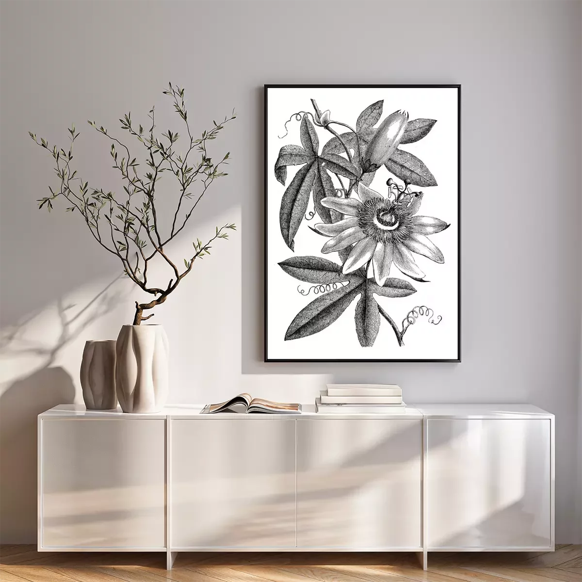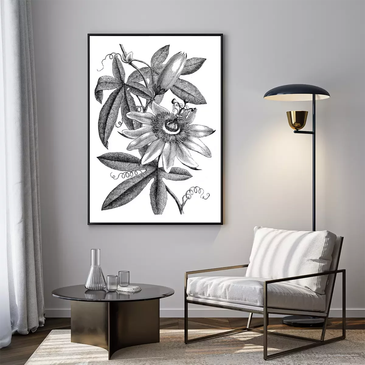 Poster: Schattierte Abbildung einer Passionsblume und Blätter