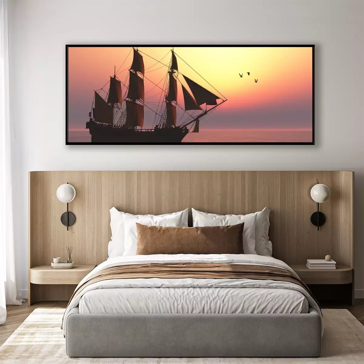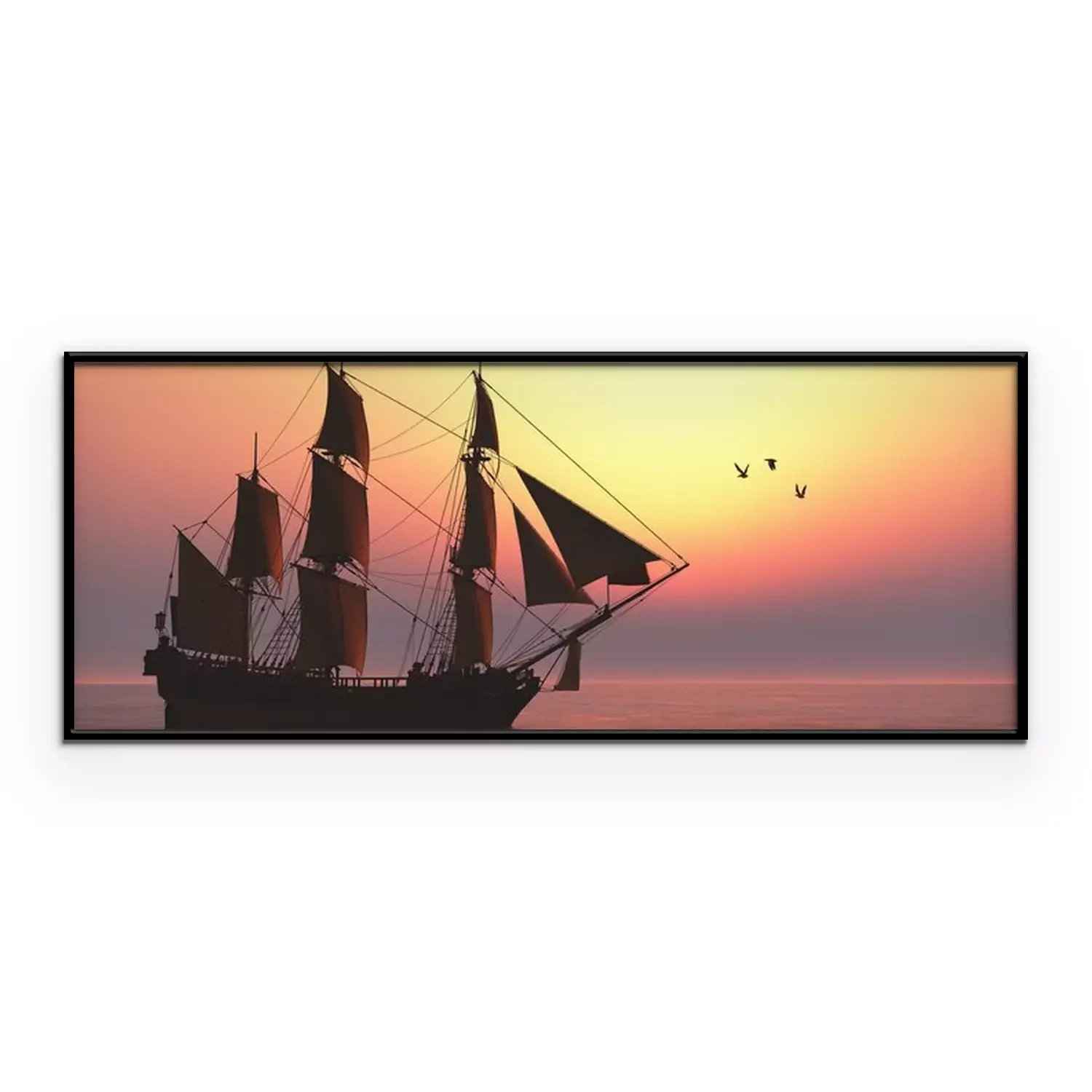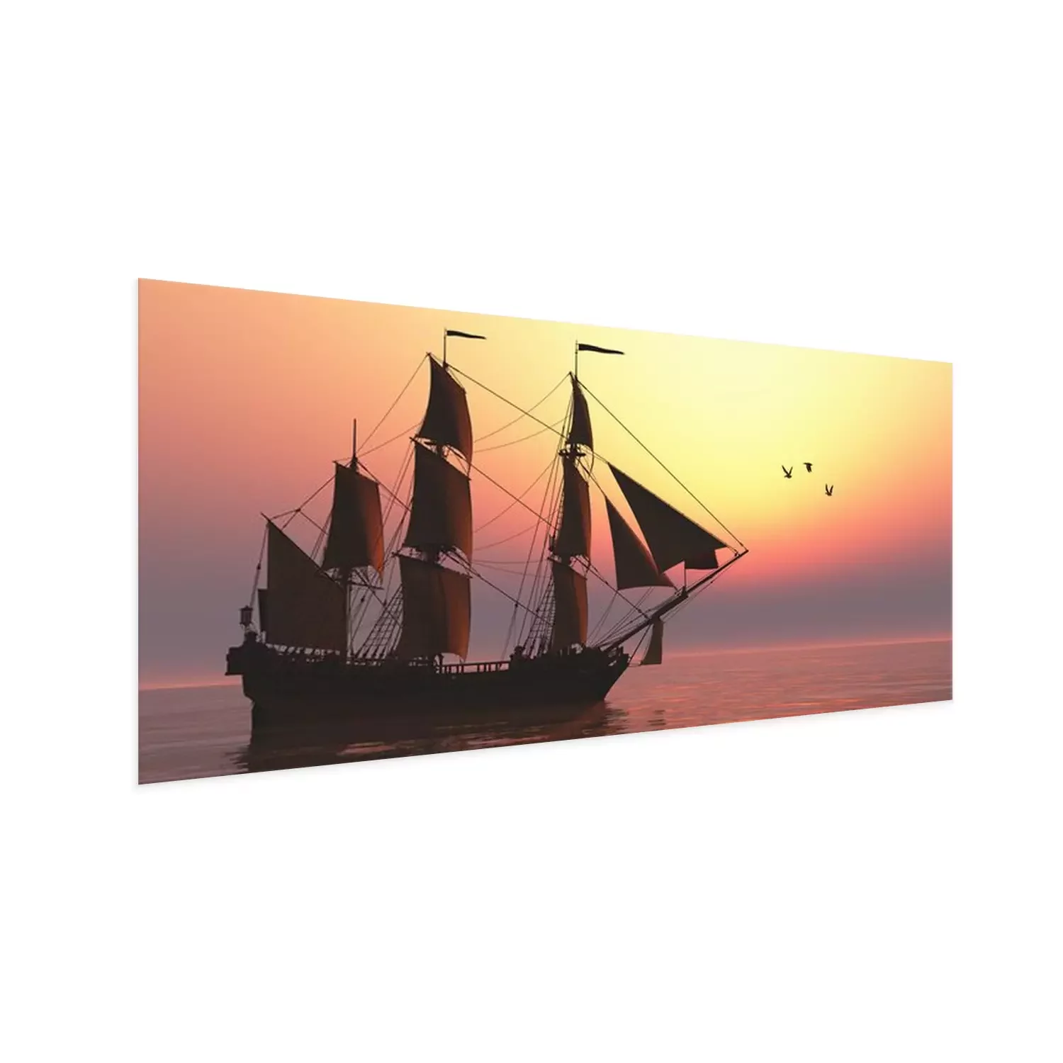 Poster: Schiff mit Segeln und Sonnenuntergang