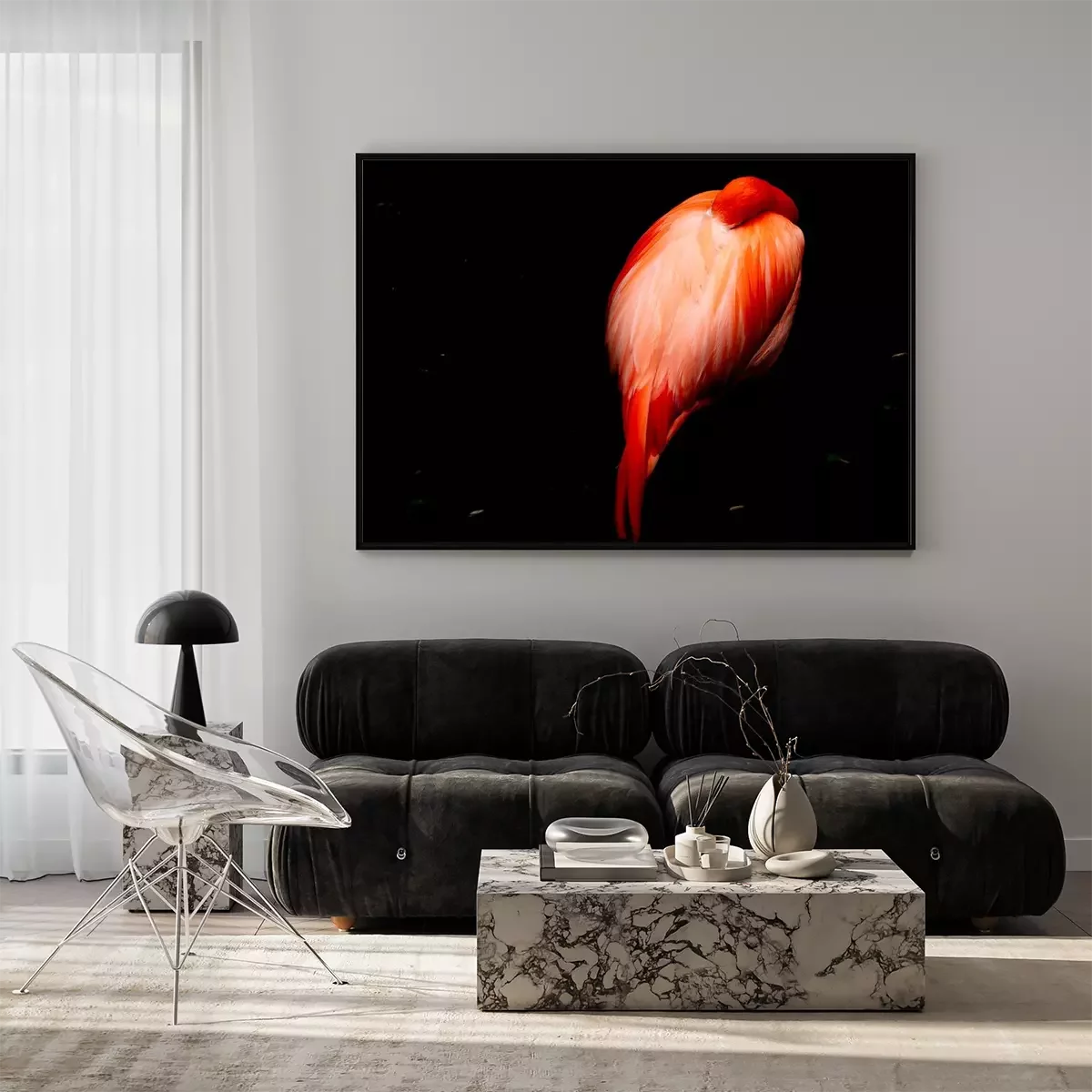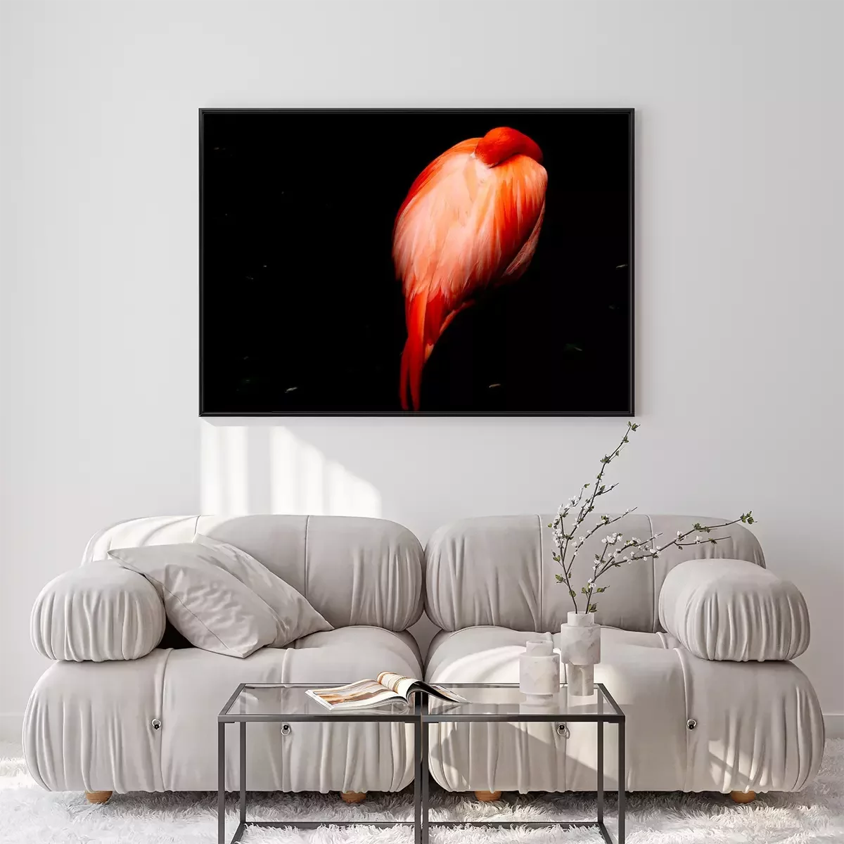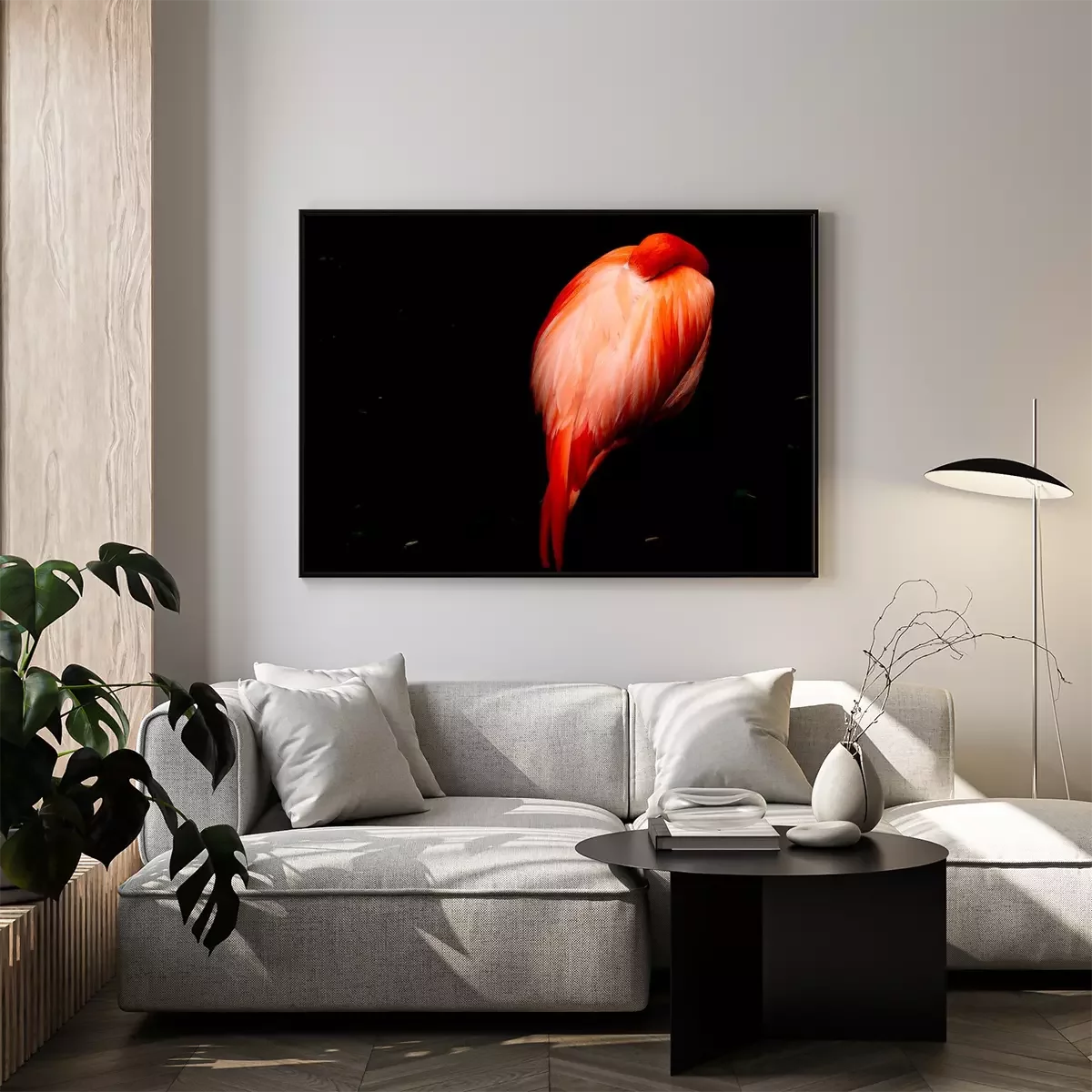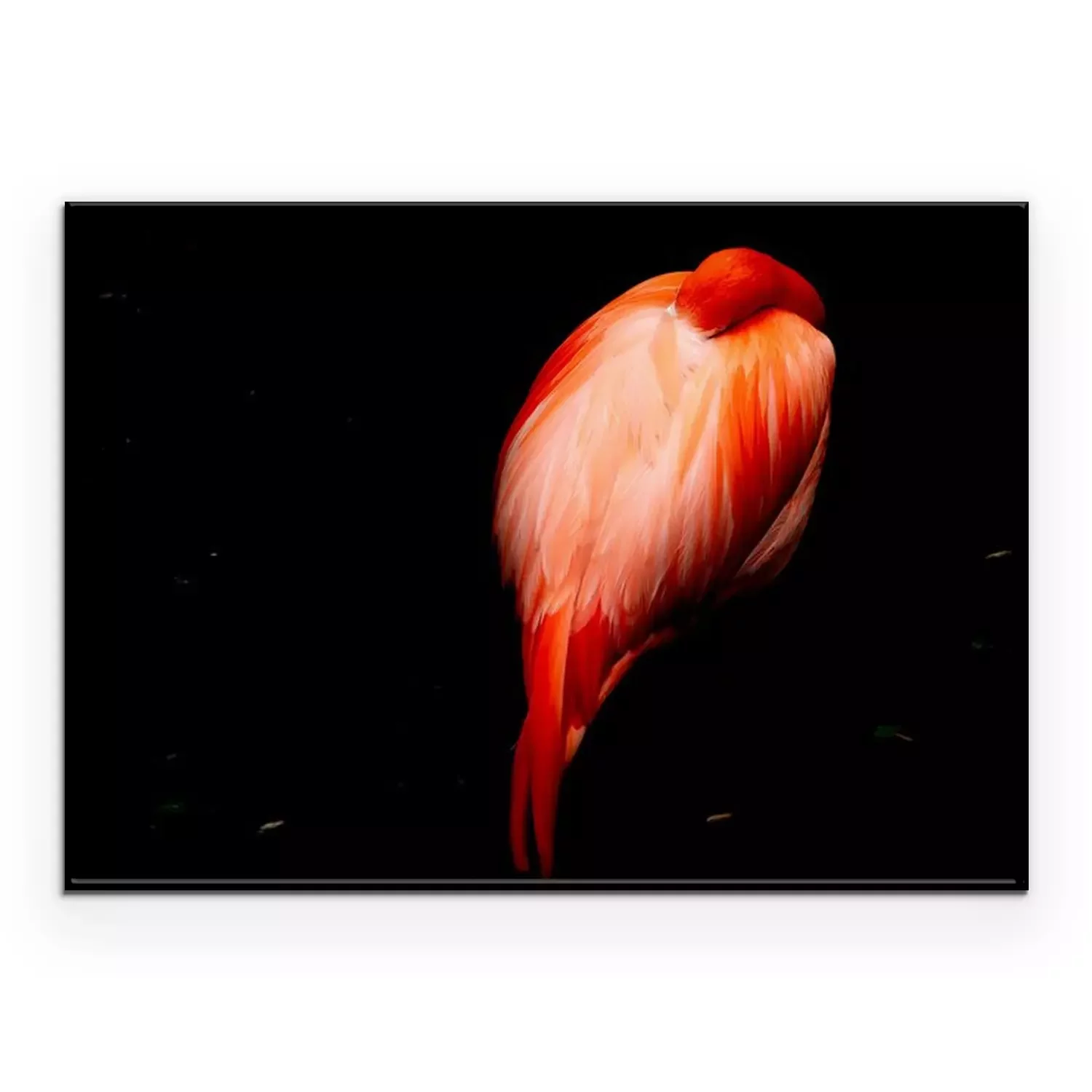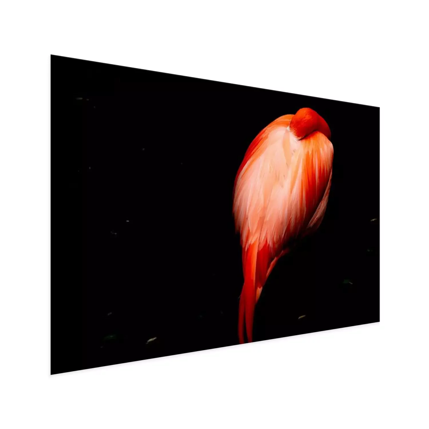 Poster: Schlafender Flamingo auf dunklem Hintergrund