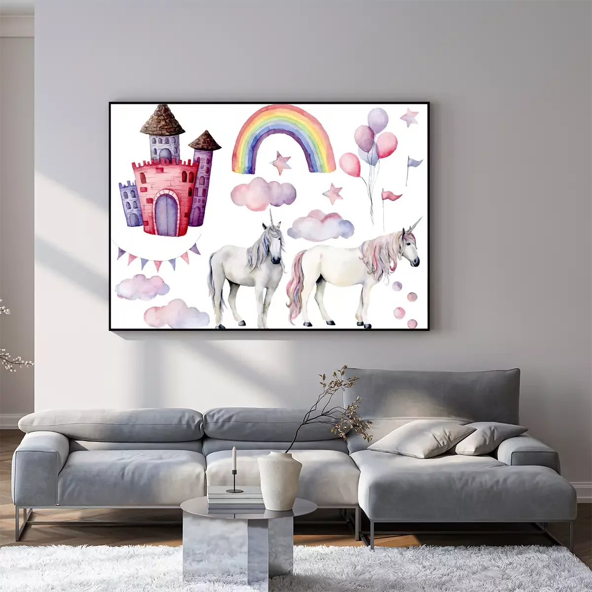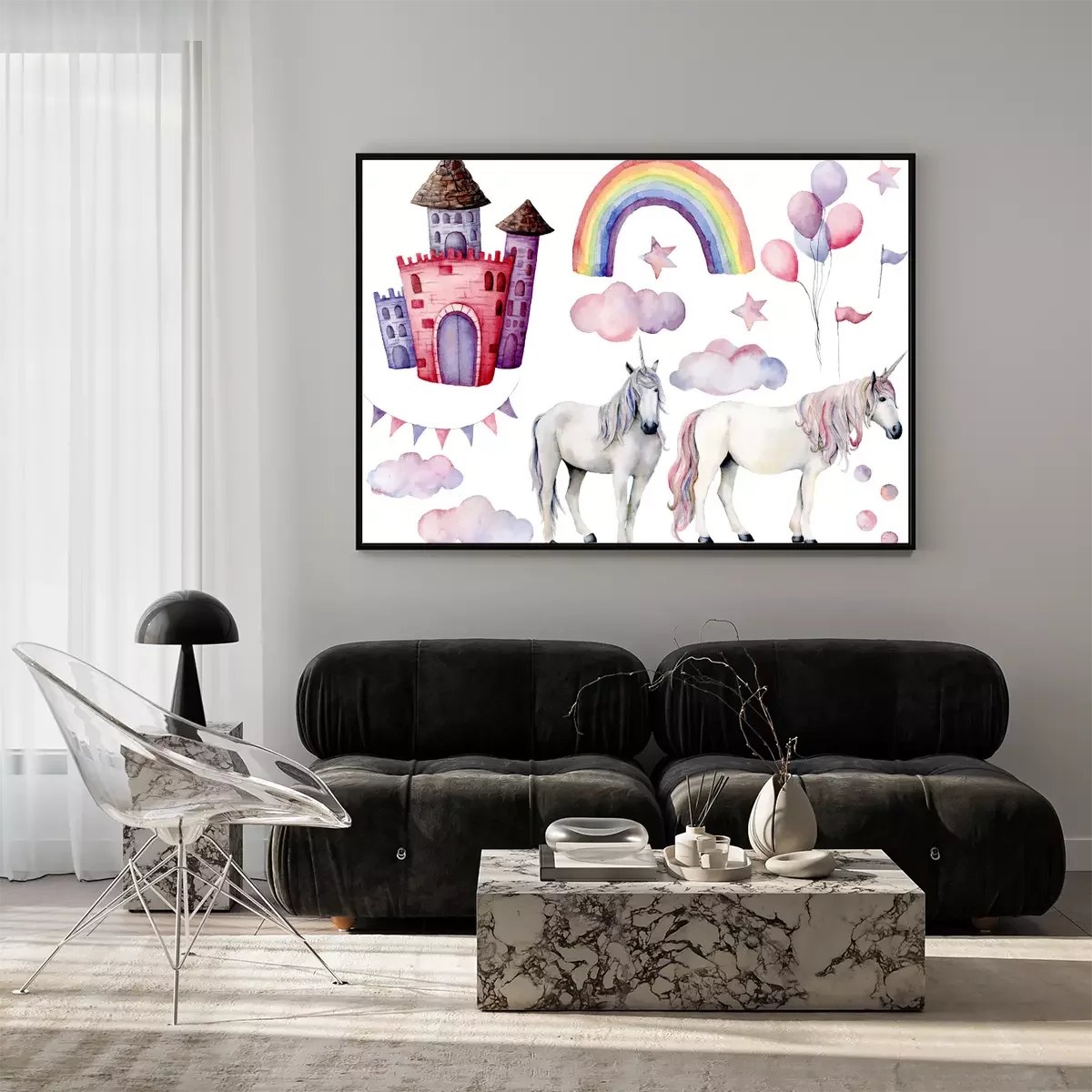 Poster: Schloss, Einhörner und pastellfarbene Wolken