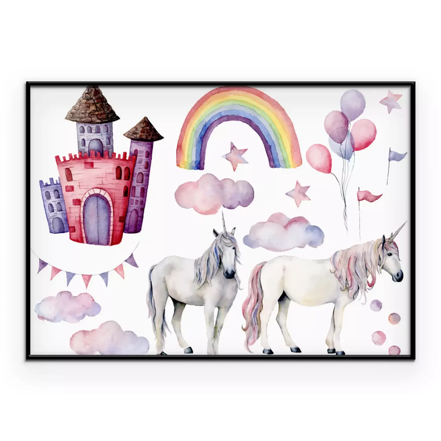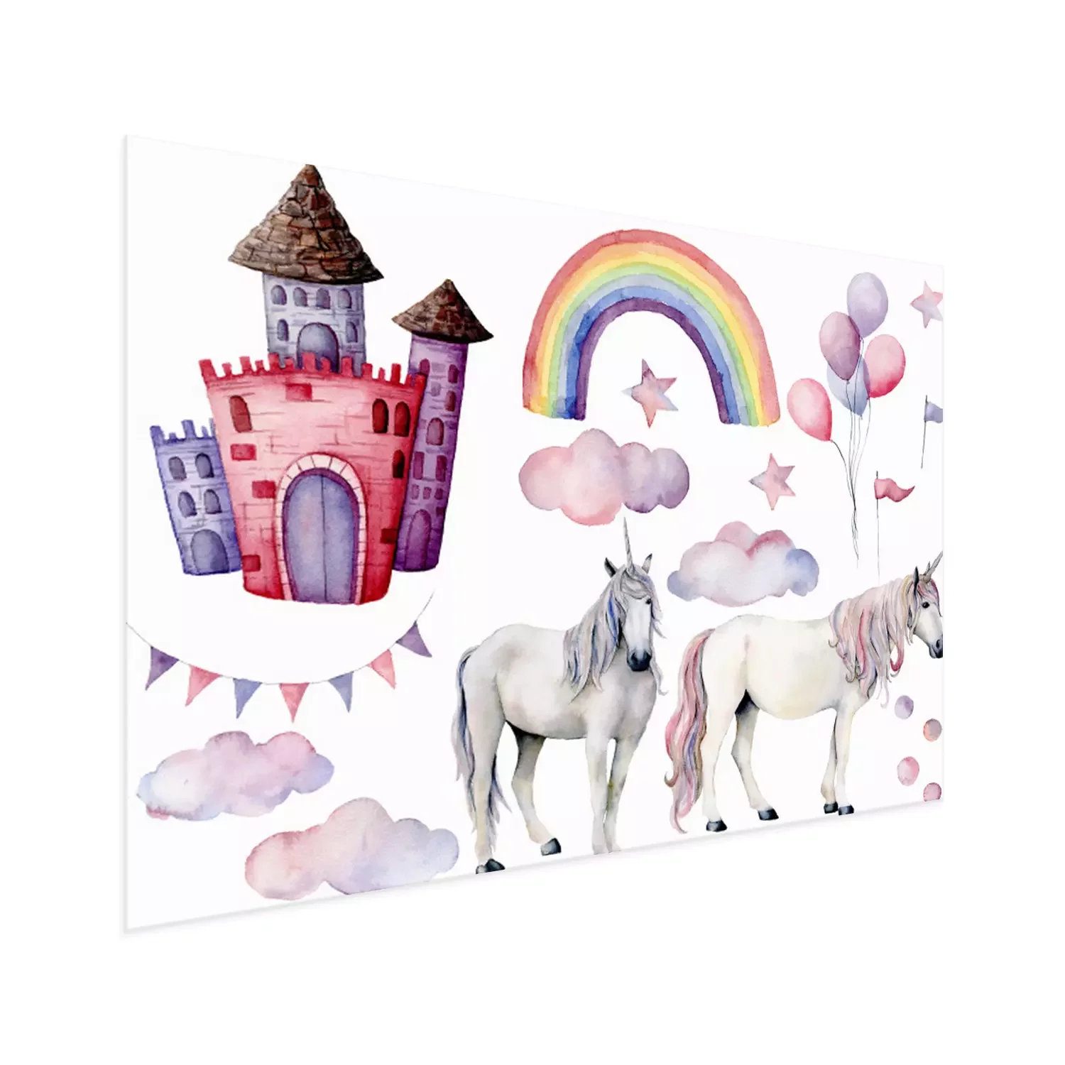 Poster Schloss, Einhörner und pastellfarbene Wolken