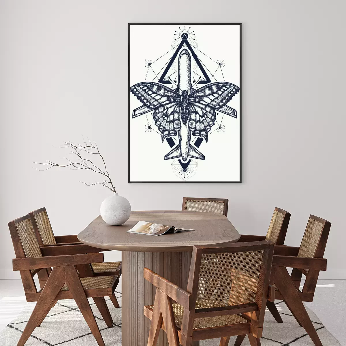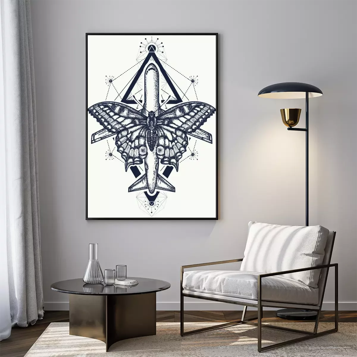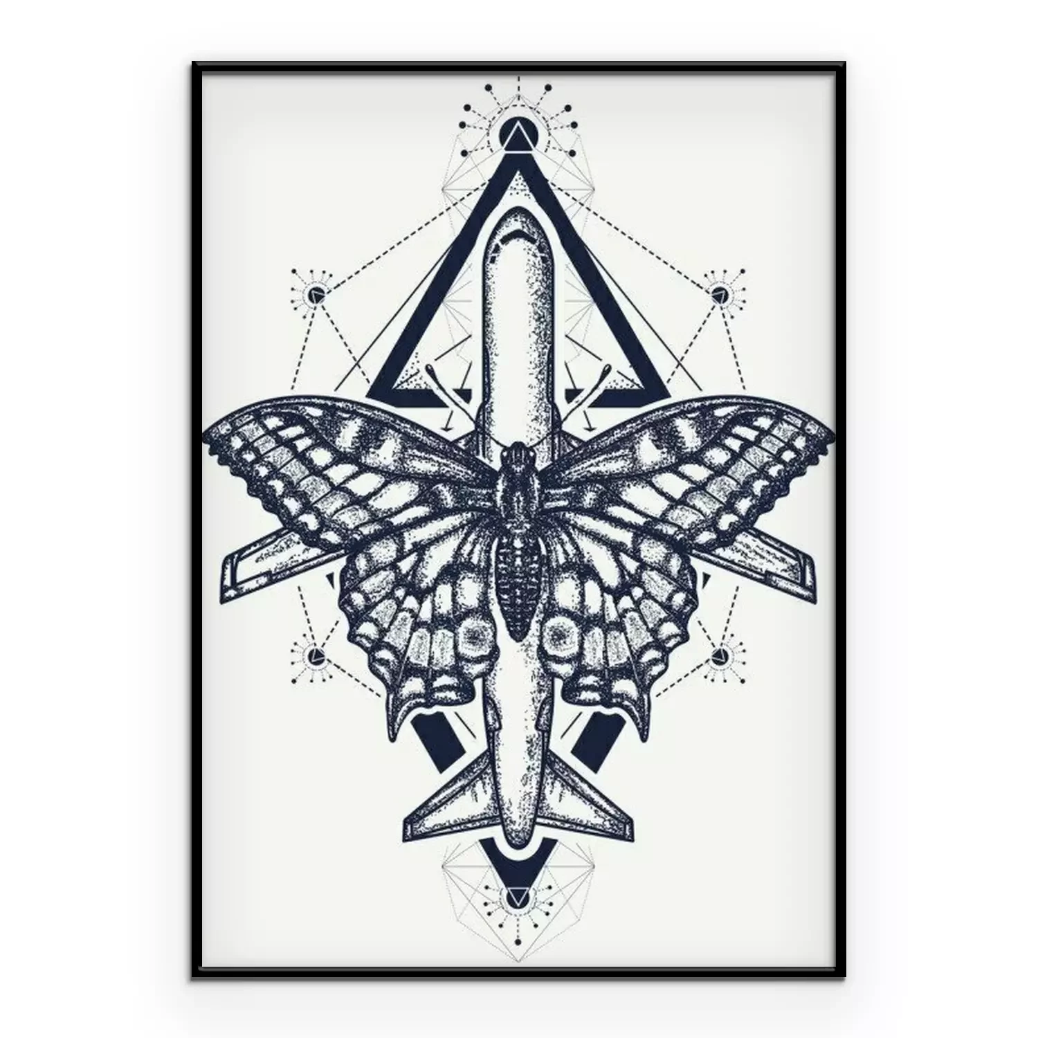 Poster Schmetterling und Flugzeug Tattoo, Symbol für Tourismus, Reisen, Traum, Urlaub, Freiheit, Flug, Abenteuer, Motivationen, Lebensstil. Schöner Schmetterling und Start-Flugzeug T-Shirt Design