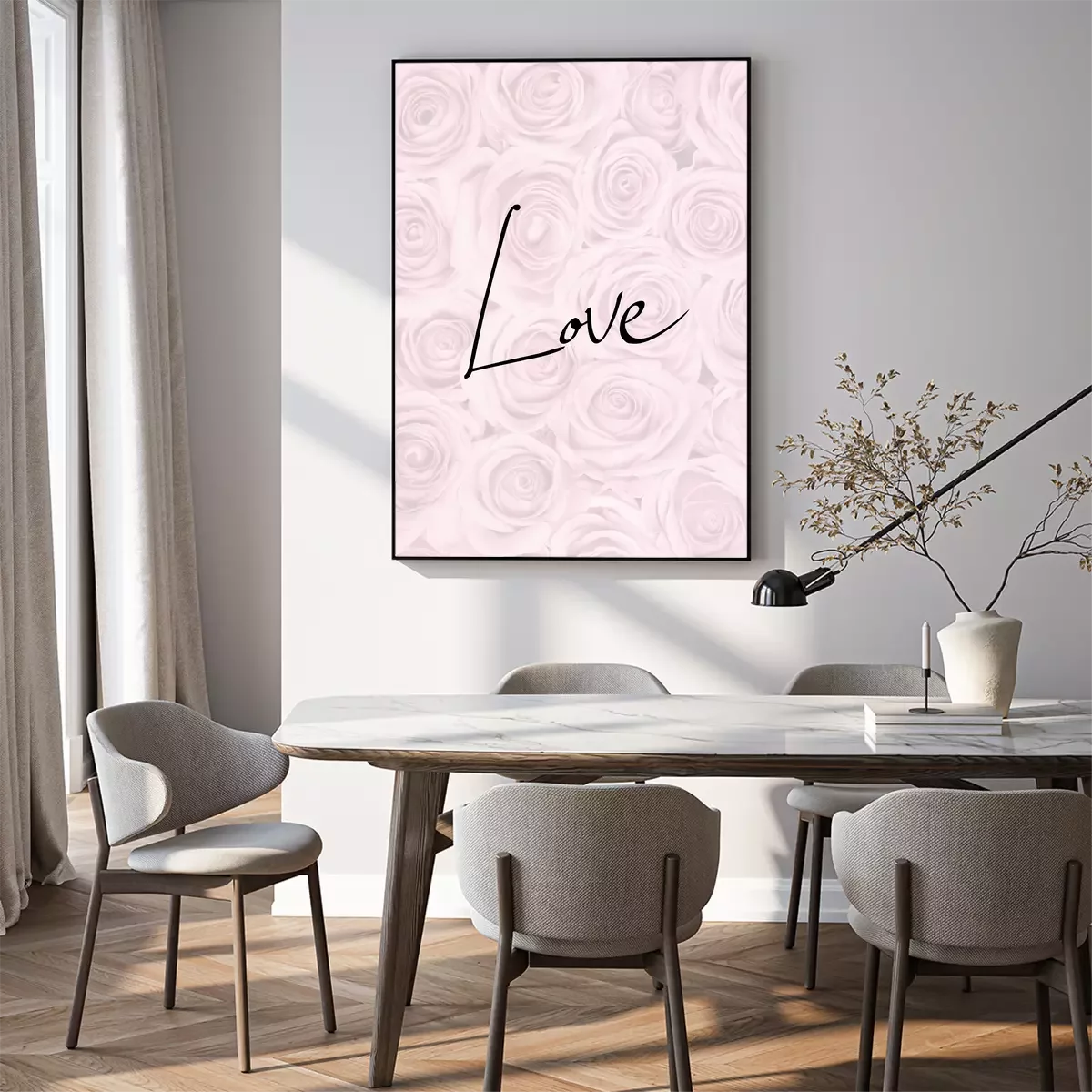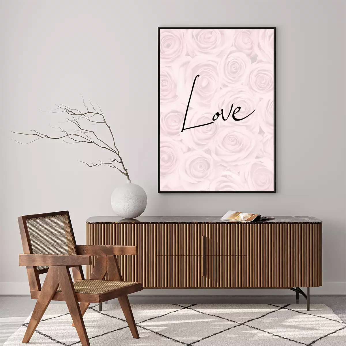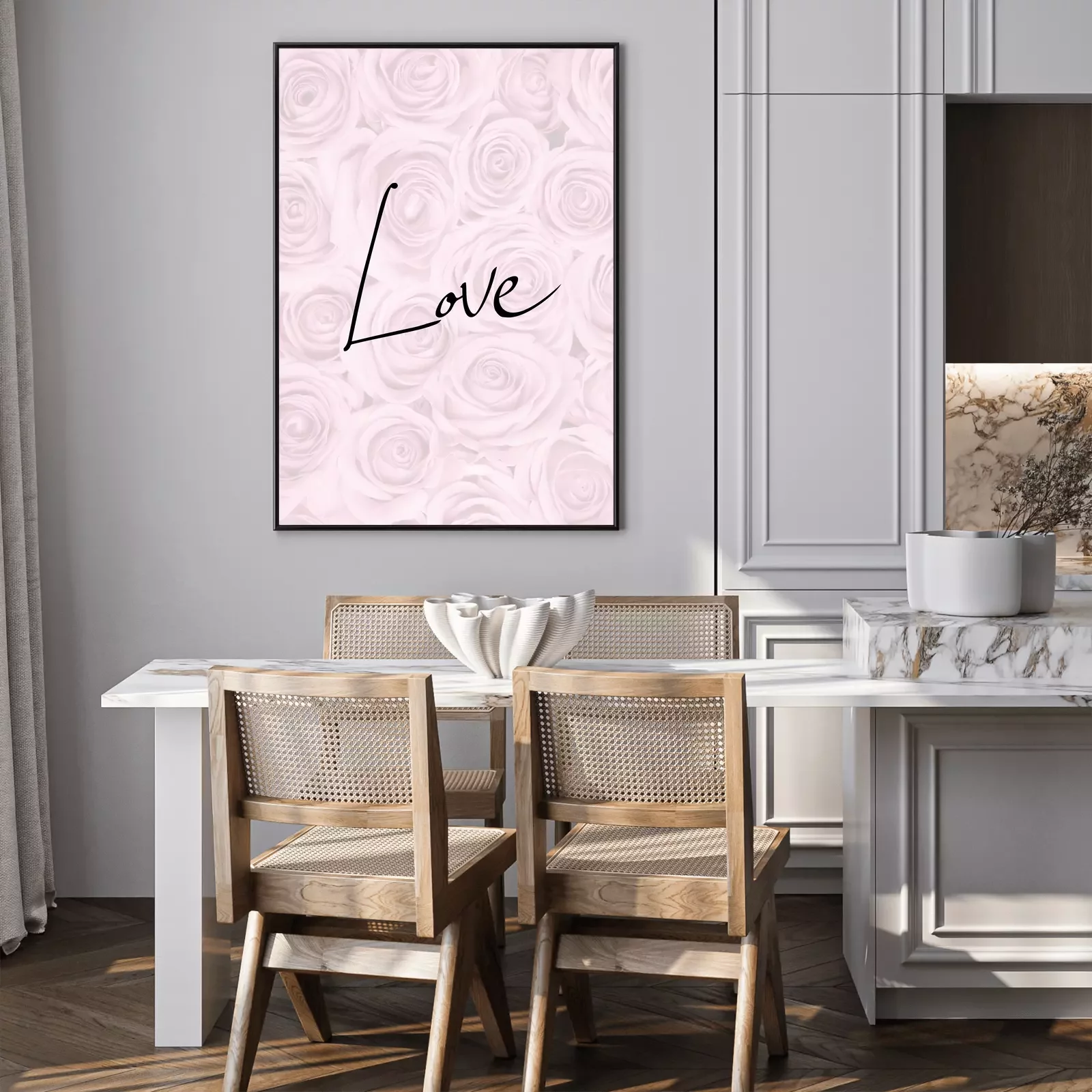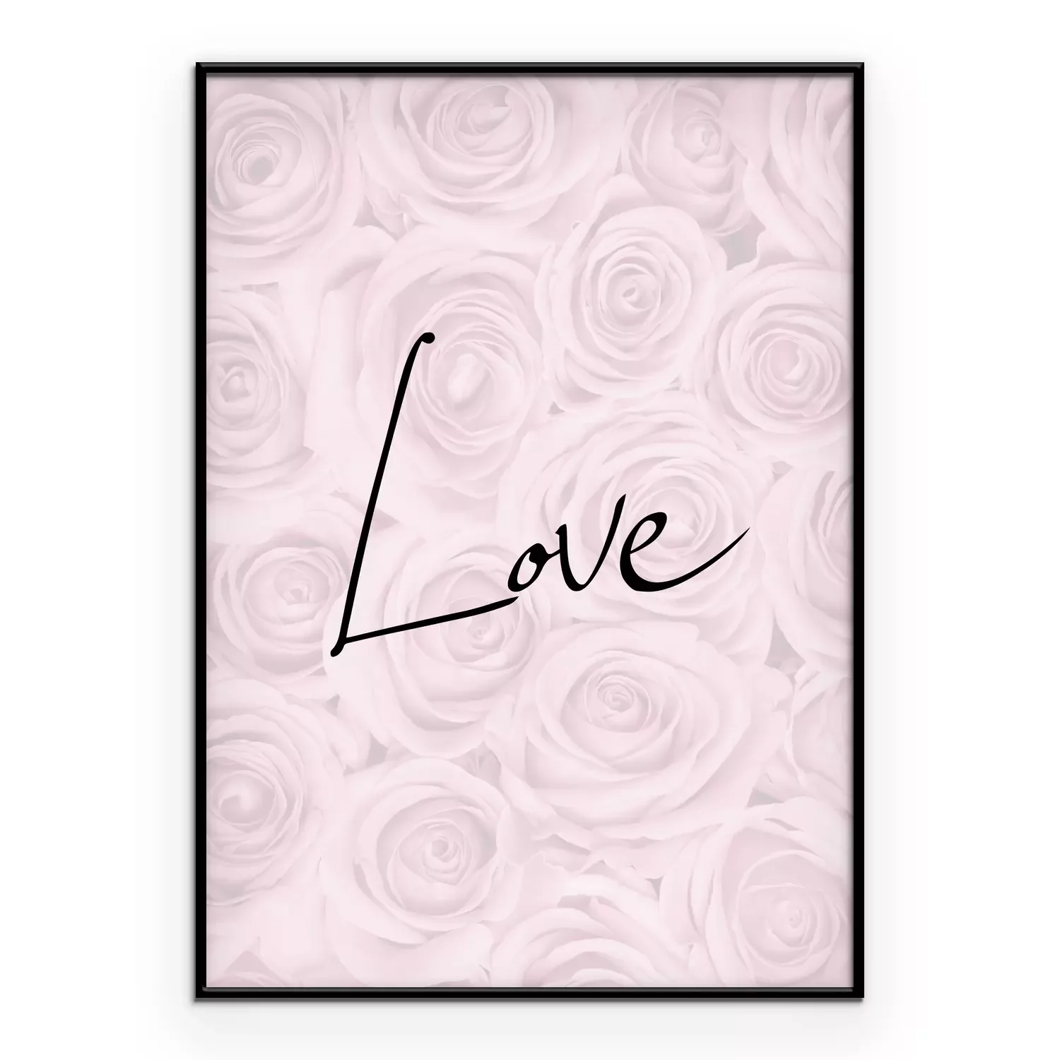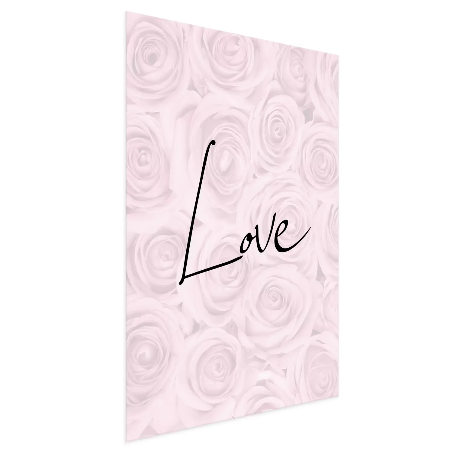 Poster: Schriftzug LOVE vor einem Hintergrund aus Rosen