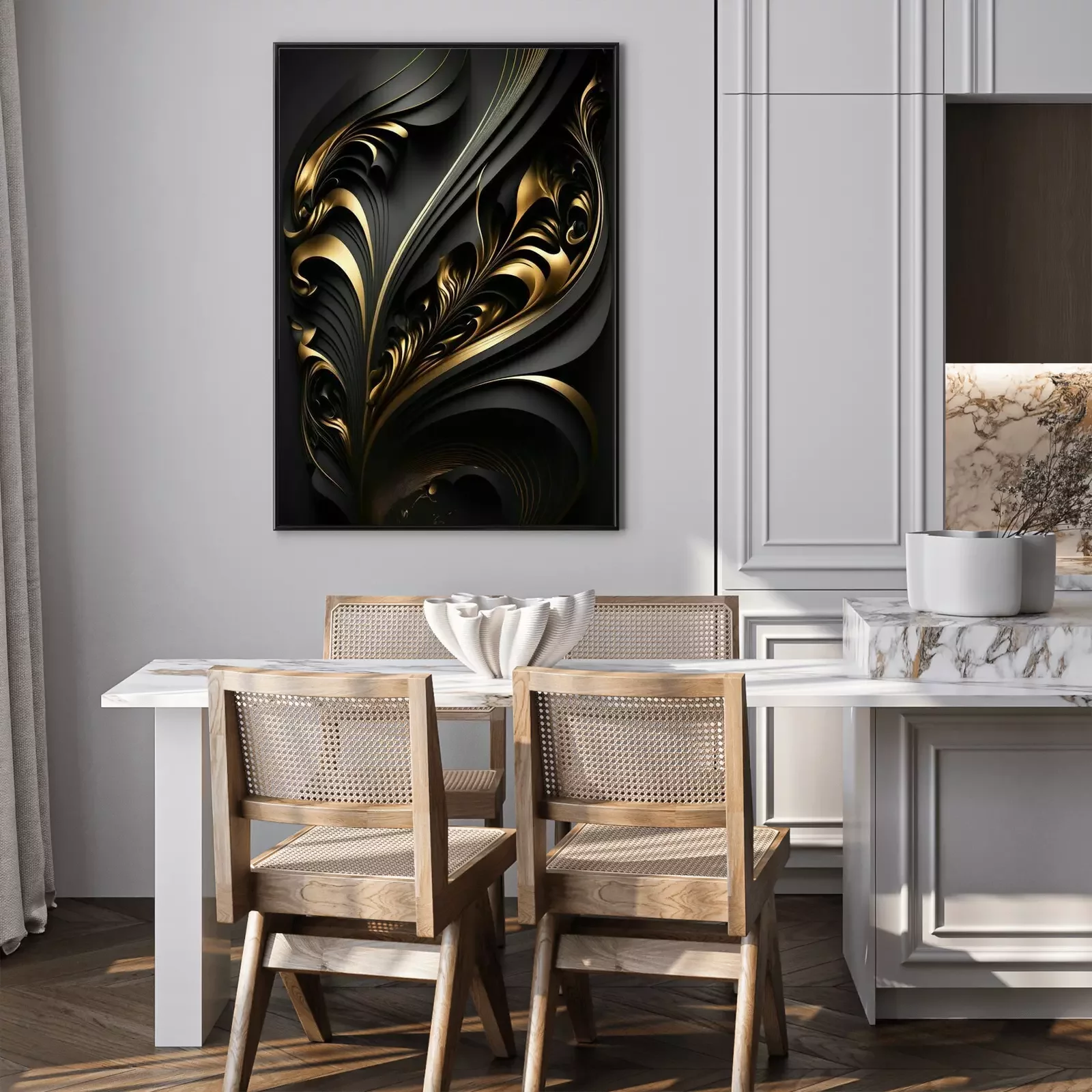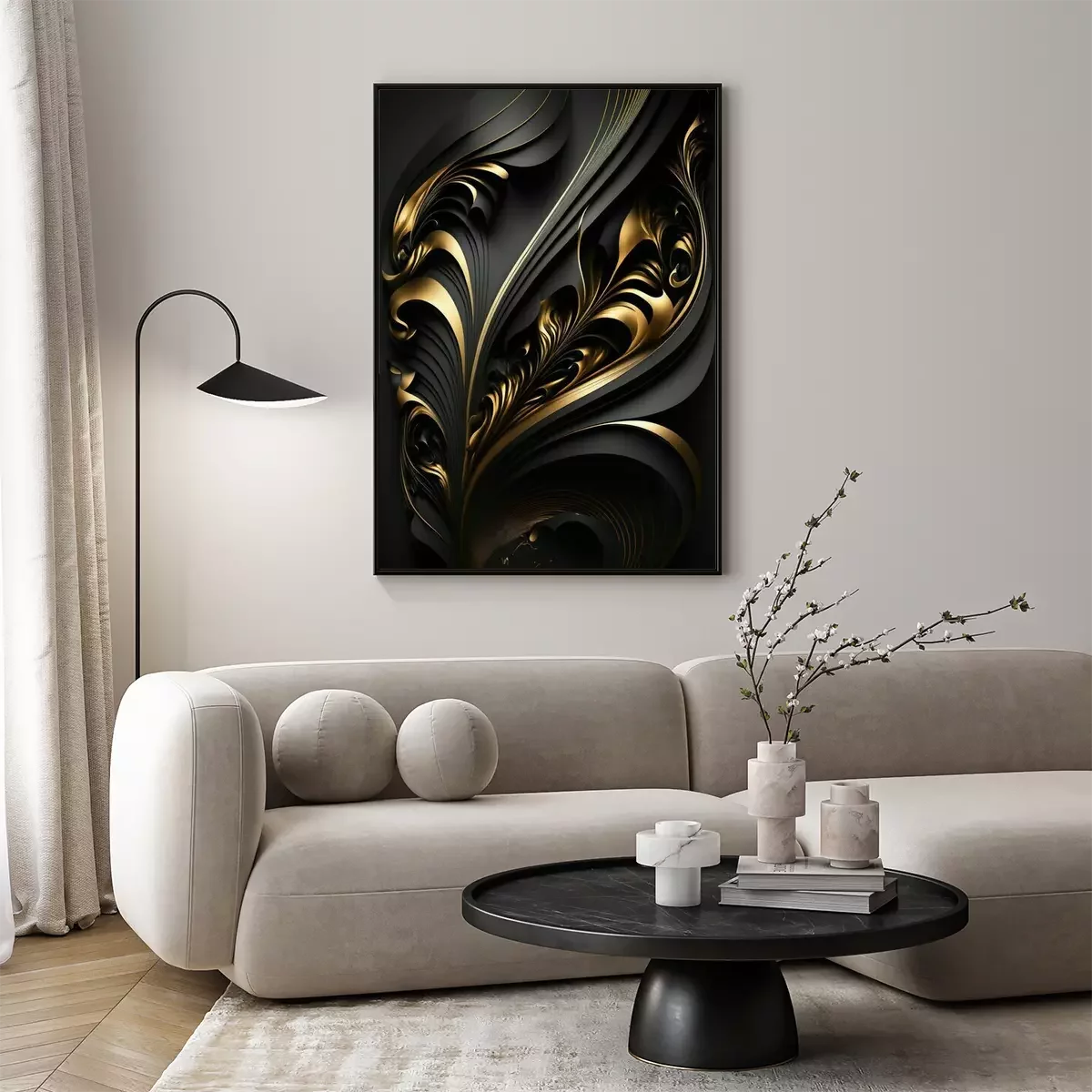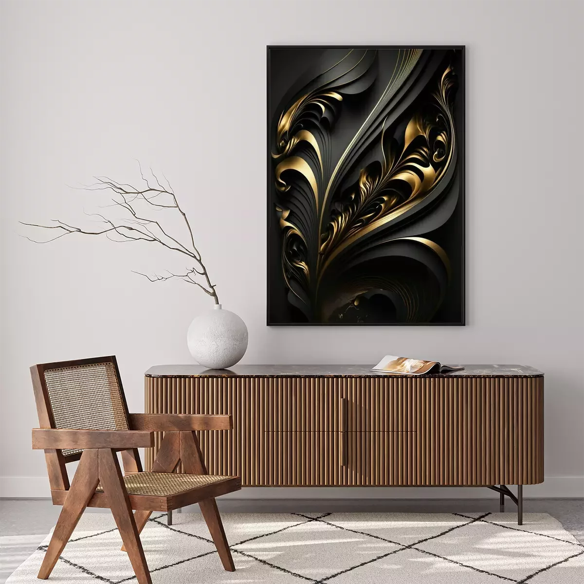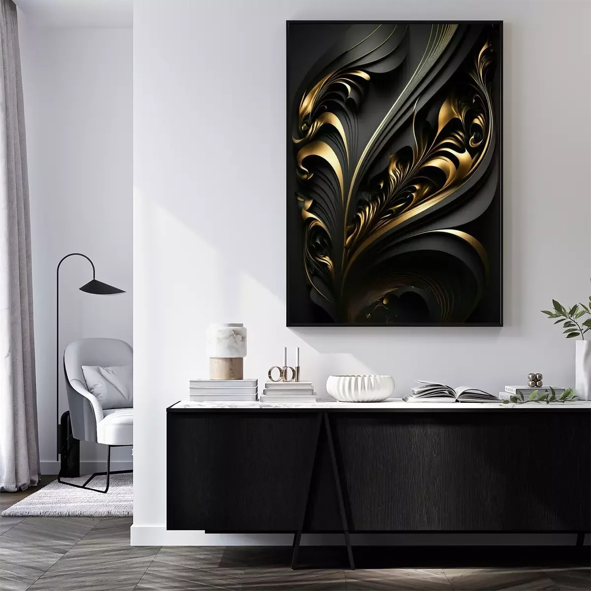Poster: Schwarz-goldene 3D-Abstraktion